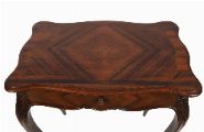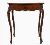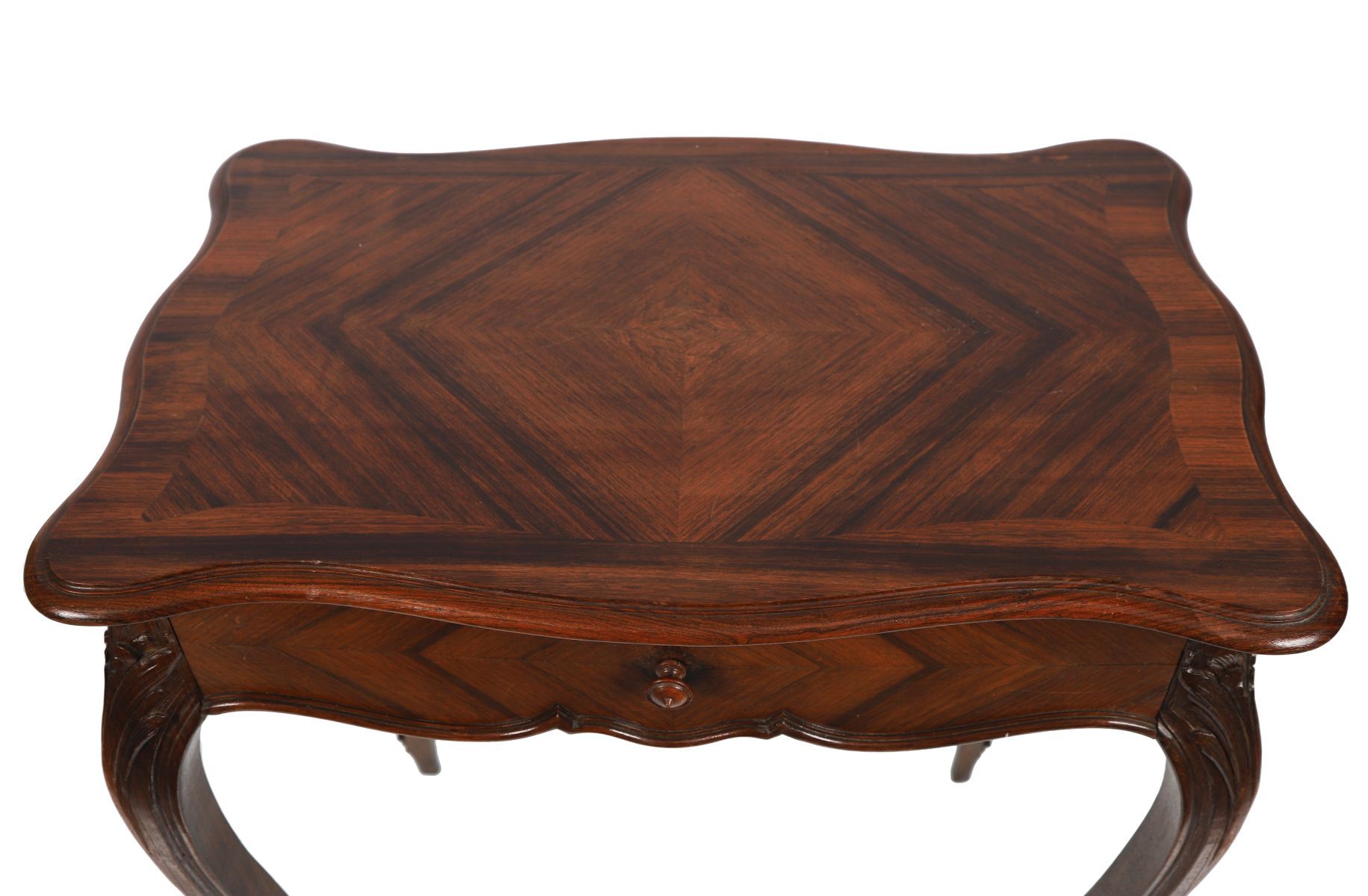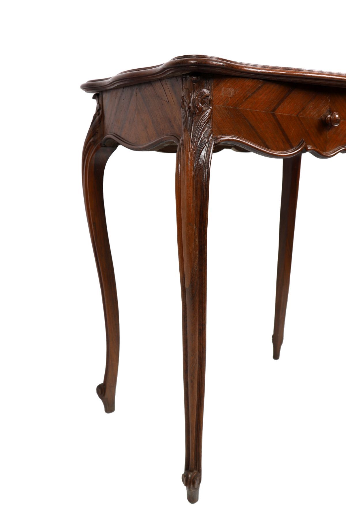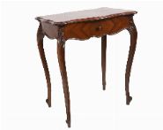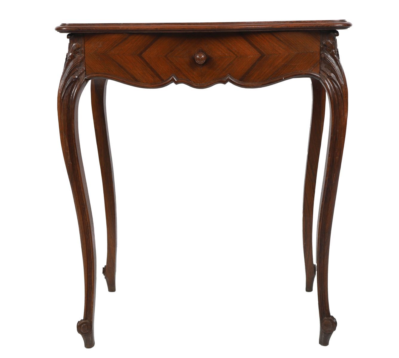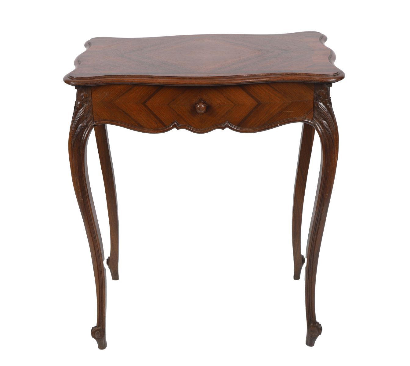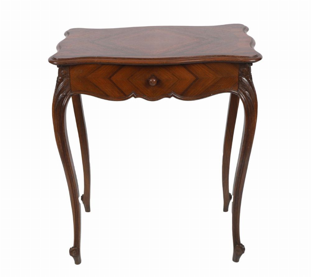 The rectangular serpentine-shaped top sits above a frieze drawer, raised on cabriole legs terminating on scroll feet.