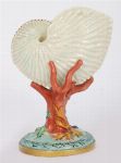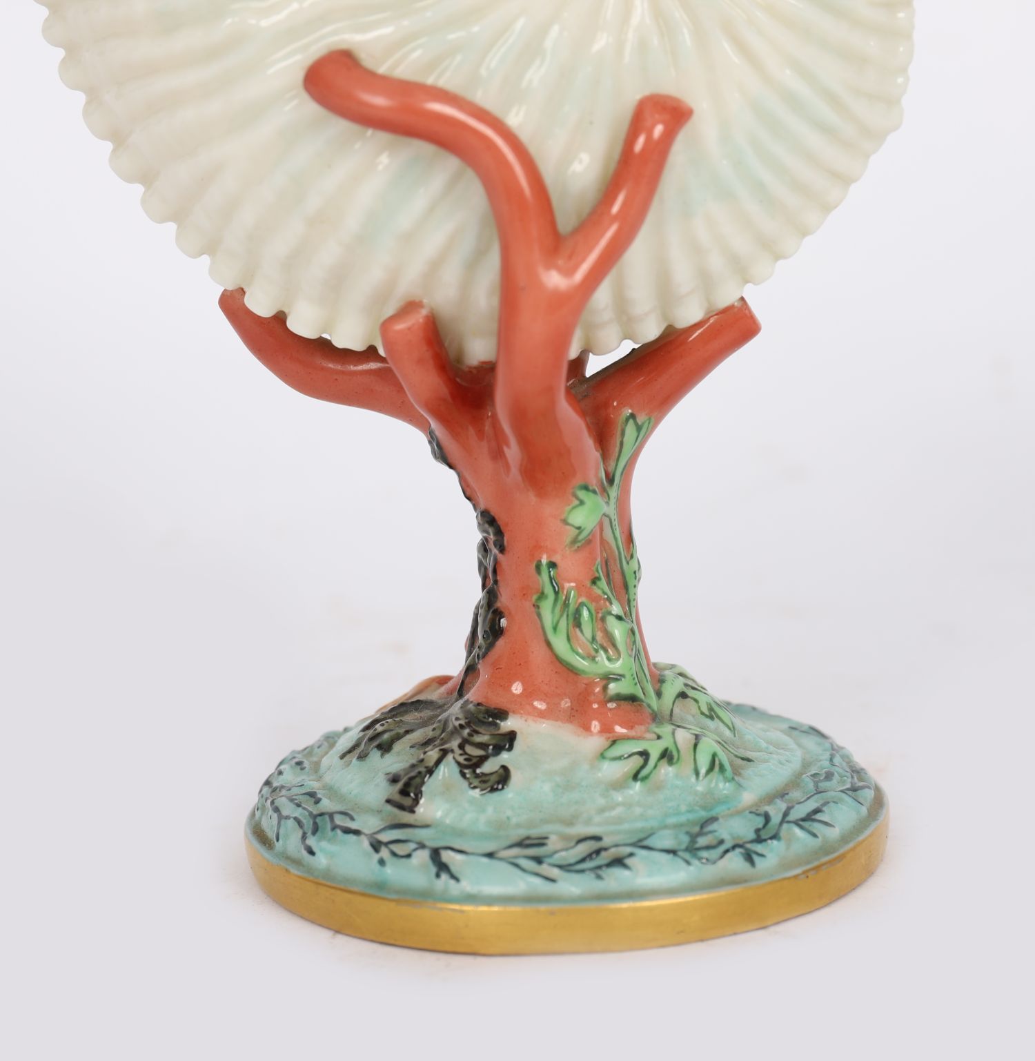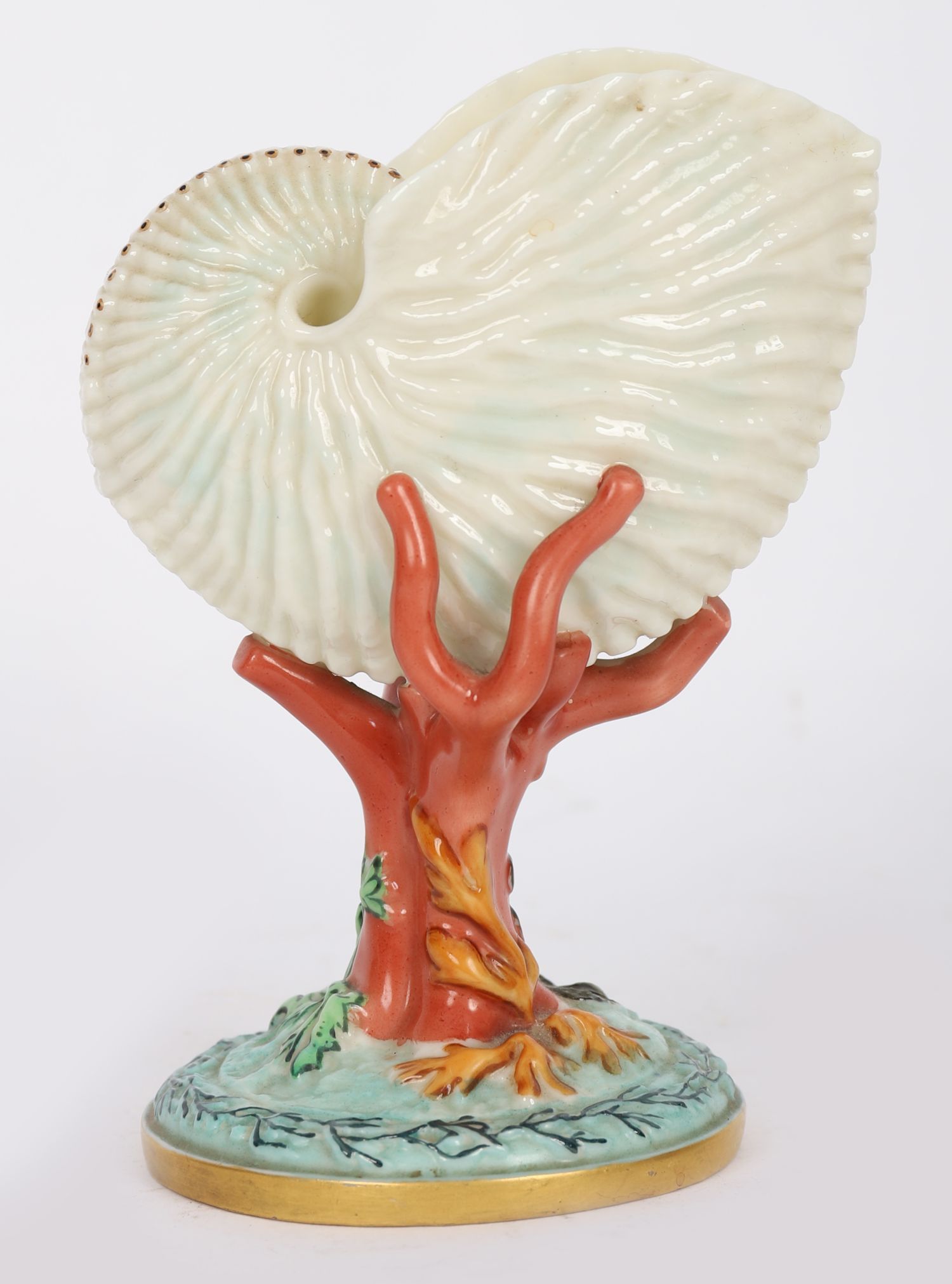 A 19th century Royal Worcester porcelain vase, modelled as a nautilus shell supported by a branch of coral, set on a circular base with turquoise and gilt highlights. Finely moulded with naturalistic shell ribbing and enamel decoration.