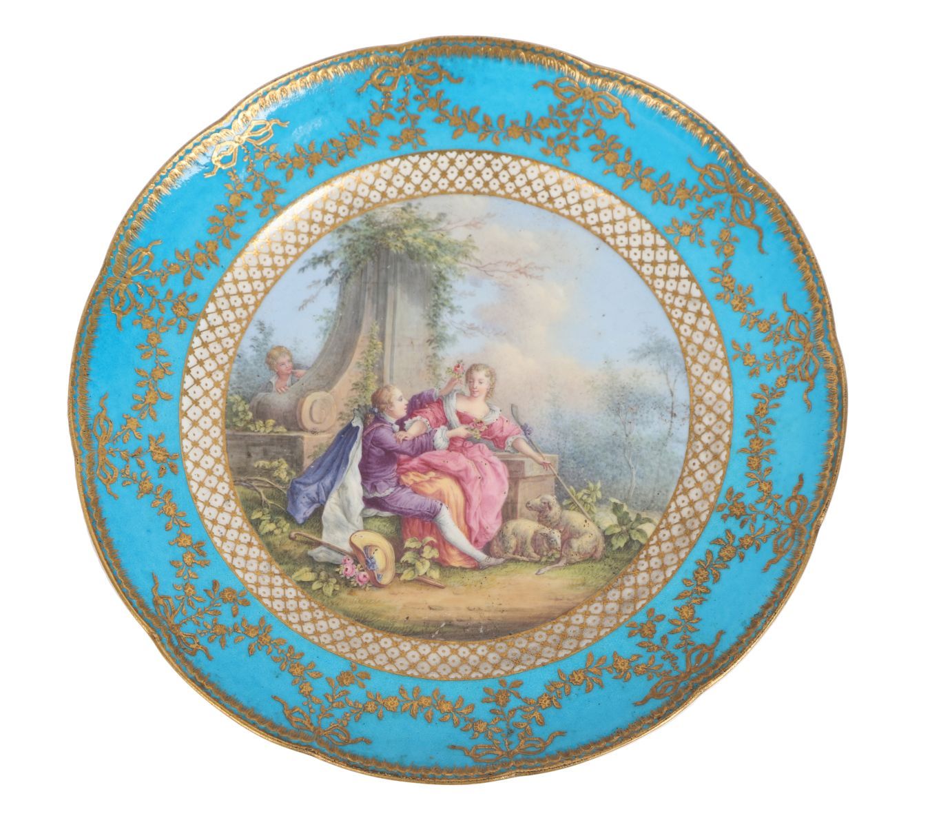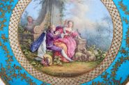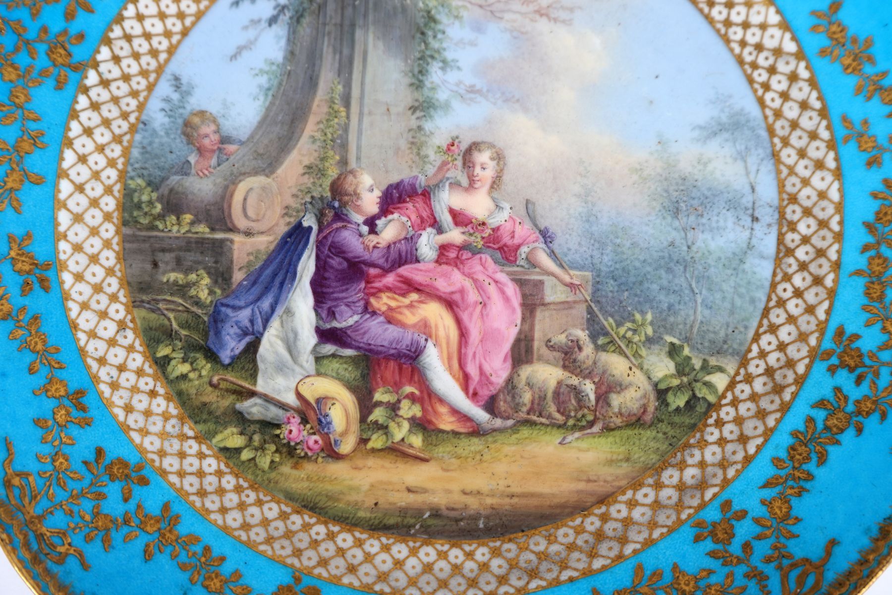 19th-century Sèvres porcelain dish, centrally painted with a romantic figural scene, within a turquoise and gilt border.