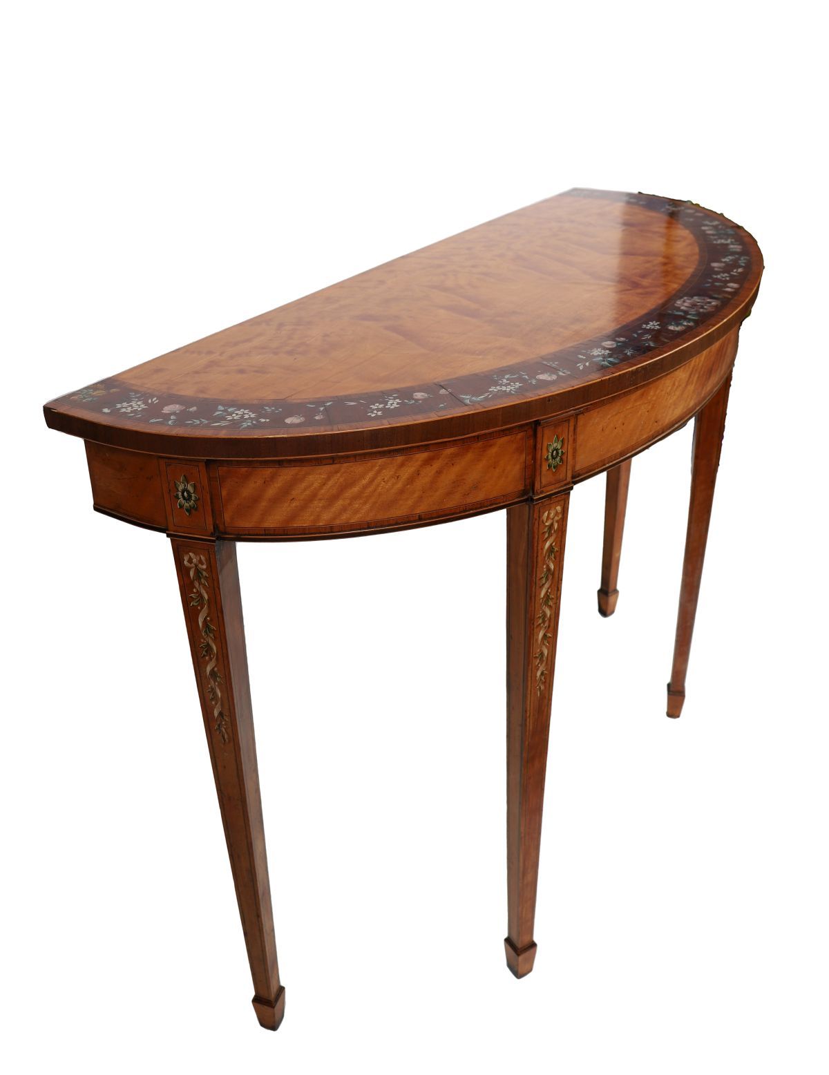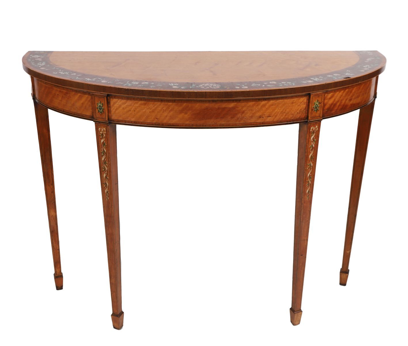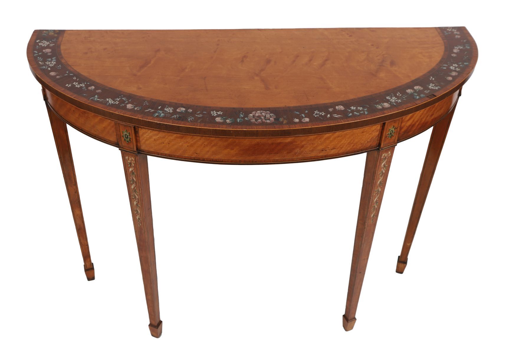 19th-century satinwood side table with shaped top above a frieze incorporating painted floral panels, raised on square tapering legs with painted decoration continuing to the uprights.