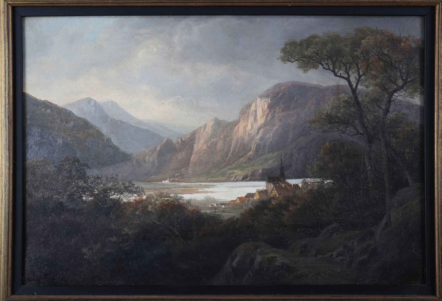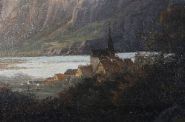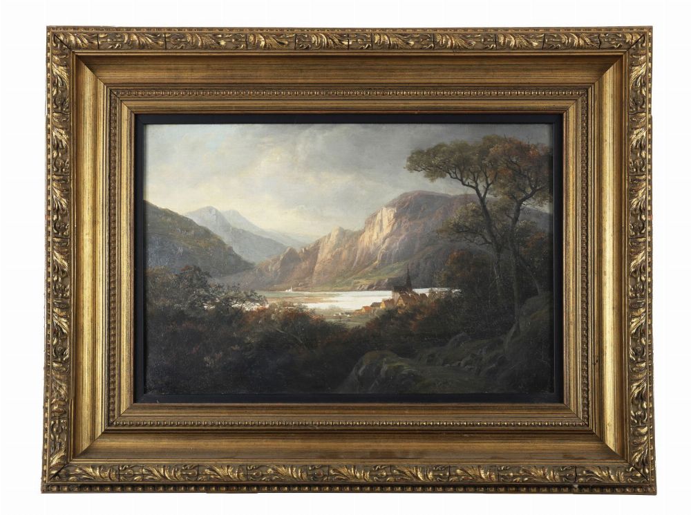 Atmospheric 19th-century oil painting depicting a tranquil fjord landscape with distant mountains, trees, and a small settlement by the water's edge. Executed in warm, naturalistic tones and framed in a gilt moulded frame.