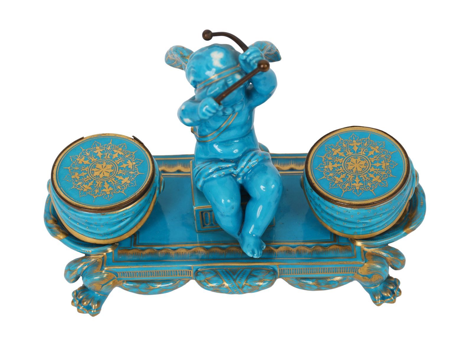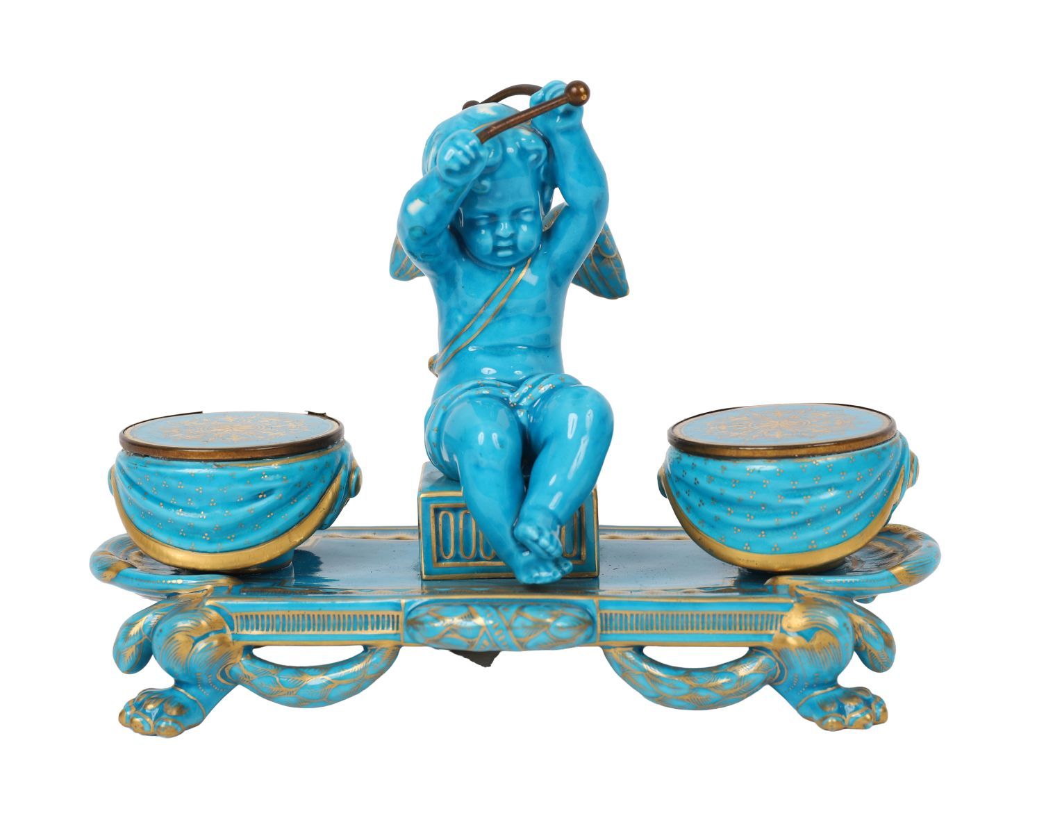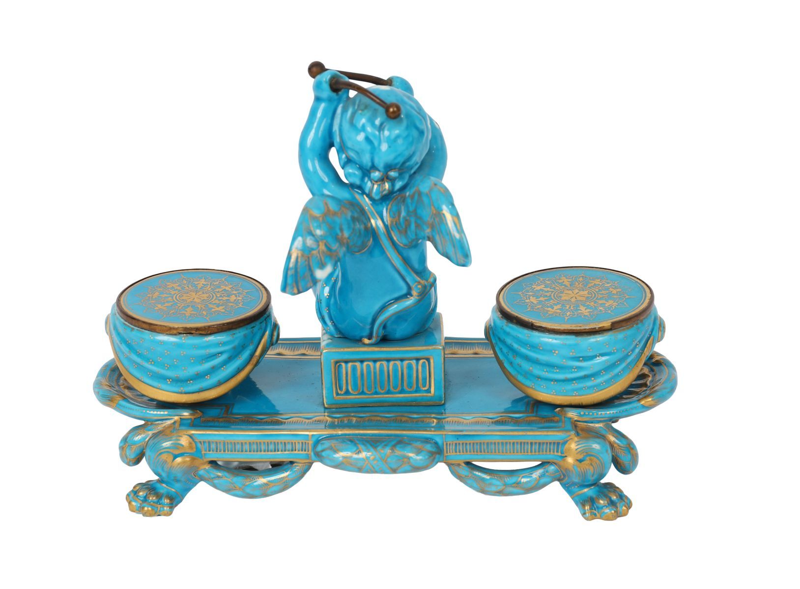 Fine turquoise and gilt porcelain double inkwell with seated cherub figure holding a pen, in the style of Sèvres, 19th century.