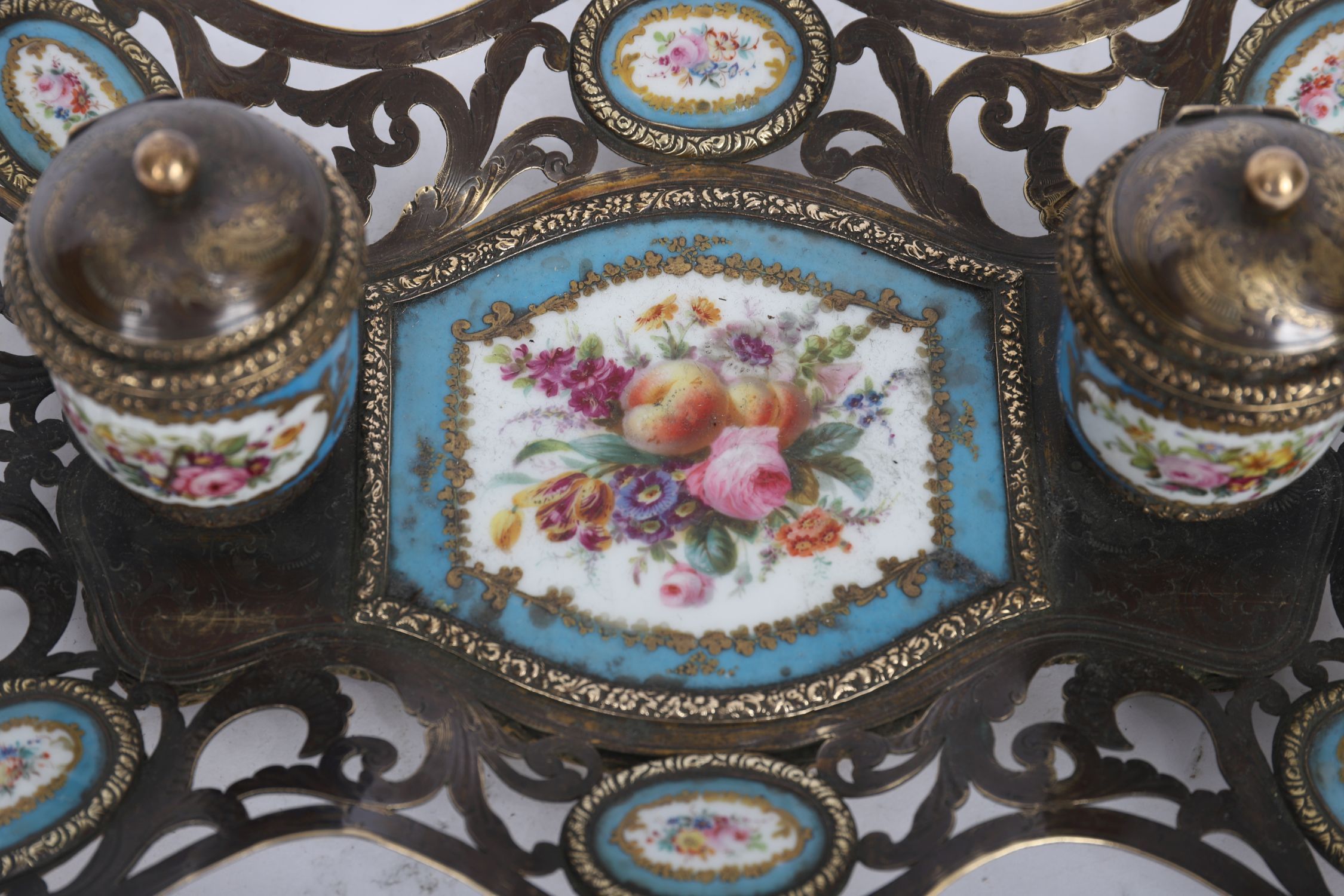A 19th century ormolu-mounted Sevres-style porcelain desk stand, pierced in rococo manner, with central hand-painted panel of fruit still life, surrounded by floral reserves. Fitted with twin gilt-brass inkwells.