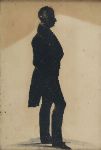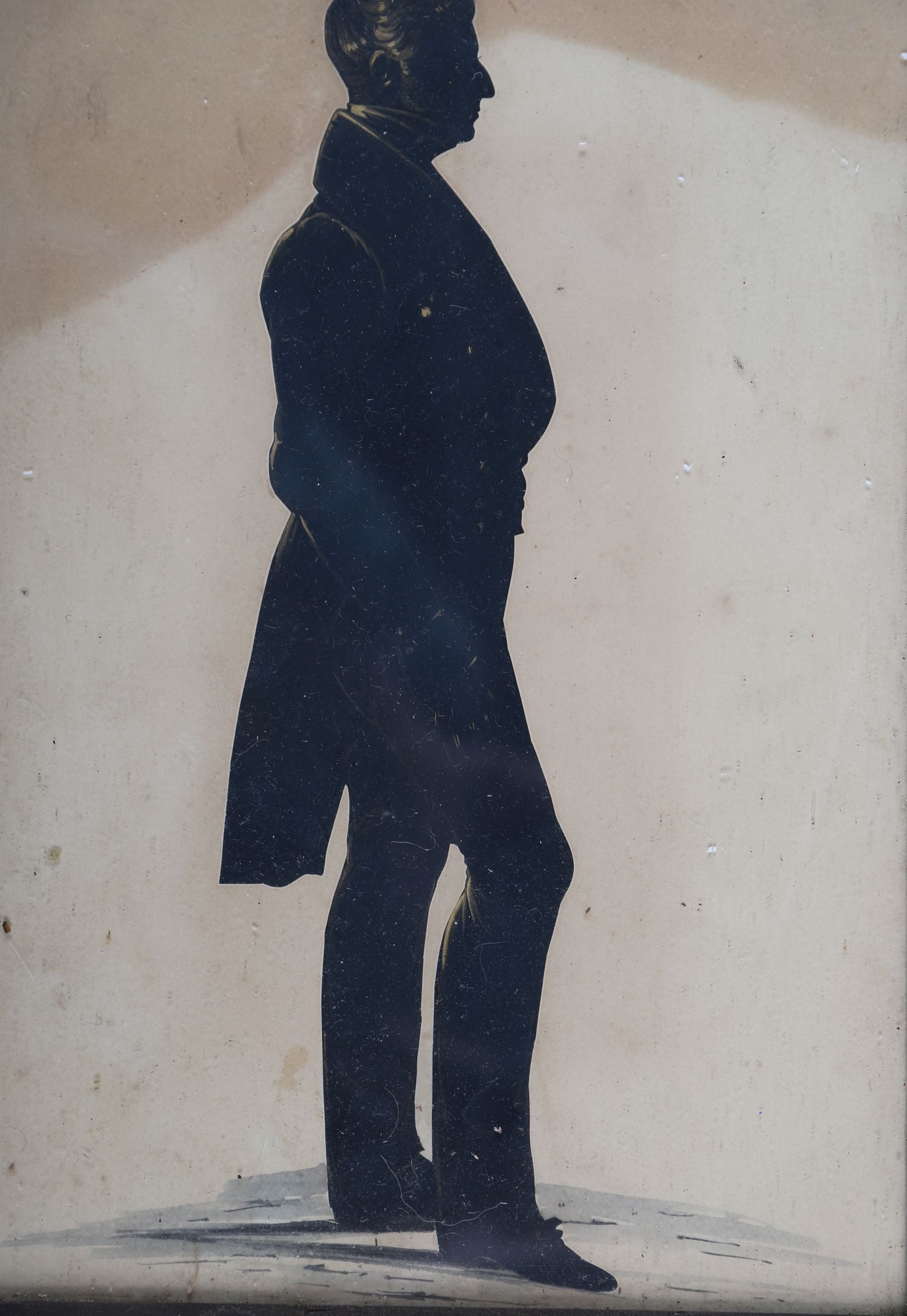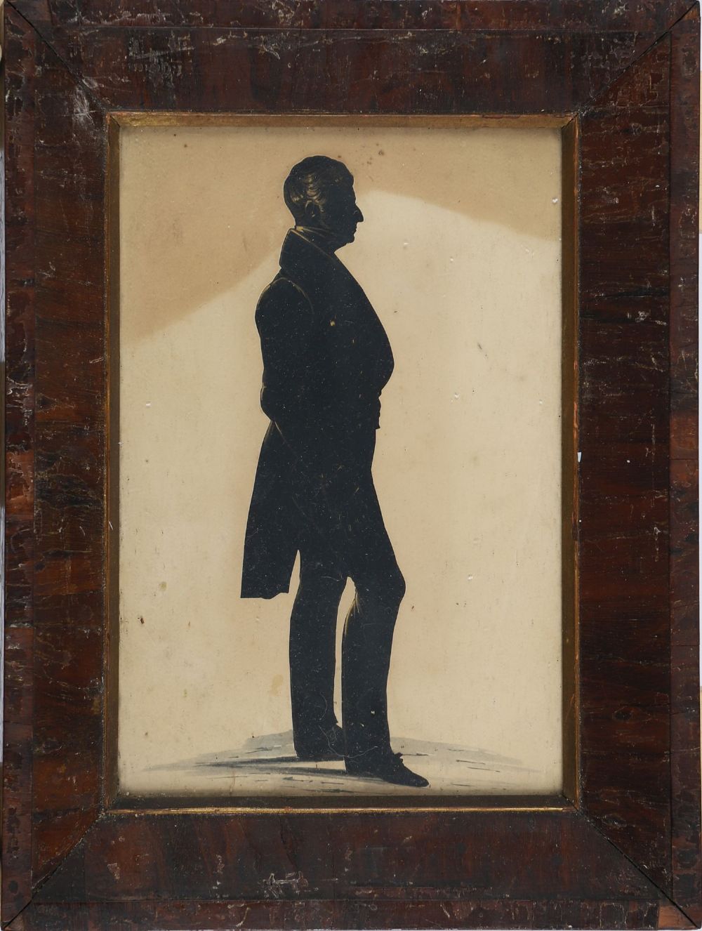 A hand-cut profile silhouette of a gentleman in long coat and cravat, mounted against a pale backing in a moulded rosewood frame. English, mid-19th century.