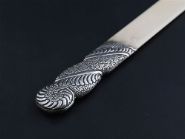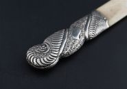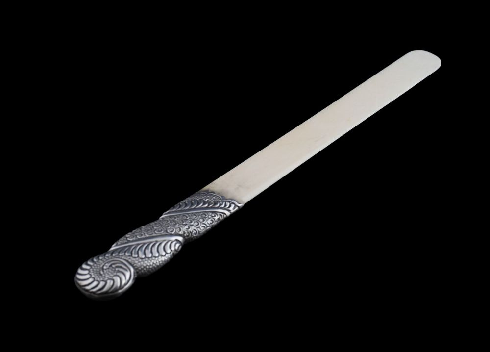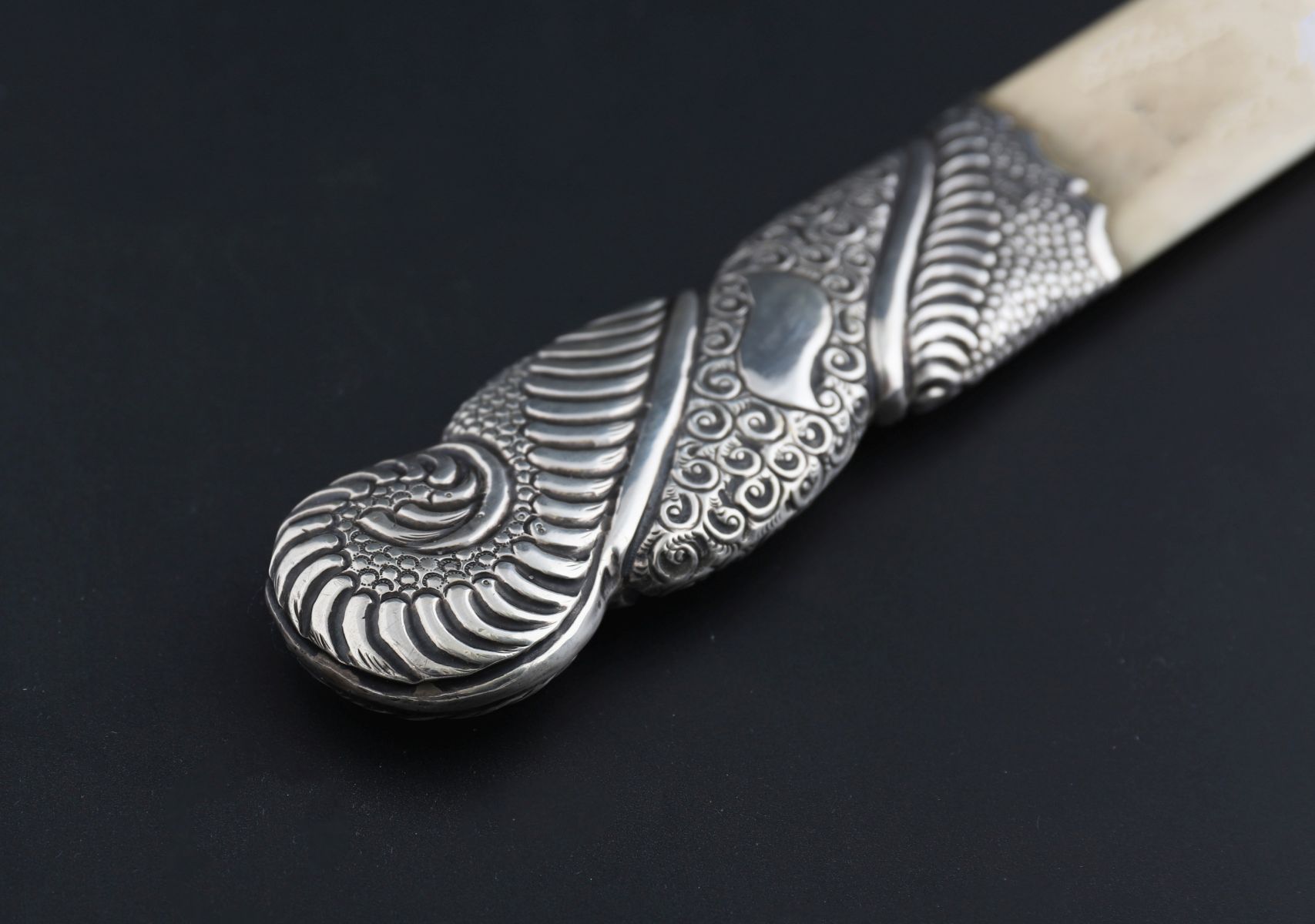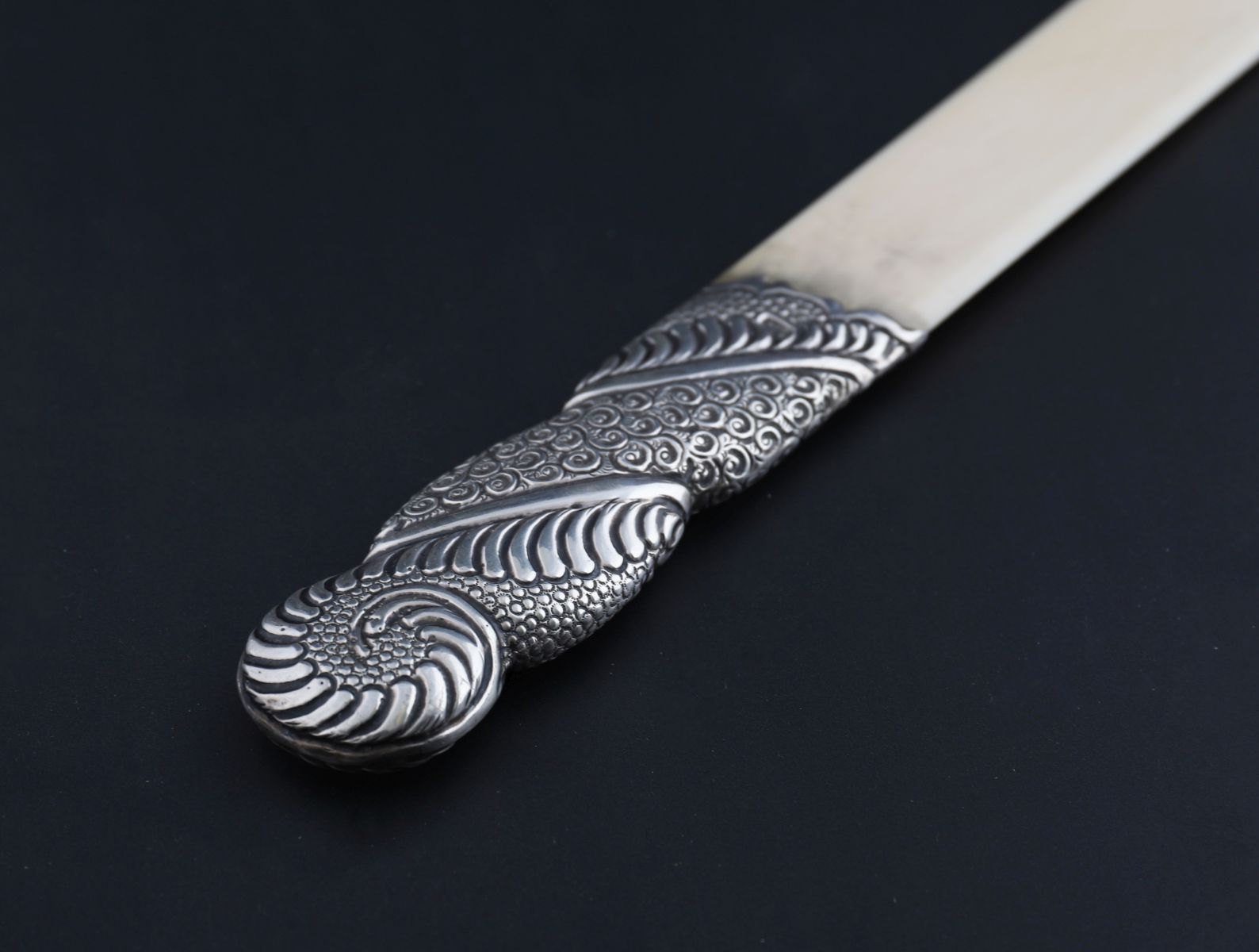Page turner with finely carved ivory blade and embossed silver handle of spiral and shell design. English, hallmarked Sheffield, late 19th century.