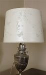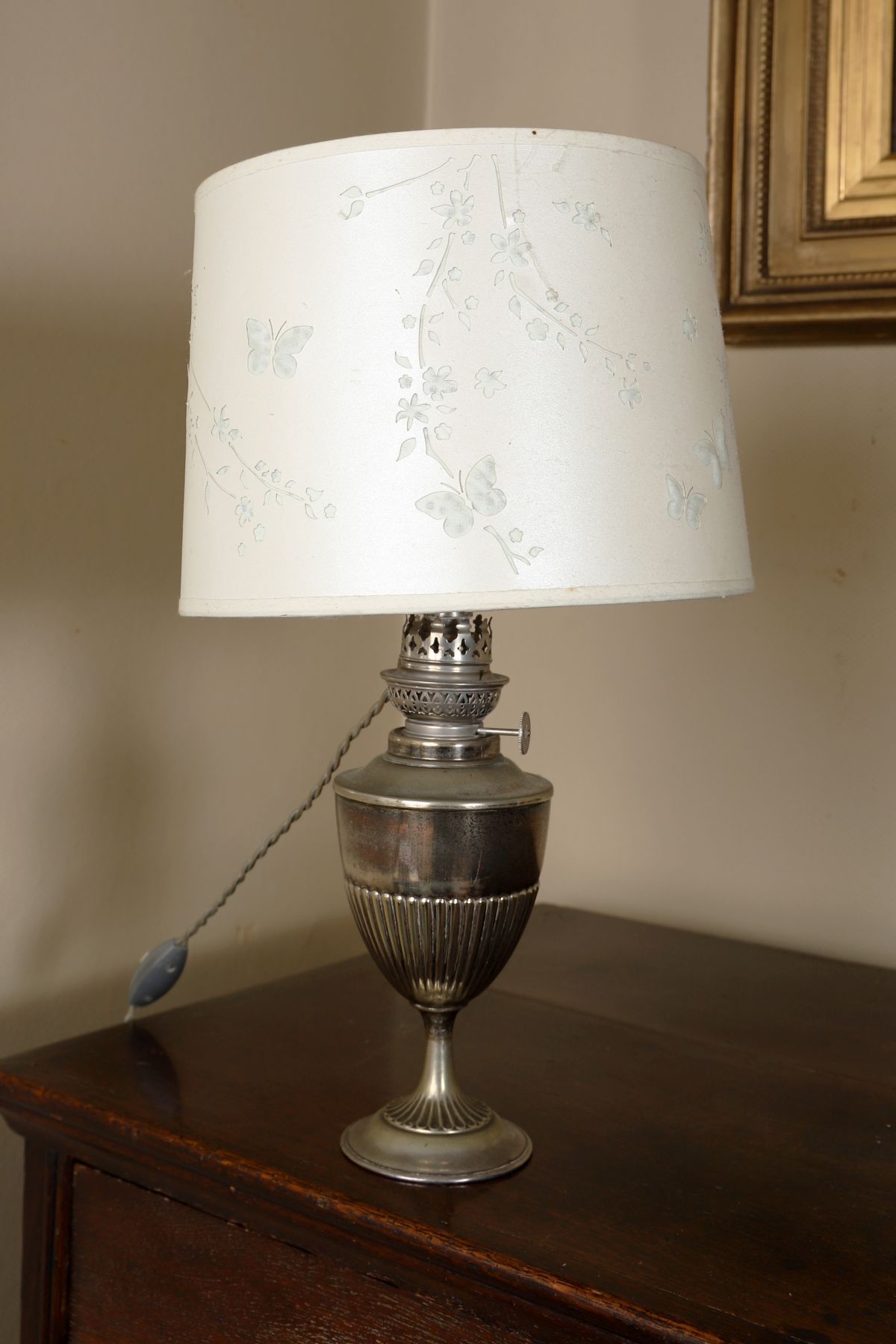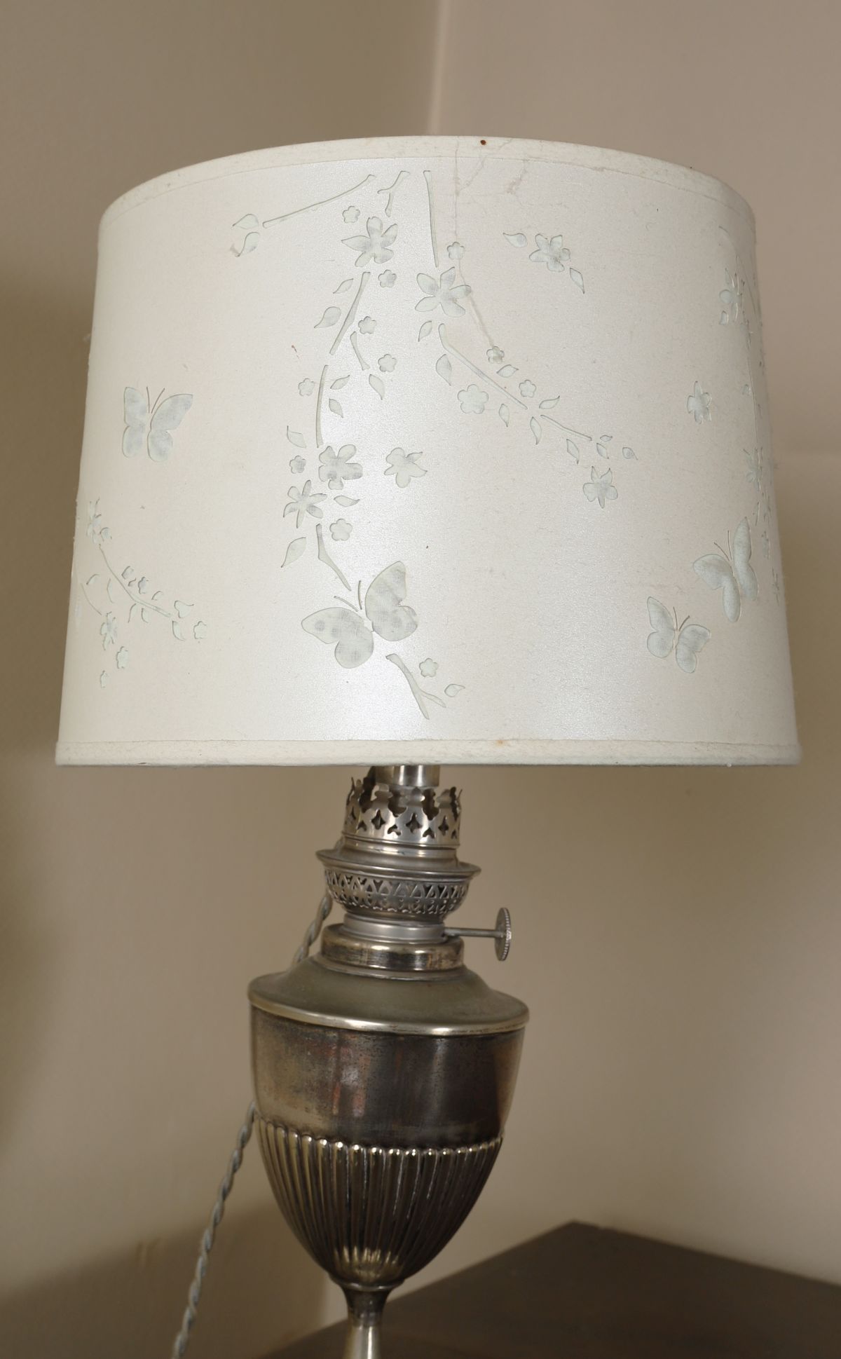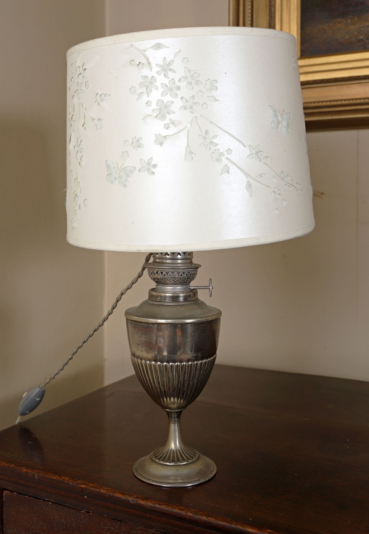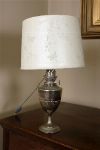 Lot 706 19TH-CENTURY SILVER-PLATED OIL LAMP STEMMED TABLE LAMP AND SHADE