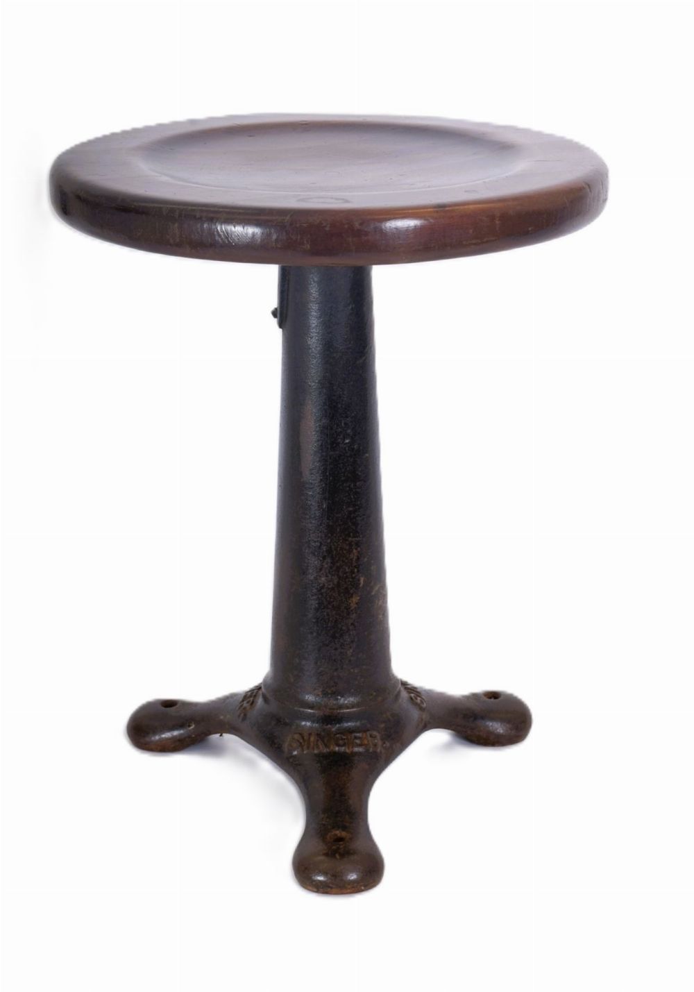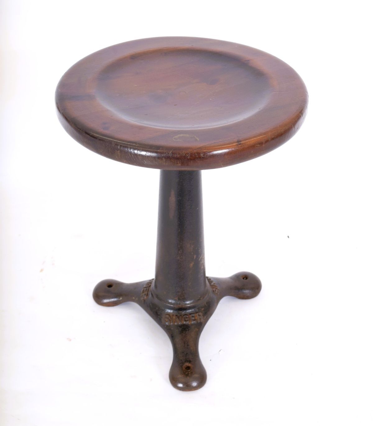 19th-century Singer factory stool with cast iron base and circular wooden revolving seat.