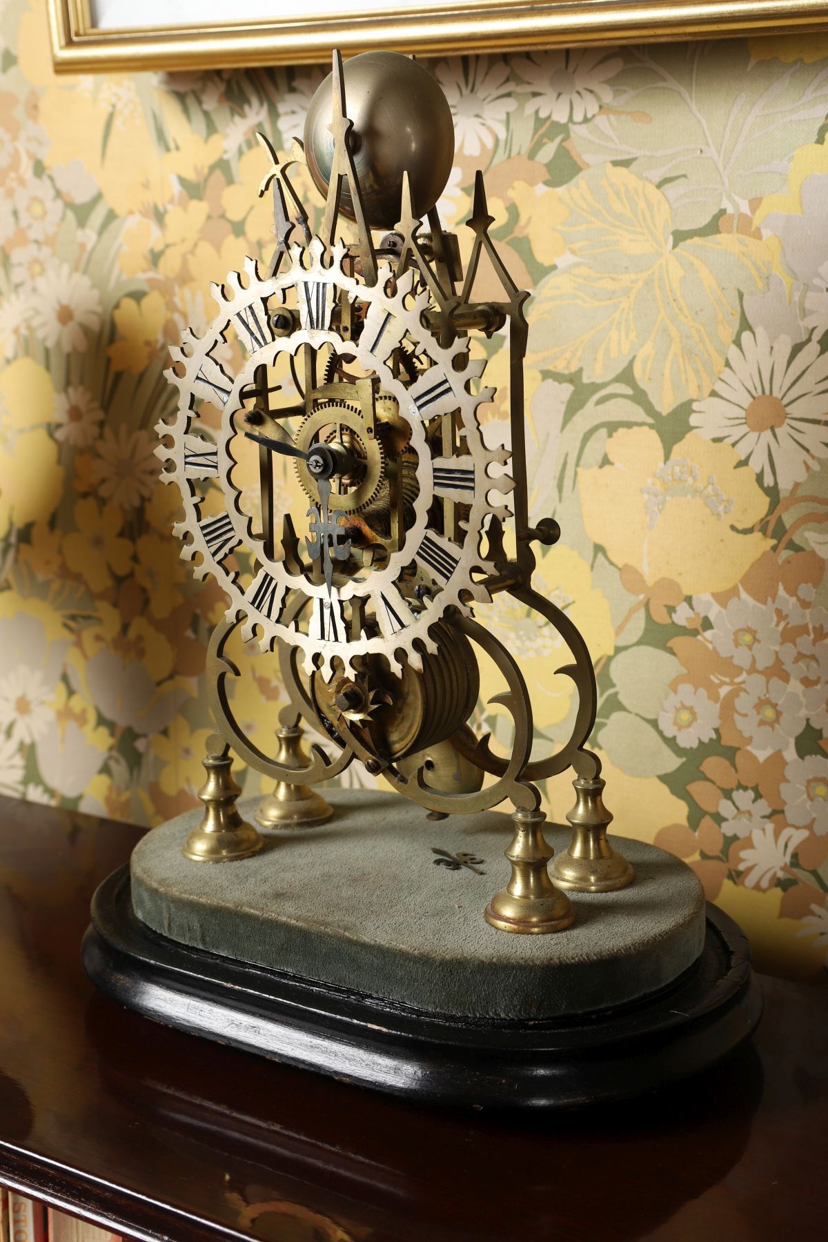 An exposed brass skeleton clock with circular chapter ring and Roman numerals, mounted on a rectangular base.