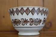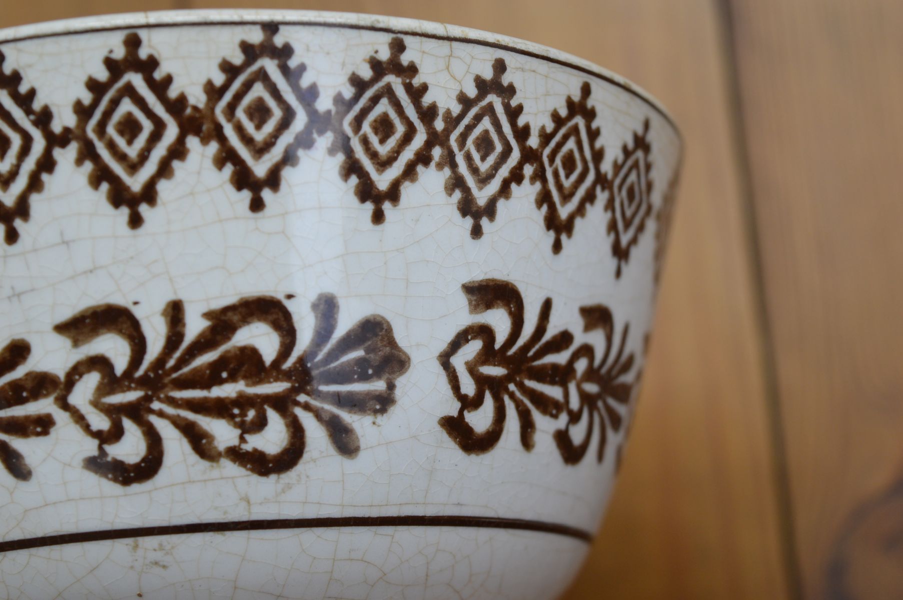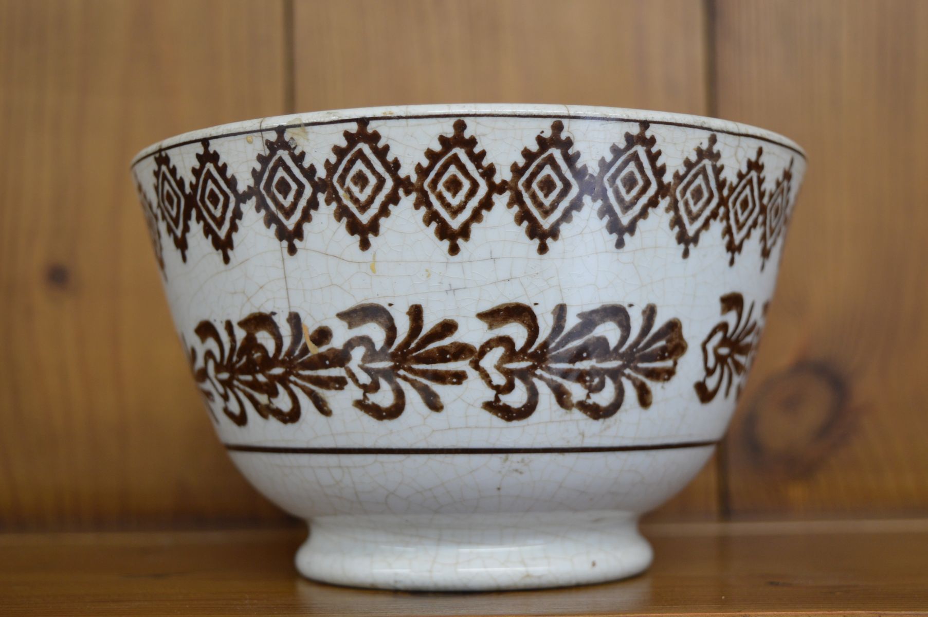 19th-century spongeware porridge bowl decorated with band of brown diamond-shaped motifs.