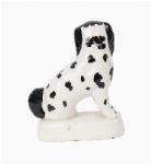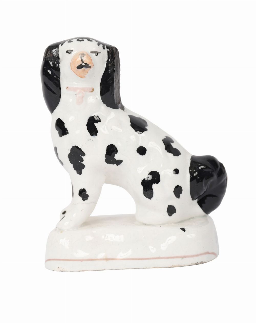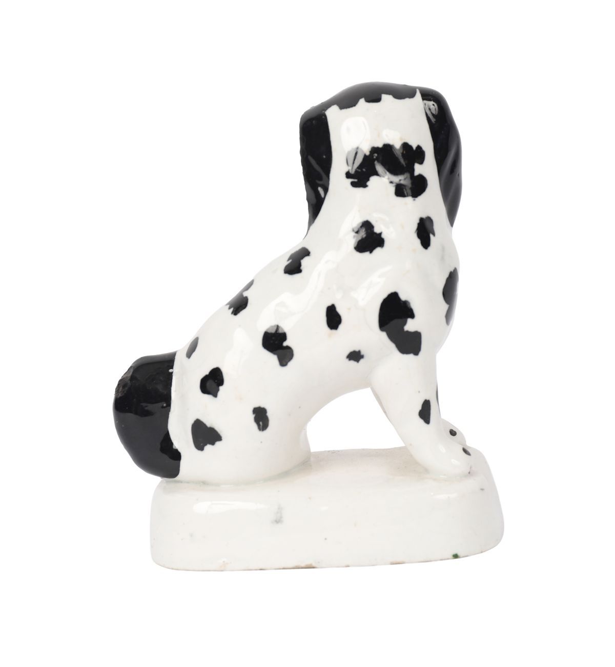 A Victorian Staffordshire pottery spaniel figure with black and white enamelled coat and gilt collar. 19th century.