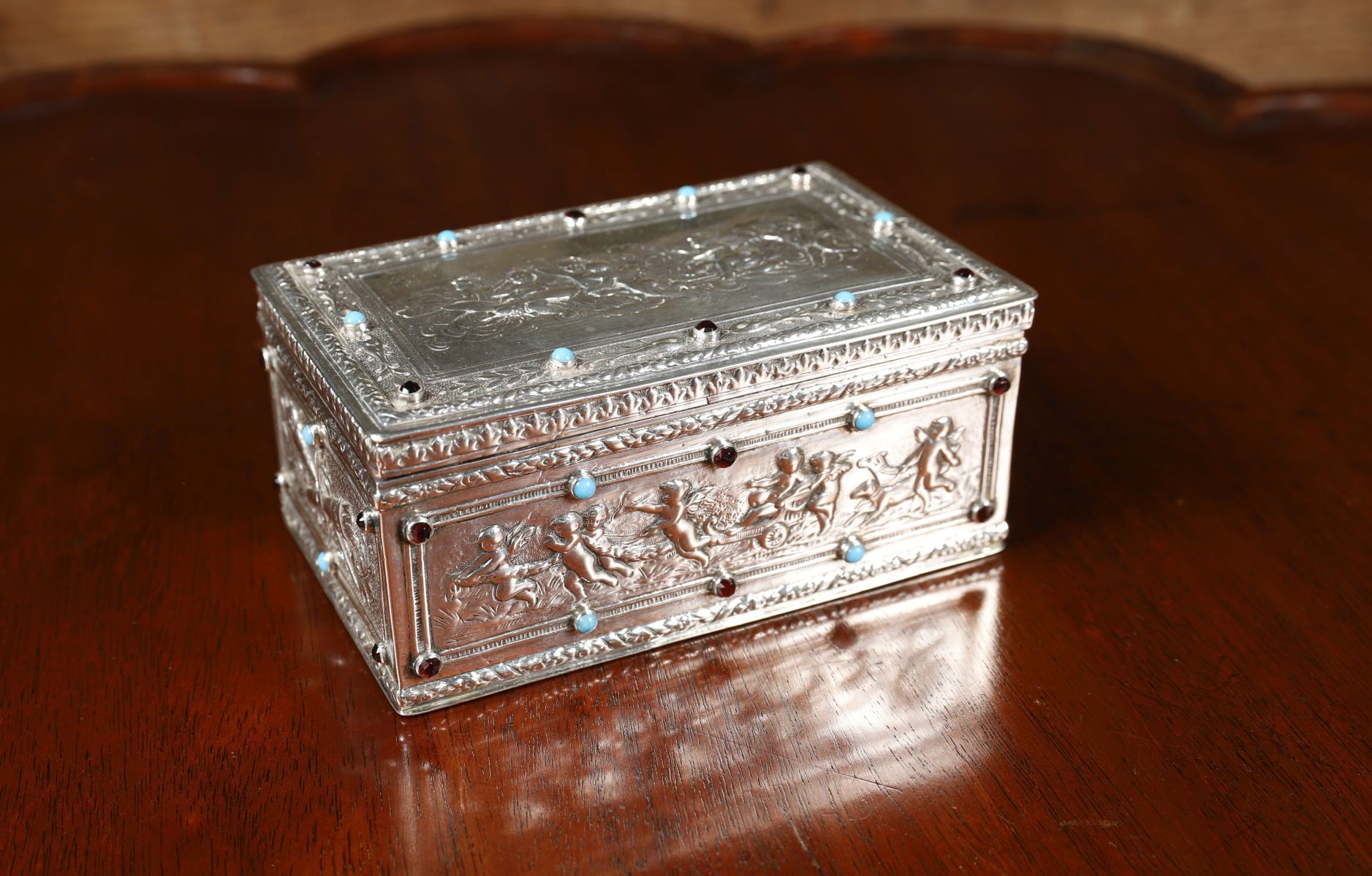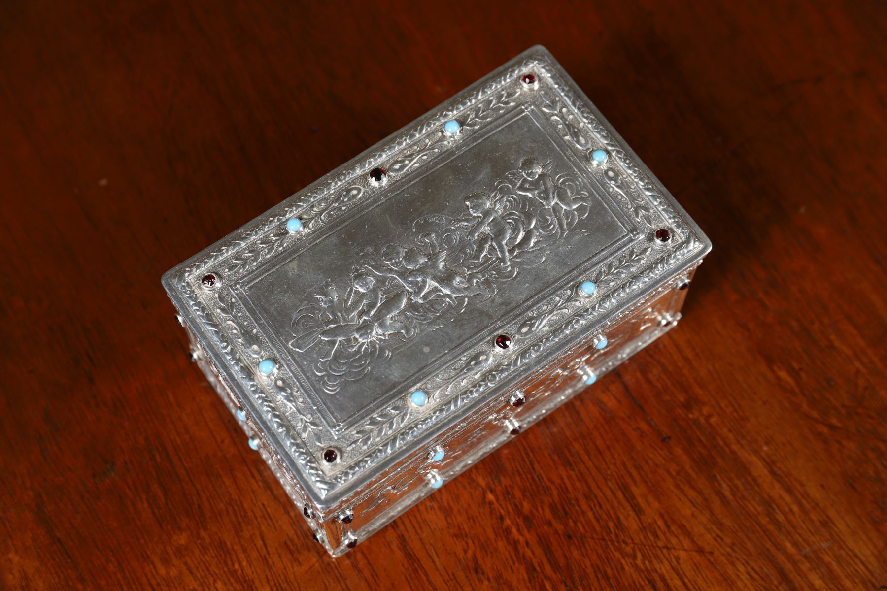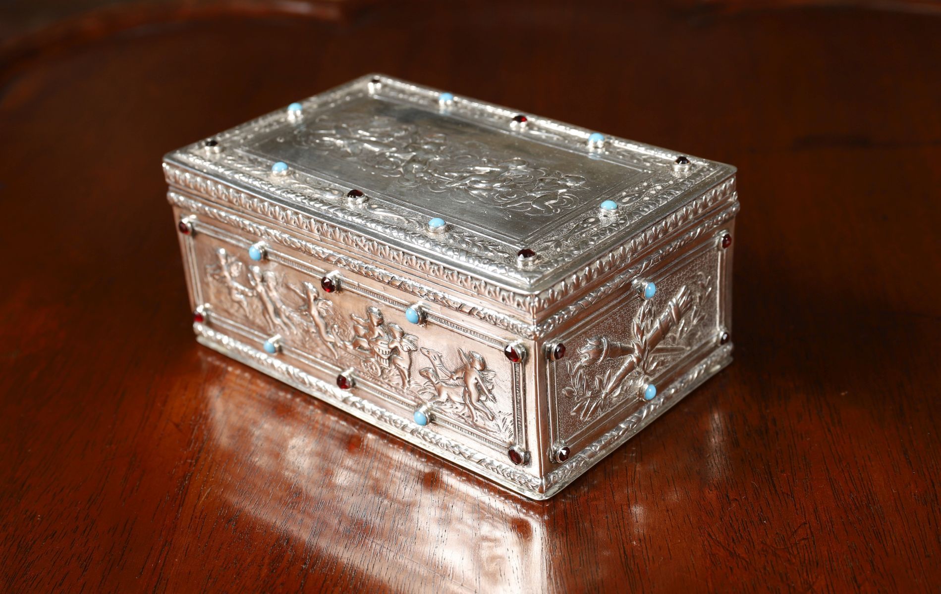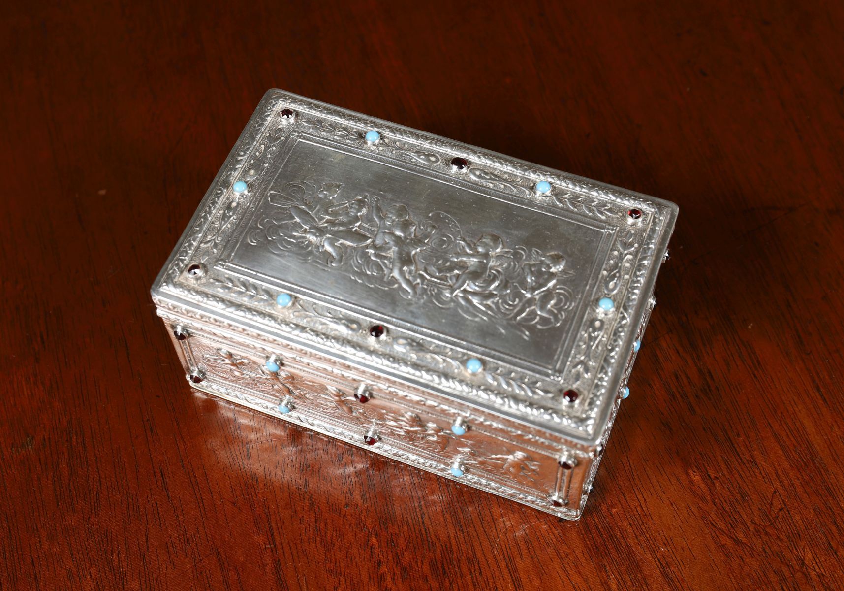 Rectangular sterling silver jewellery box, the hinged lid and sides decorated in relief with classical figural panels, set with cabochon hardstones. 355 grams.