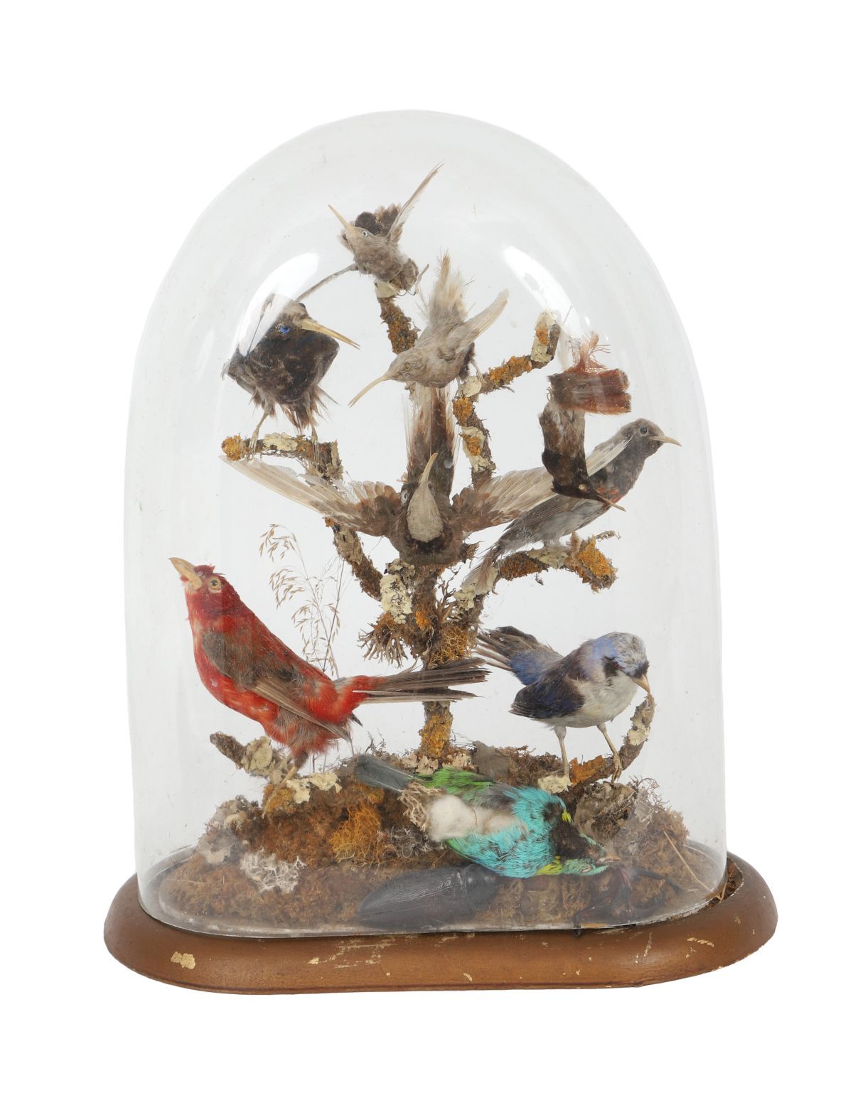 A Victorian taxidermy group of birds, arranged in a naturalistic composition with foliage and moss, housed beneath a blown glass dome on a shaped base. English, 19th century.