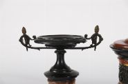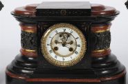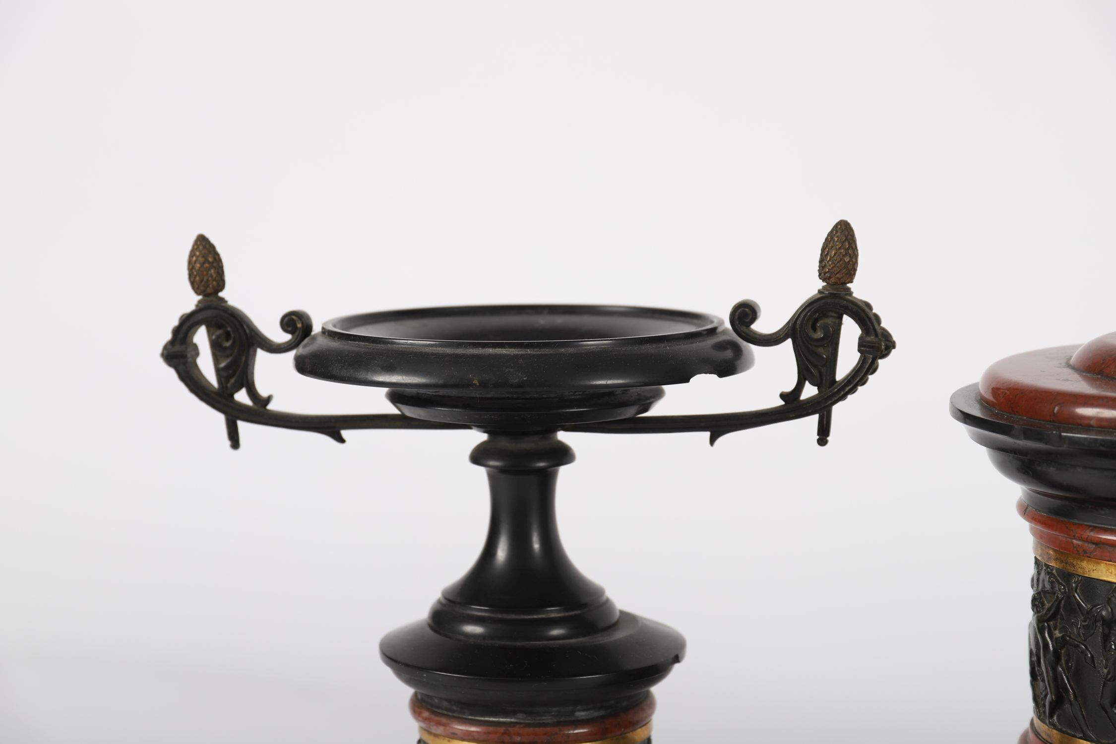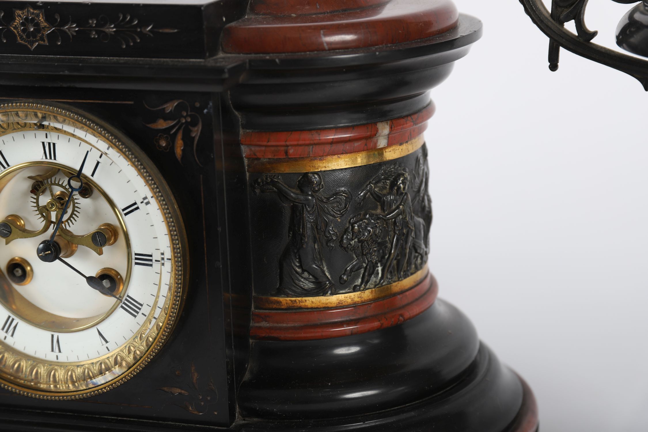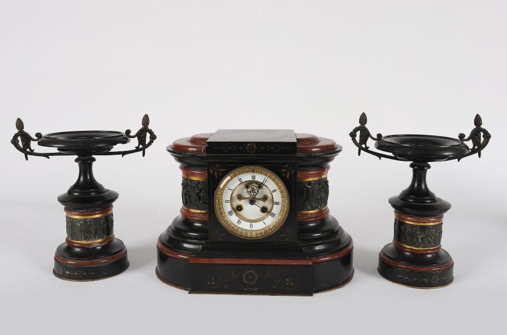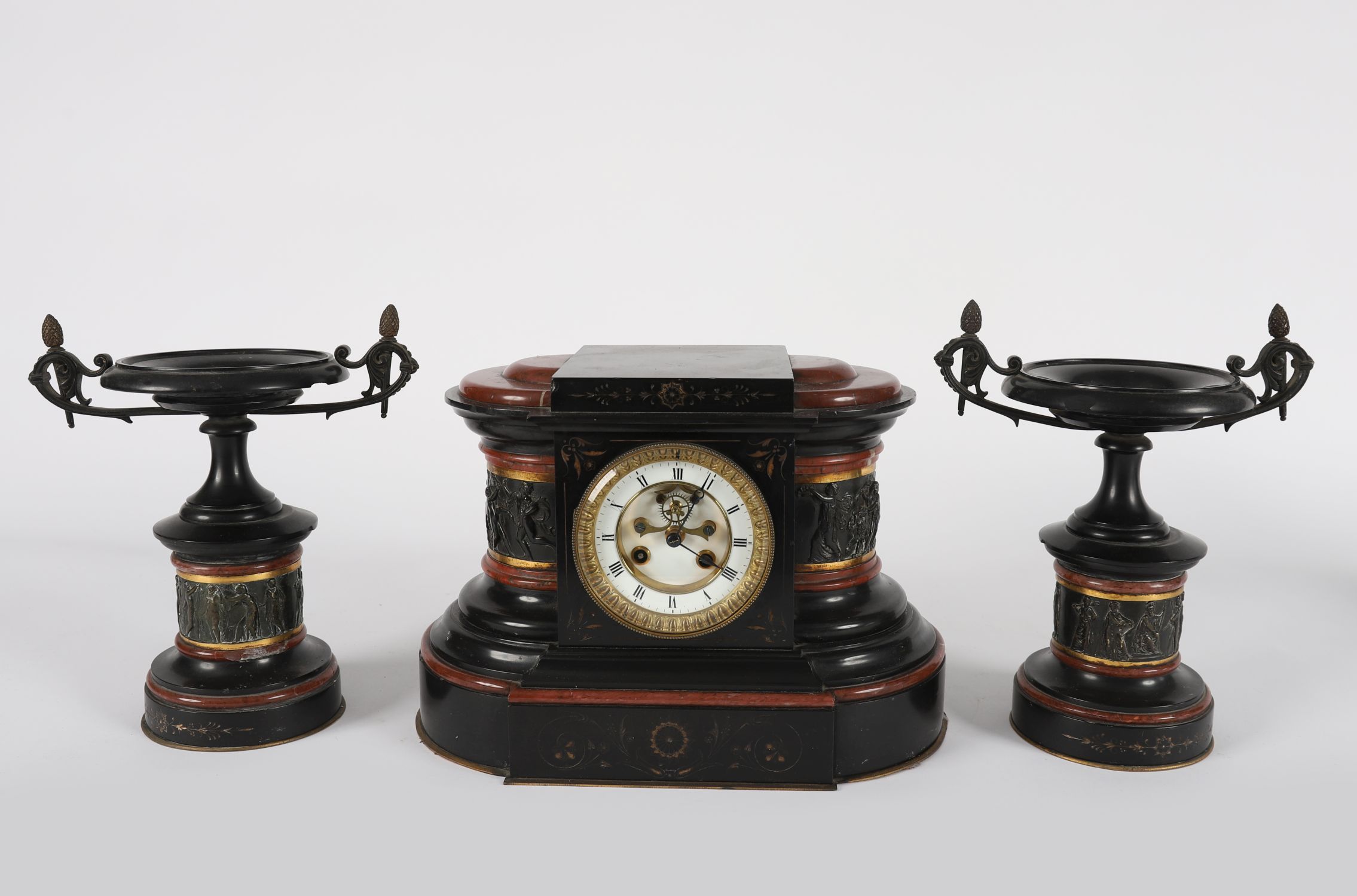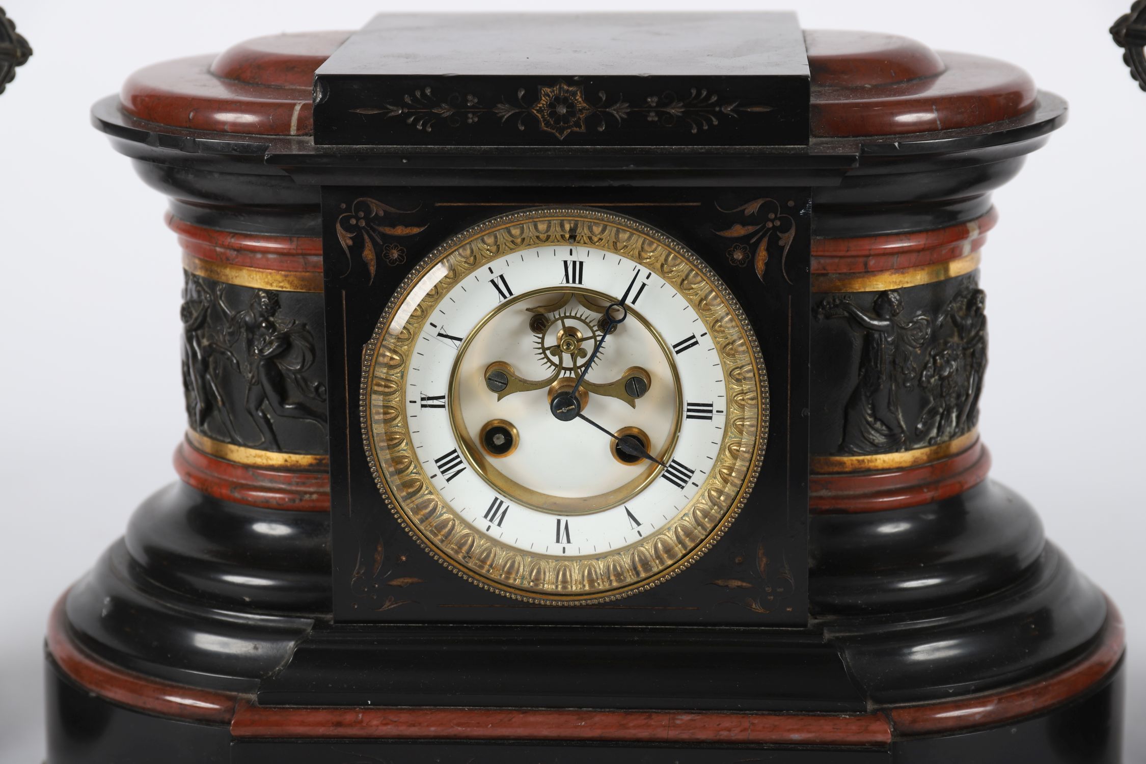 A 19th-century black and red marble three-piece clock garniture, comprising a central drum clock with enamel dial and matching side tazzas. Each piece features applied classical bronze friezes and detailing.