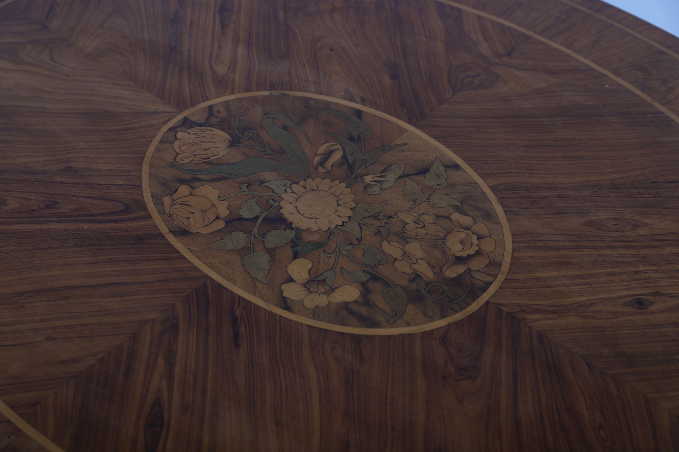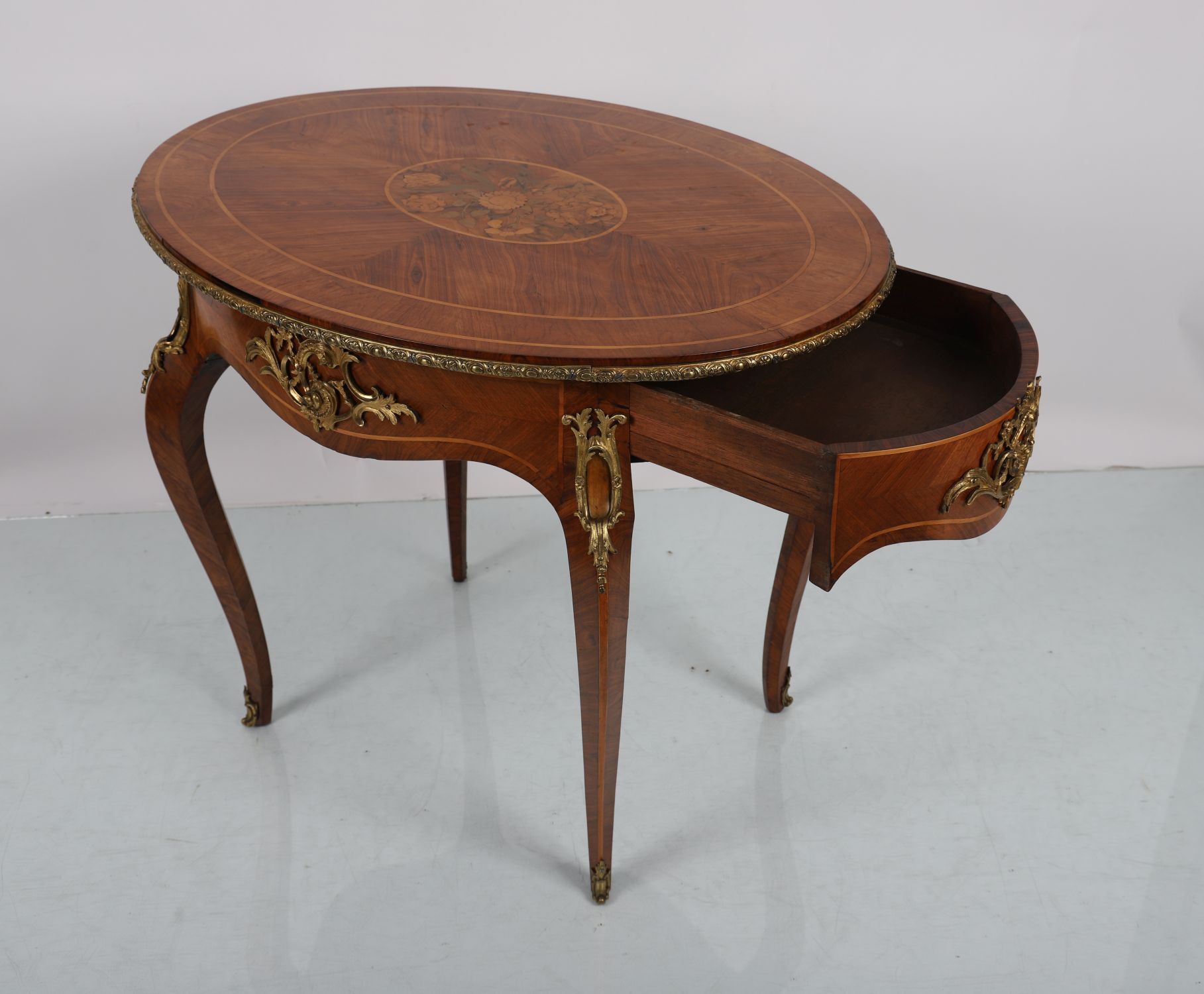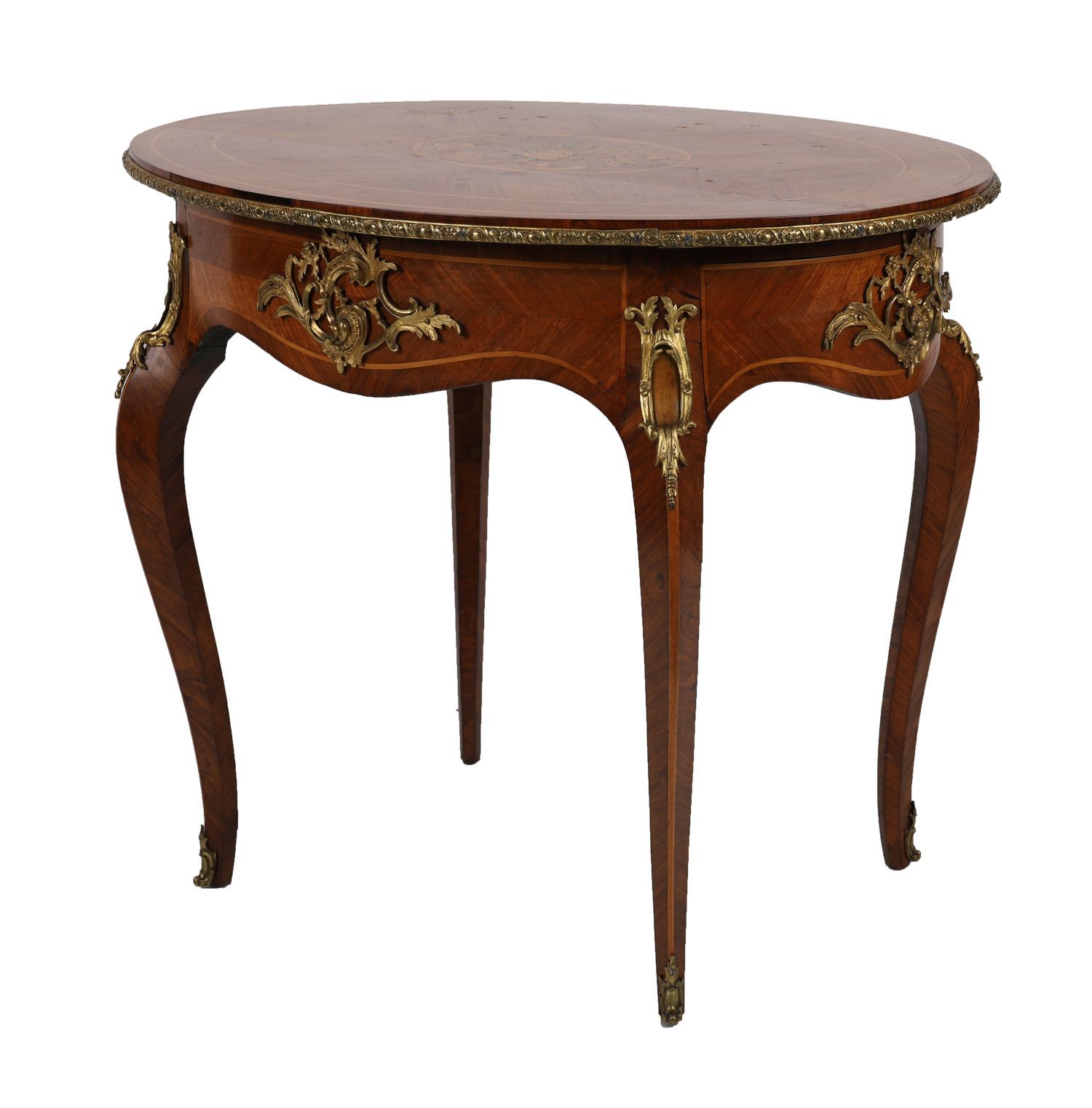 A fine 19th-century walnut centre table, the rectangular-shaped top with floral marquetry medallion within banded borders, mounted with elaborate cast ormolu apron mounts, raised on cabriole supports.