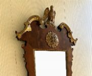 the rectangular plate with scalloped edge, surmounted by a parcel-gilt ho ho bird, with Rococo style scroll and acanthus leaf decoration, centred on a broken arched swan-necked pediment.