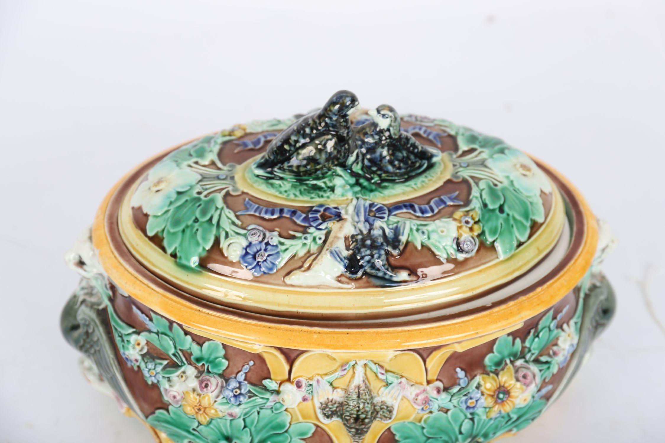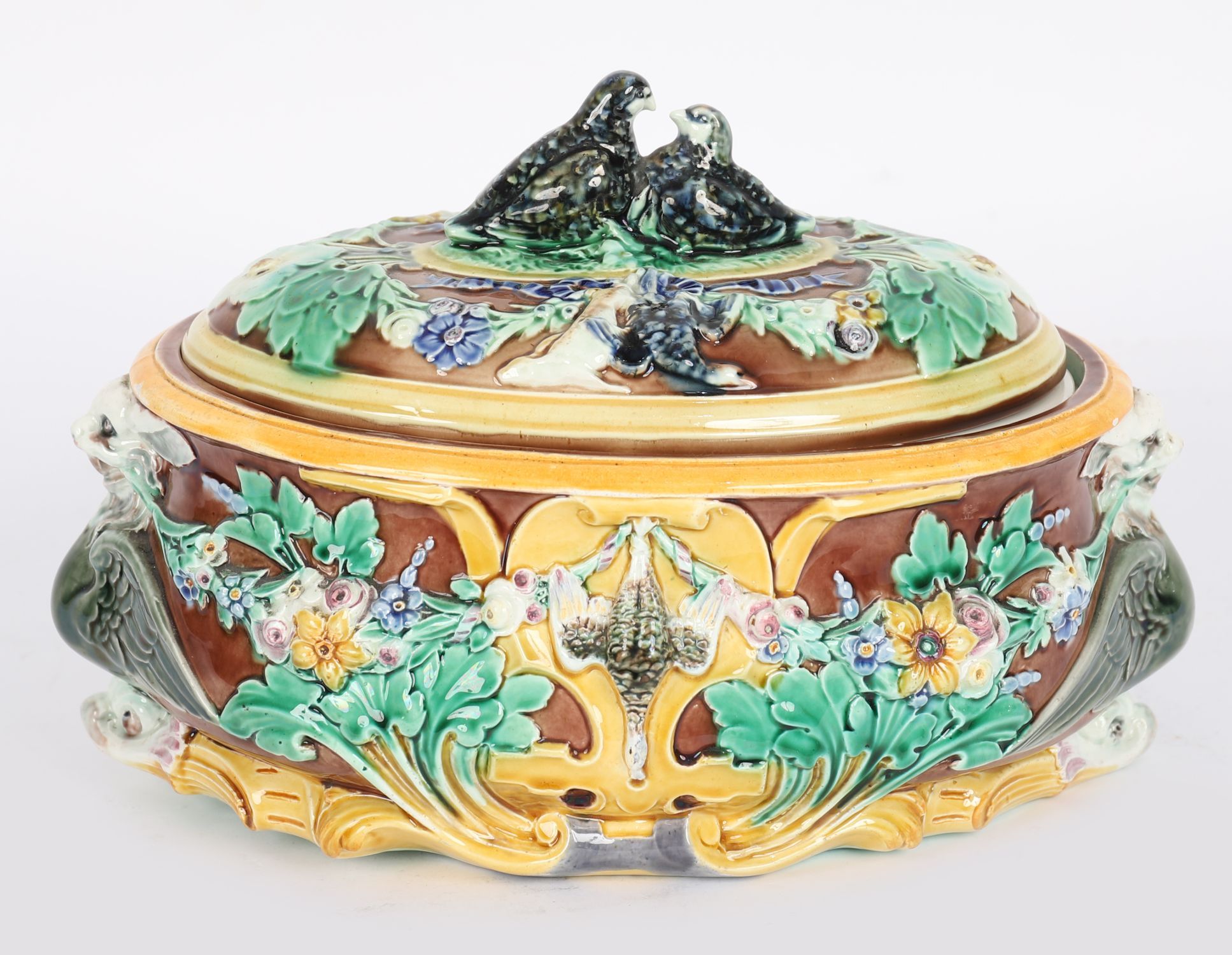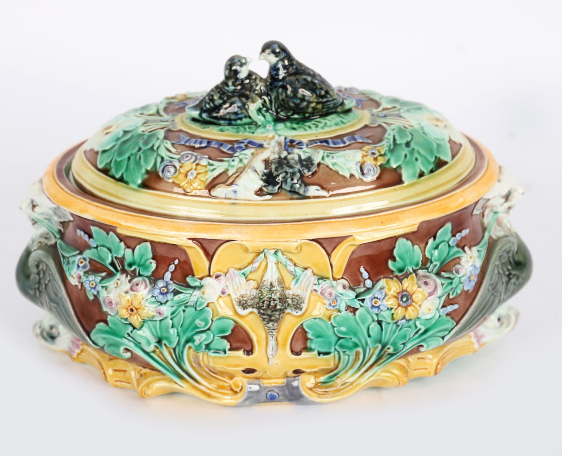 A 19th century Wedgwood majolica oval game pie dish and cover, moulded with flowers, foliage, and applied birds to lid, polychrome glazed in vibrant tones, complete with its original liner.
