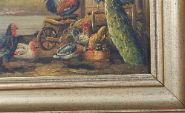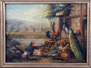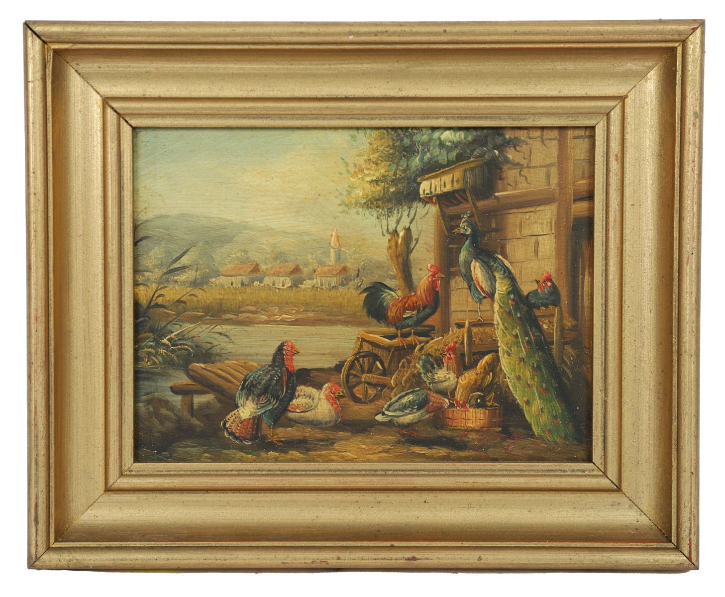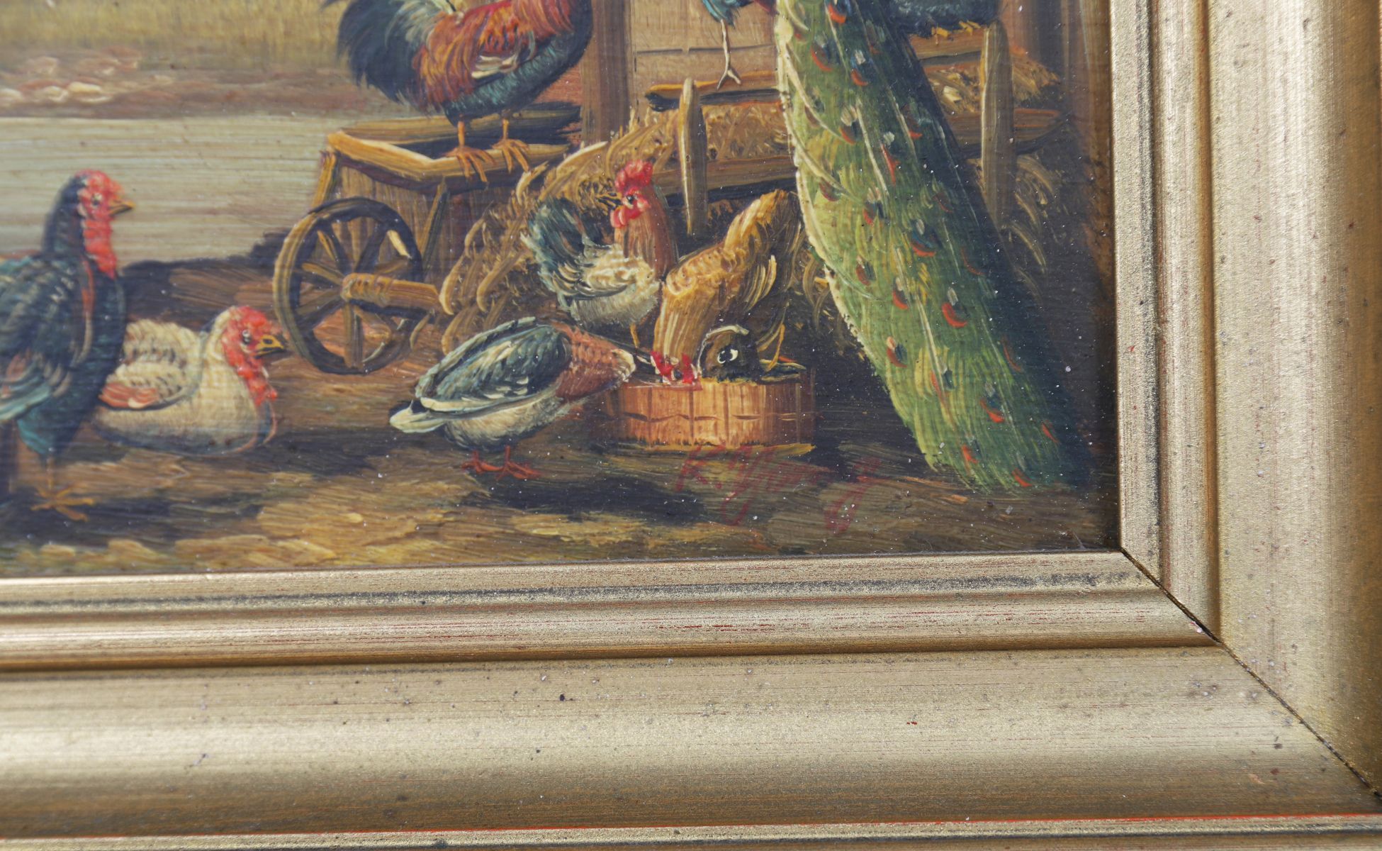 A 20th-century oil on canvas depicting a farmyard scene with poultry and peacock beside a timber outbuilding, contained in a gilt frame.