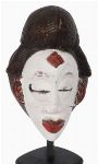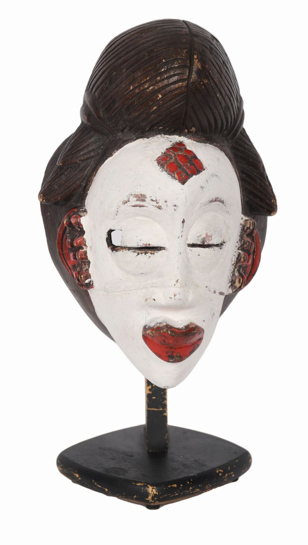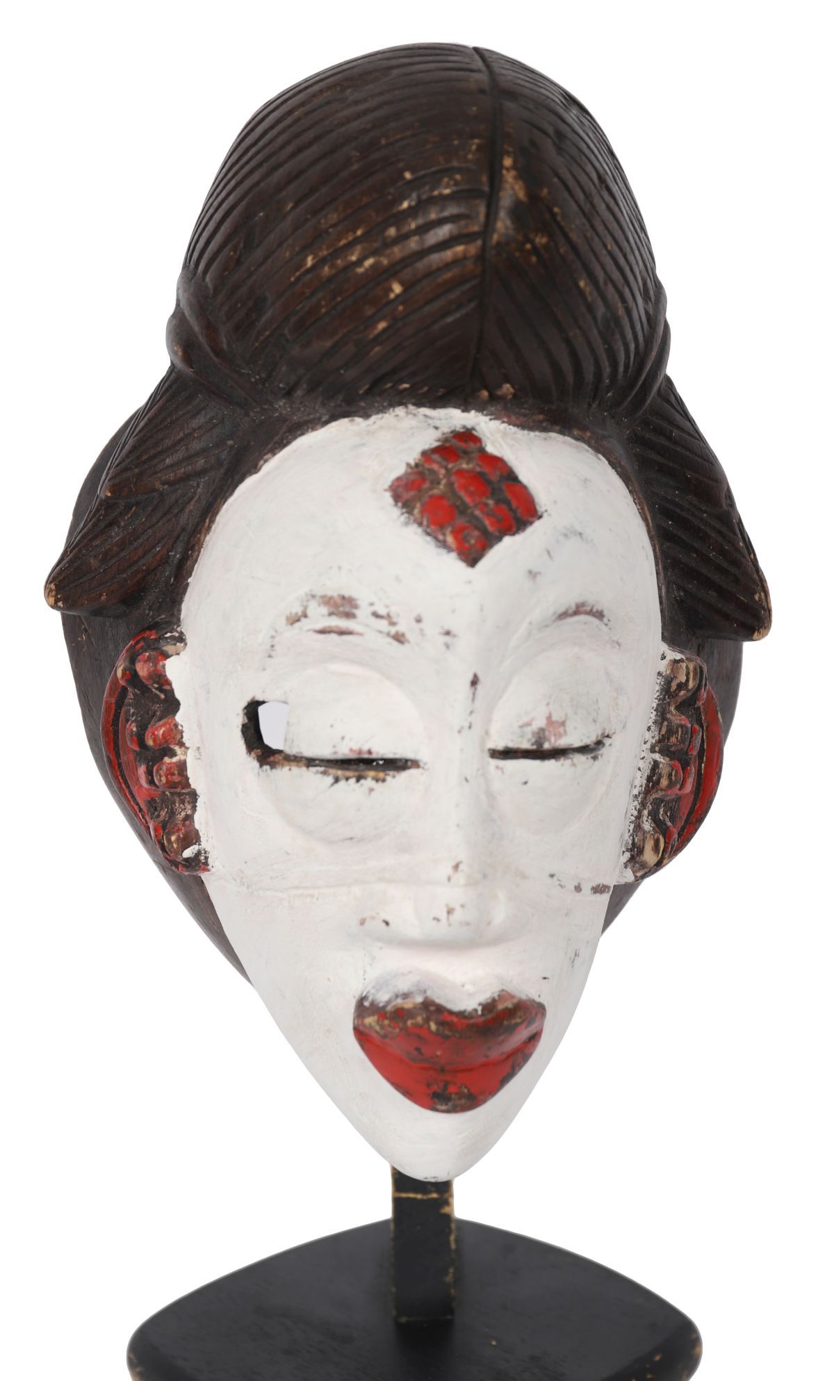 A carved wooden Punu mask from Gabon, with white kaolin-pigmented face, incised scarification motifs to the forehead and temples, stylised coiffure and red detailing to lips and ears. Mounted for display.
