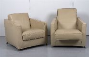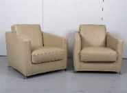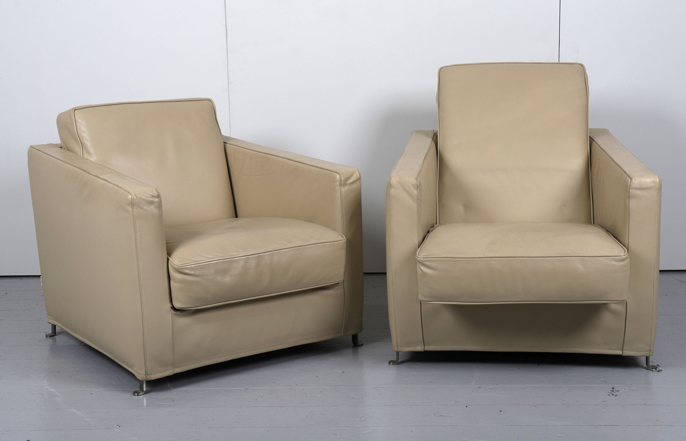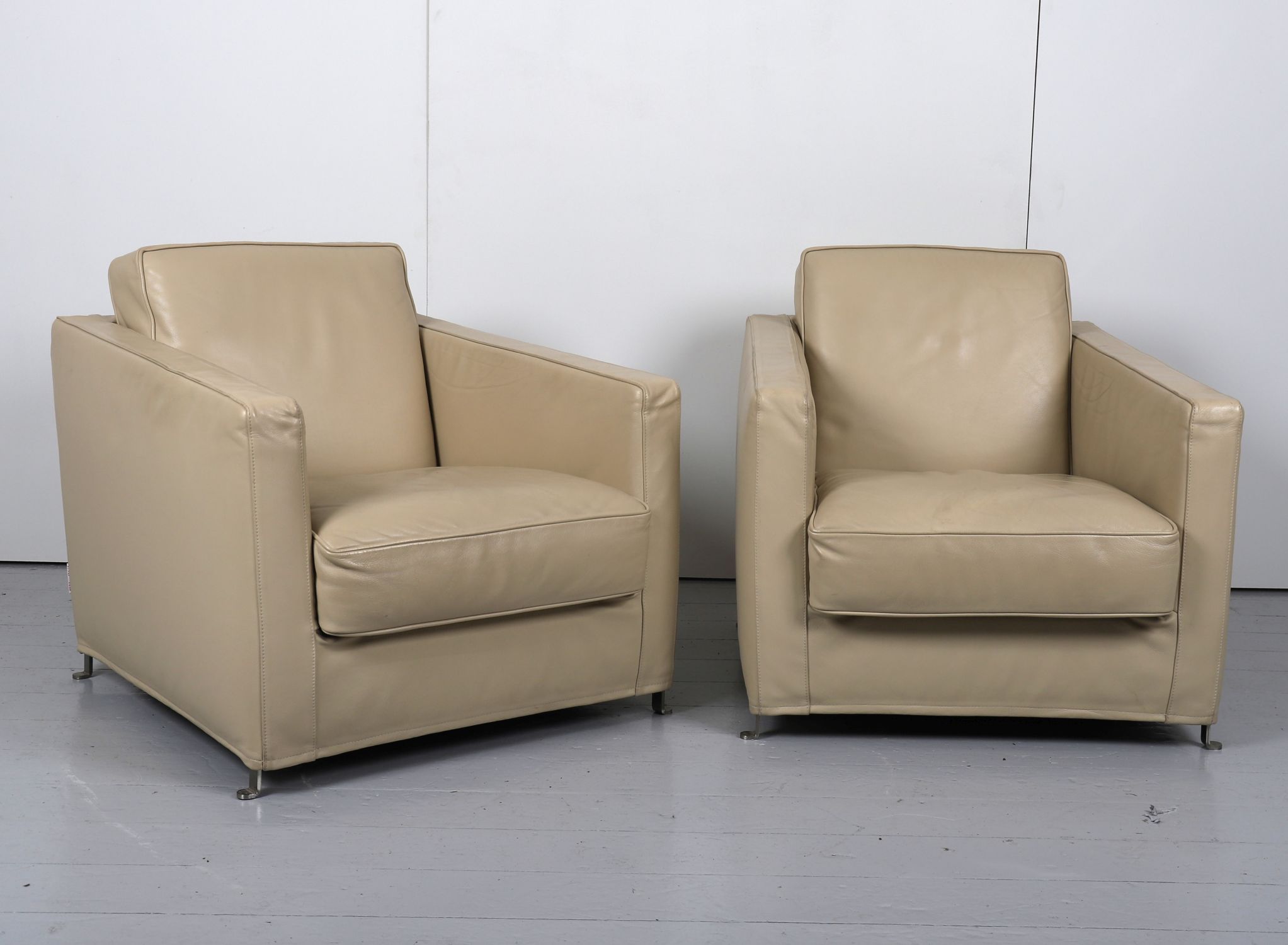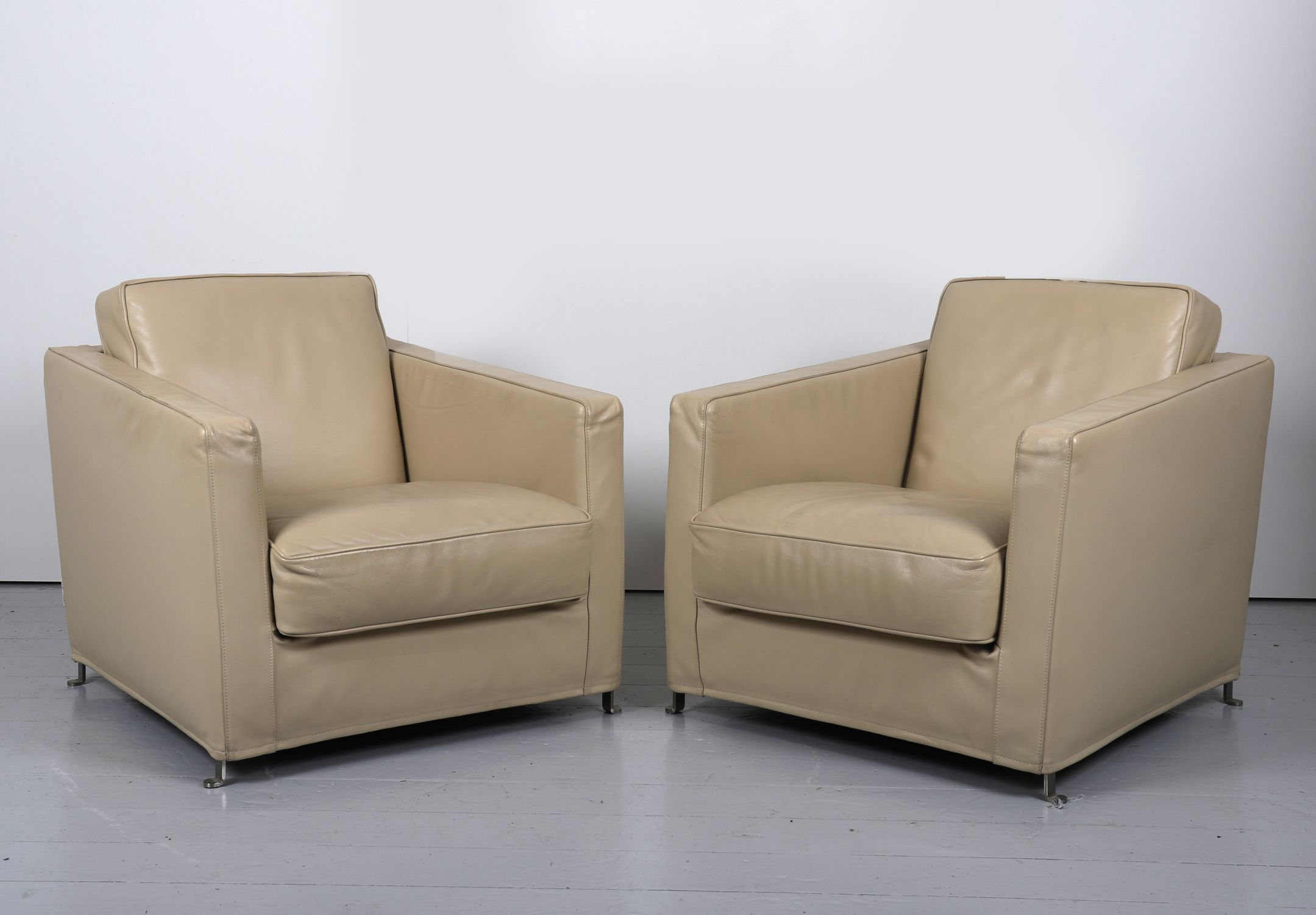 A pair of cube-form armchairs upholstered in cream leather, each with removable back cushions, deep seats, and squared track arms. Designed in the modernist tradition of mid-20th century furniture, combining functionality with minimal elegance.