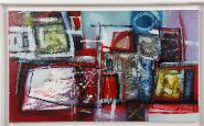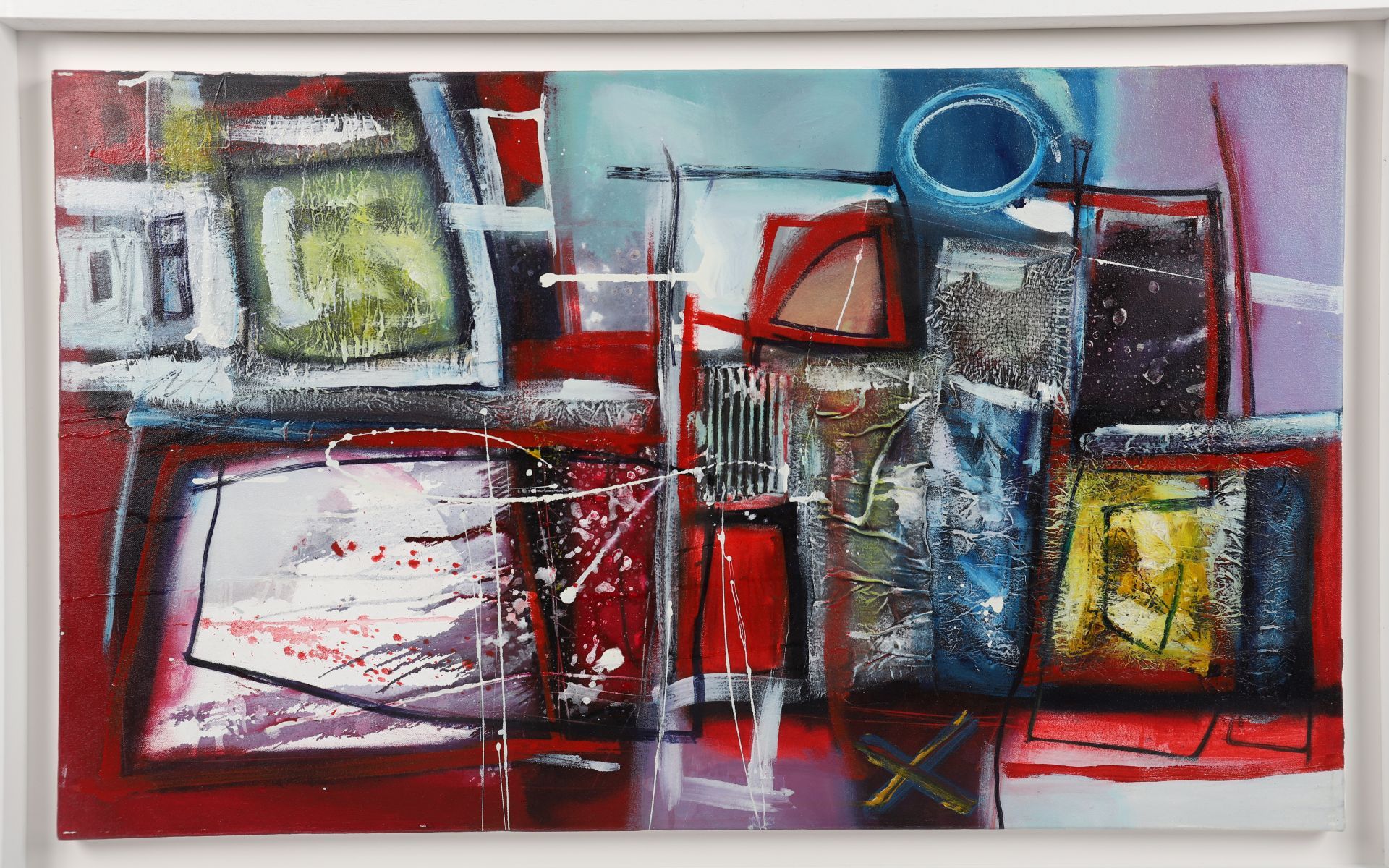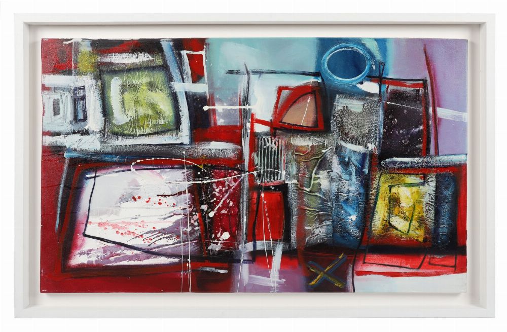 A bold geometric abstraction composed of interlocking blocks of colour in blue, white, red, and black. The artist’s confident use of texture and colour contrast conveys rhythm and energy, typical of mid-20th-century modernist influence.