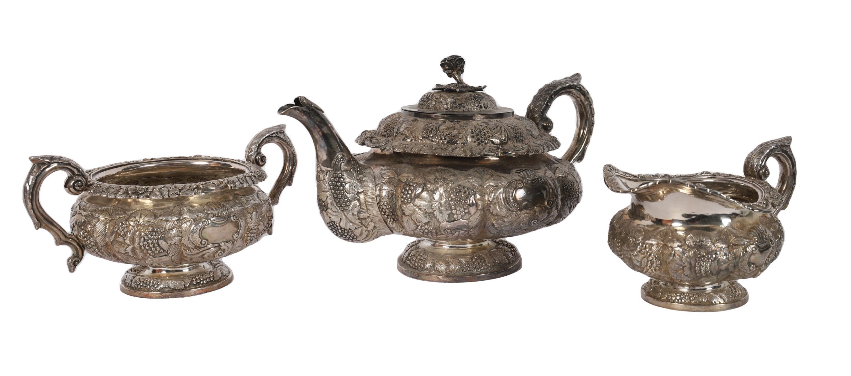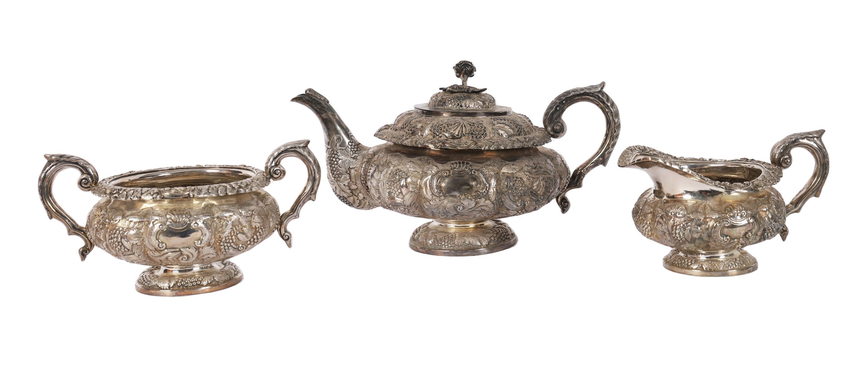 three-piece Irish silver tea service comprising teapot, sugar bowl and cream jug, each of baluster form with chased and engraved decoration, scroll handles and domed covers, all bearing Dublin hallmarks for 1828.