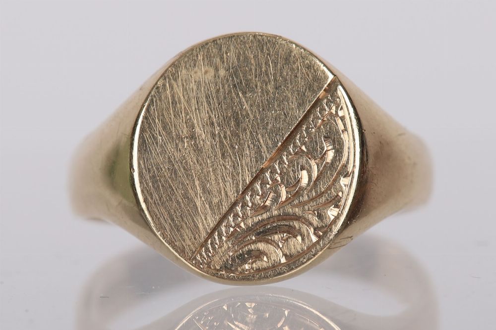 A 9 carat yellow gold signet ring with oval head engraved with monogram-style decoration.