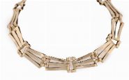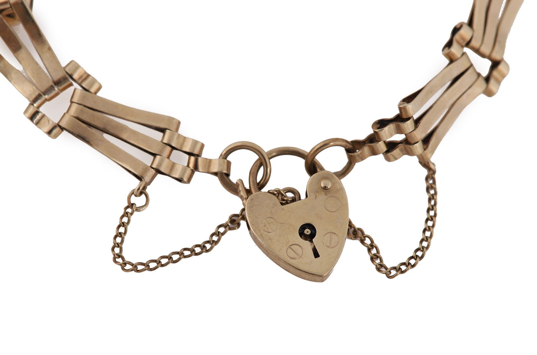 A 9ct gold bracelet composed of articulated openwork links, terminating in a heart-shaped padlock clasp with safety chain. 8 grams.