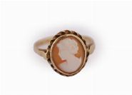 A 9ct gold cameo suite comprising brooch, ring and a pair of earrings, each set with oval carved shell cameo panels depicting classical female profiles. Approx. 10 grams.