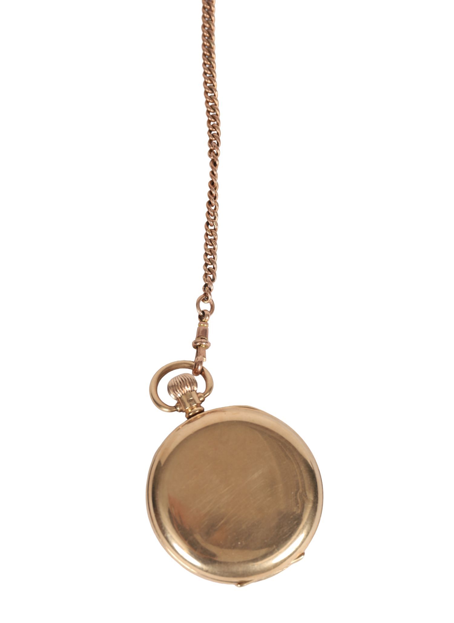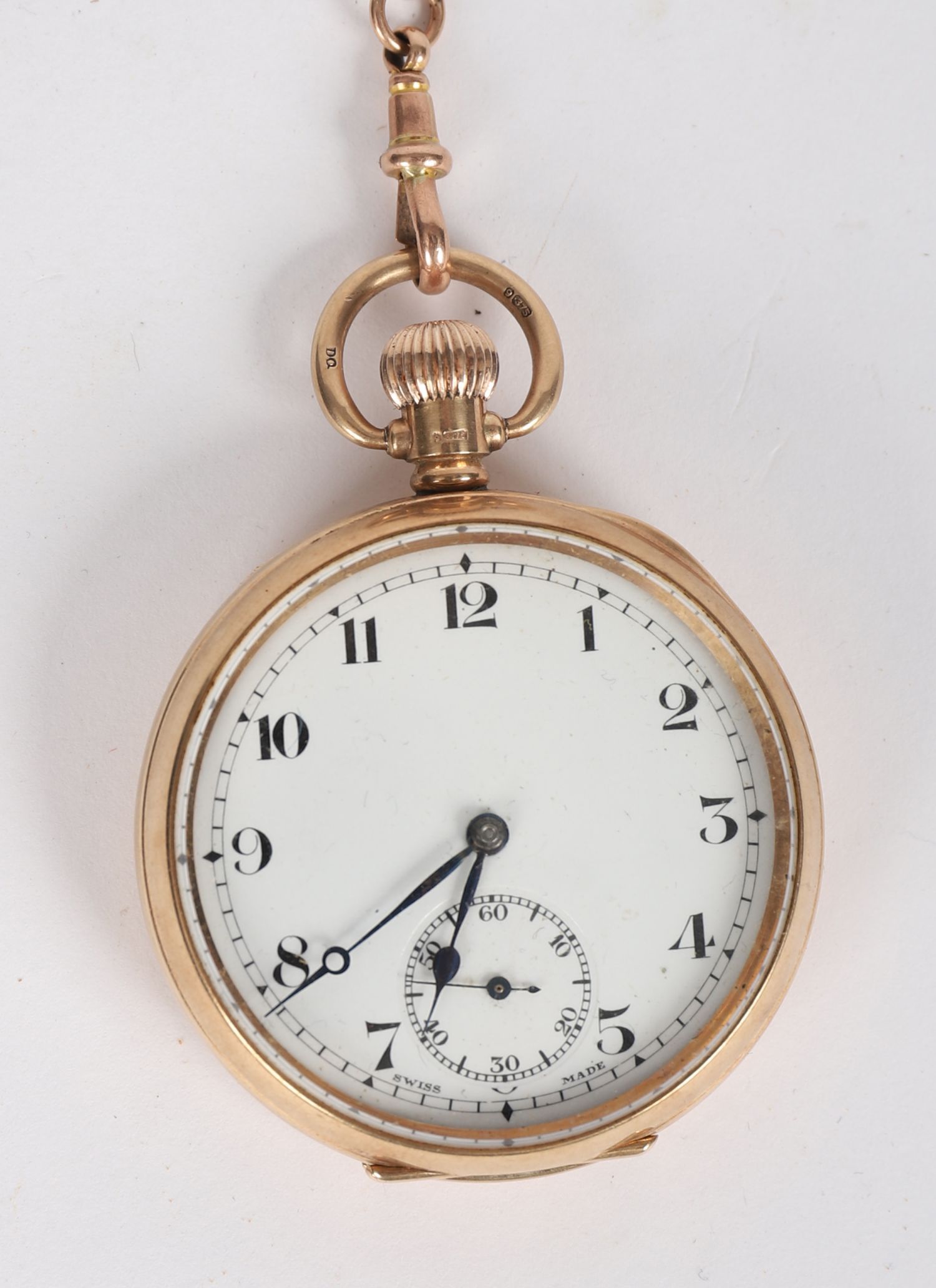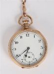 A gentleman's open-face pocket watch with white enamel dial, Arabic numerals, subsidiary seconds at six o'clock, and blued steel hands, contained within a 9ct gold case by Aaron Lufkin Dennison, Birmingham, date letter for 1871. The Dennison Watch Case Company was renowned for producing robust and finely finished watch cases. Complete with a gold chain and safety pin fitting, presented in its original fitted case.
