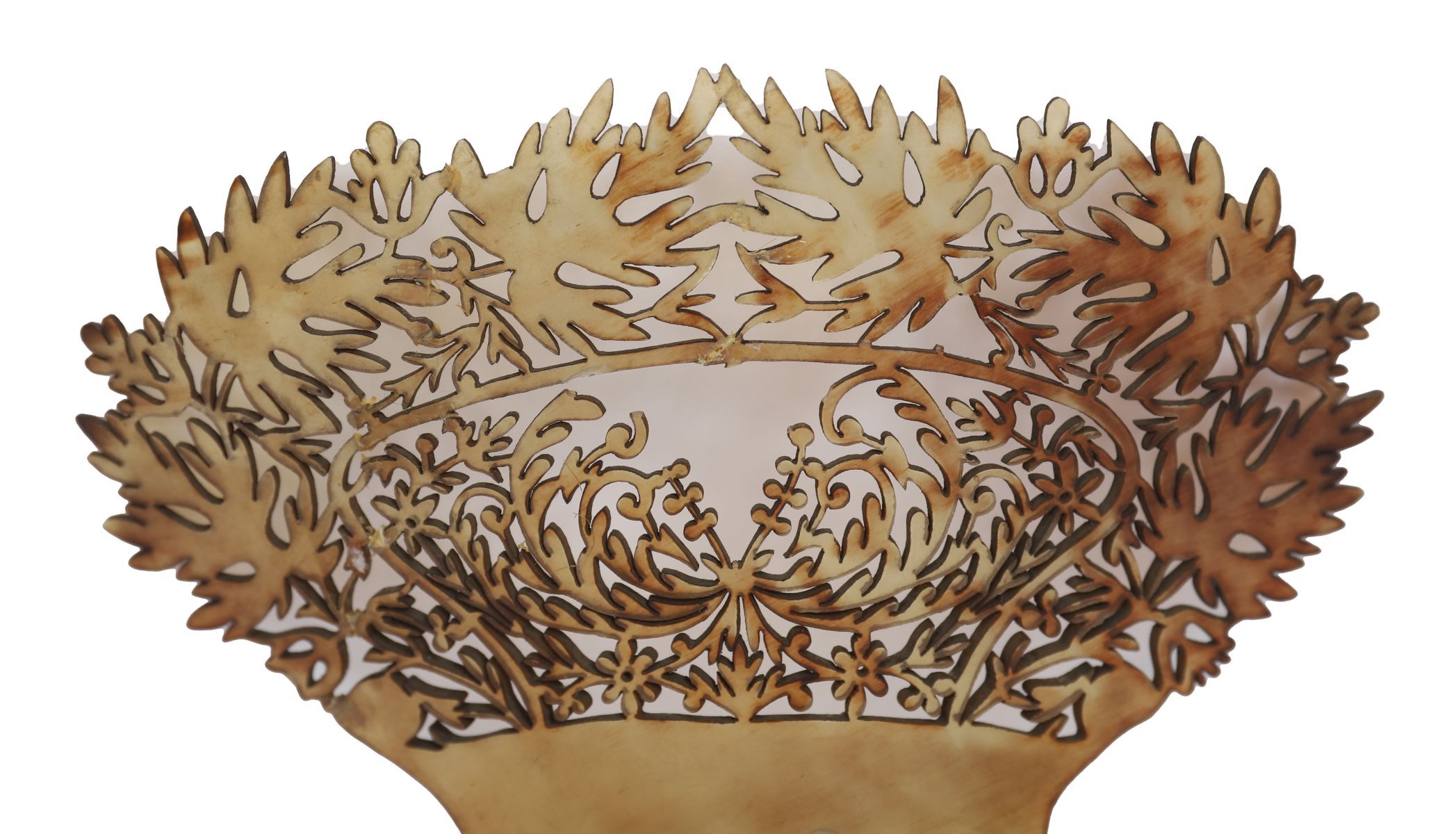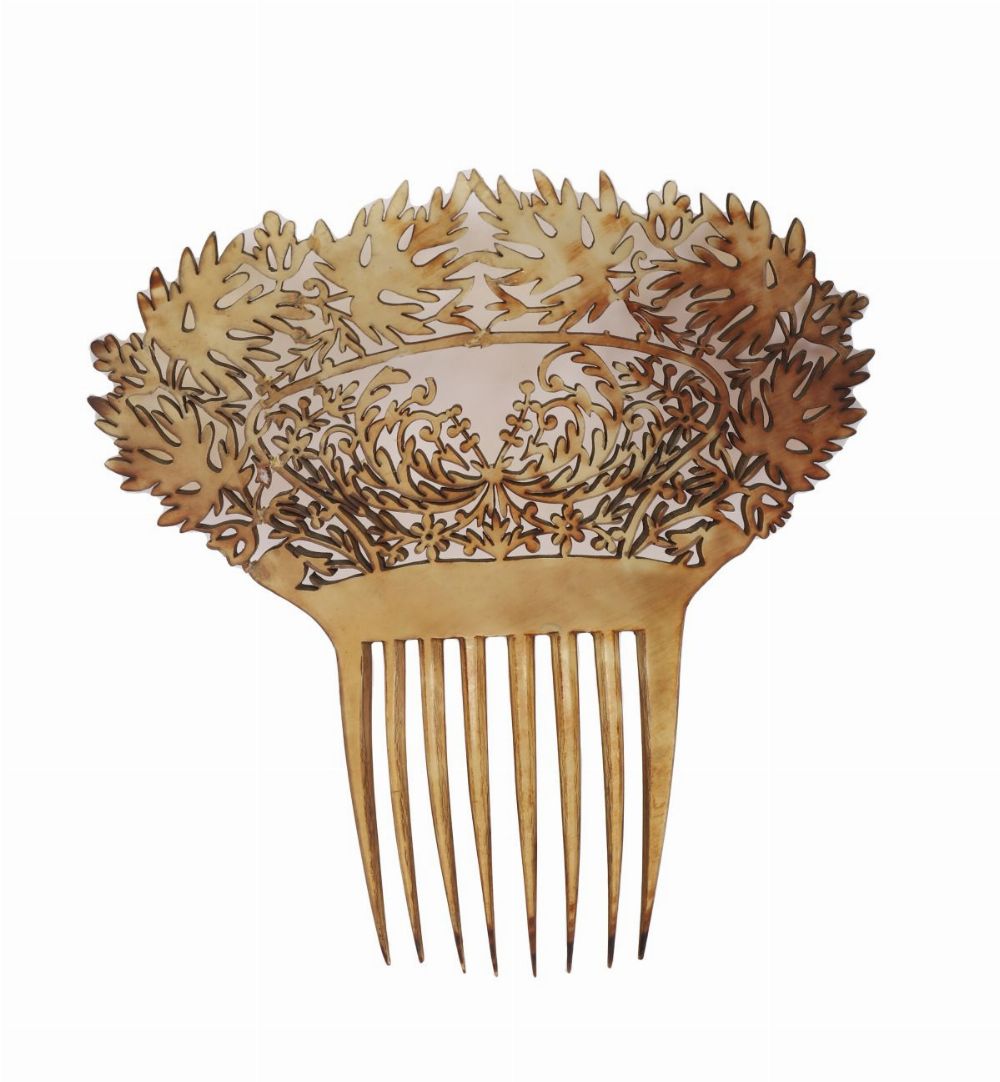 The arched crest pierced and carved with scrolling foliate ornament, above a row of long tapering teeth. The warm translucency and fine workmanship are typical of fashionable Continental hair ornaments of the mid-to-late 19th century.