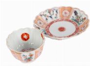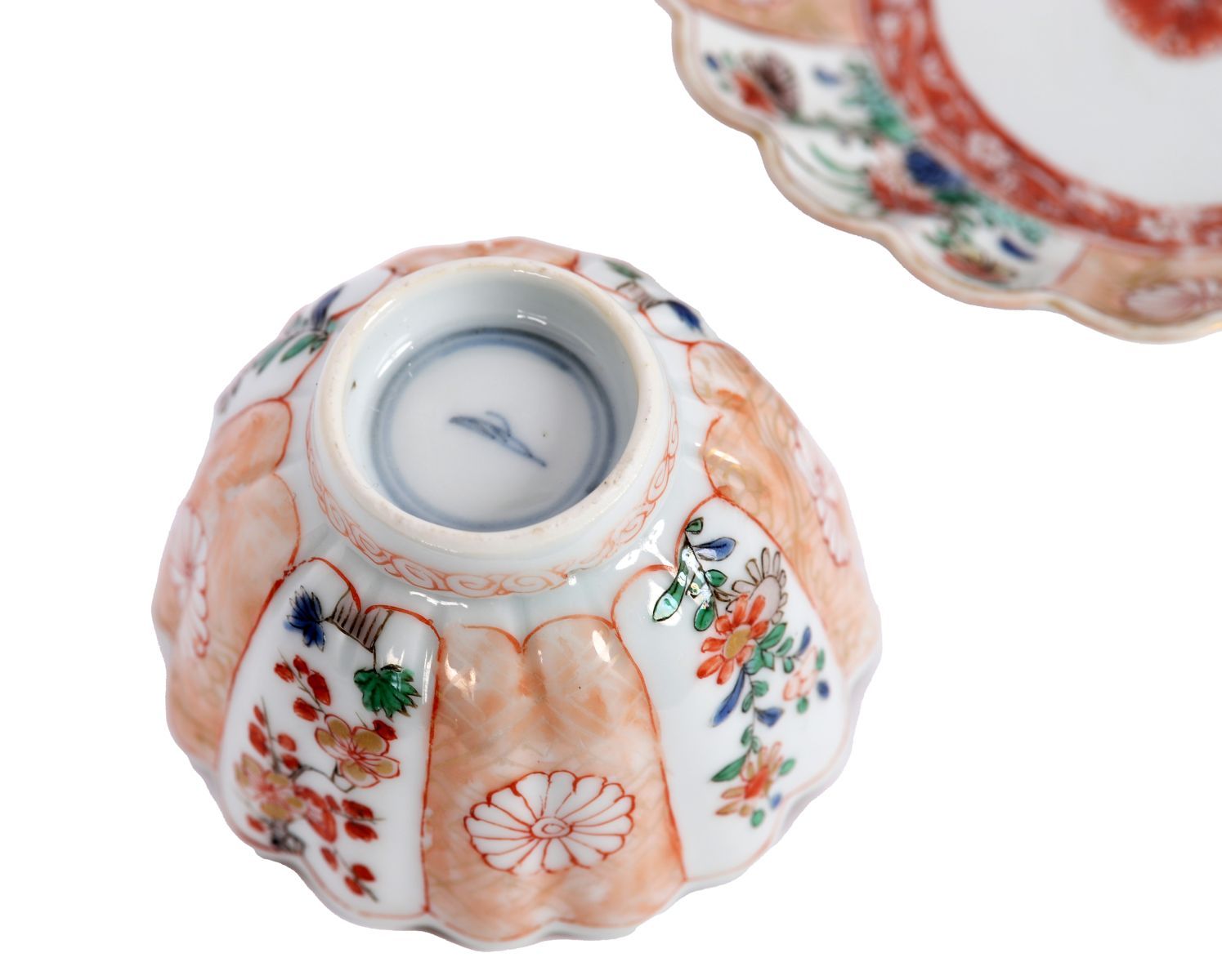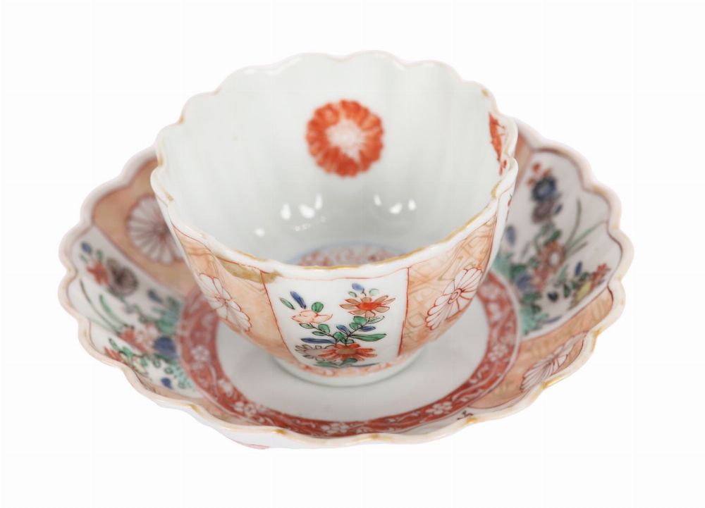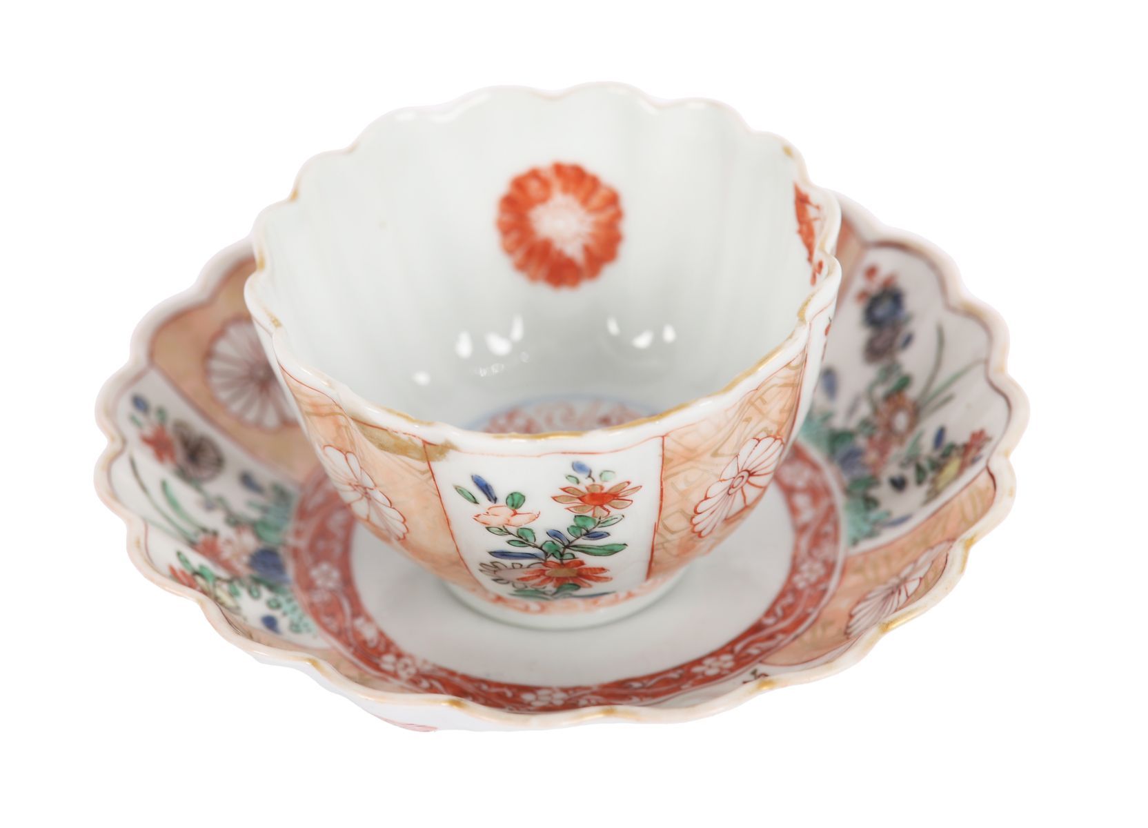 The lobed tea bowl decorated externally with alternating panels of chrysanthemums, stylised floral sprays and geometric diaper work in underglaze blue, iron-red, green and gilt, the interior centred by a chrysanthemum roundel within an iron-red and gilt border. The conforming lobed saucer similarly decorated, centred by a chrysanthemum medallion. Both with scalloped rims and neatly finished foot rims, the base with a simple underglaze blue mark.