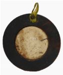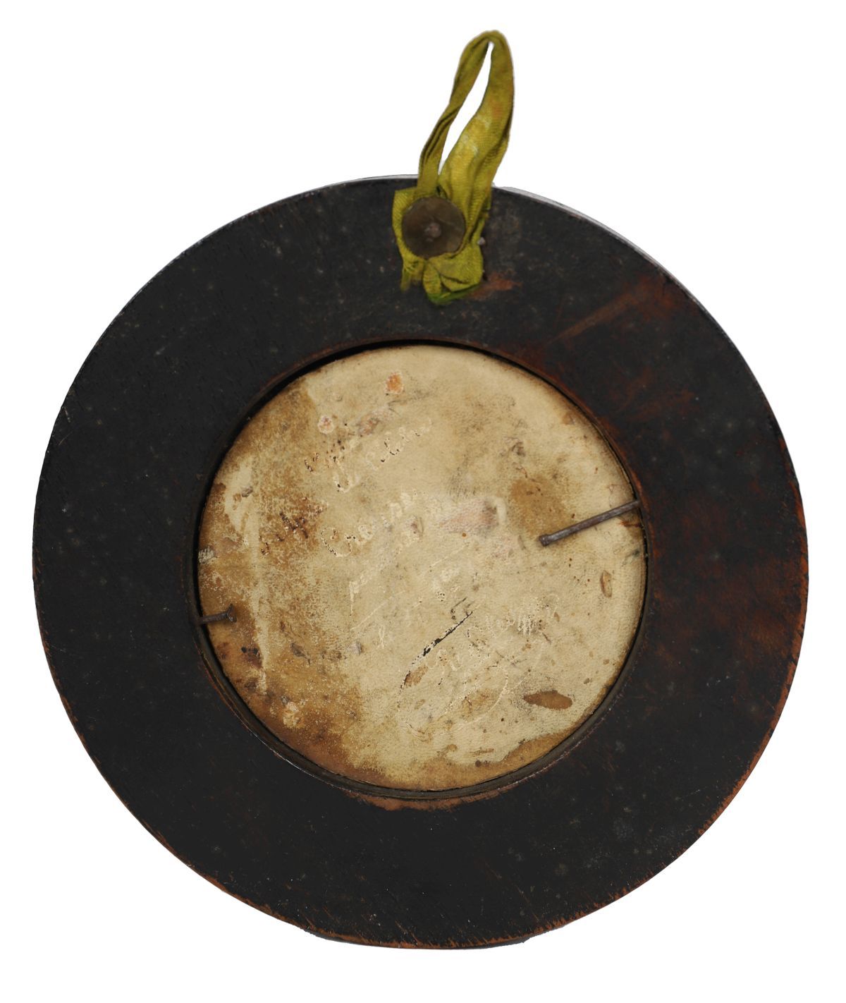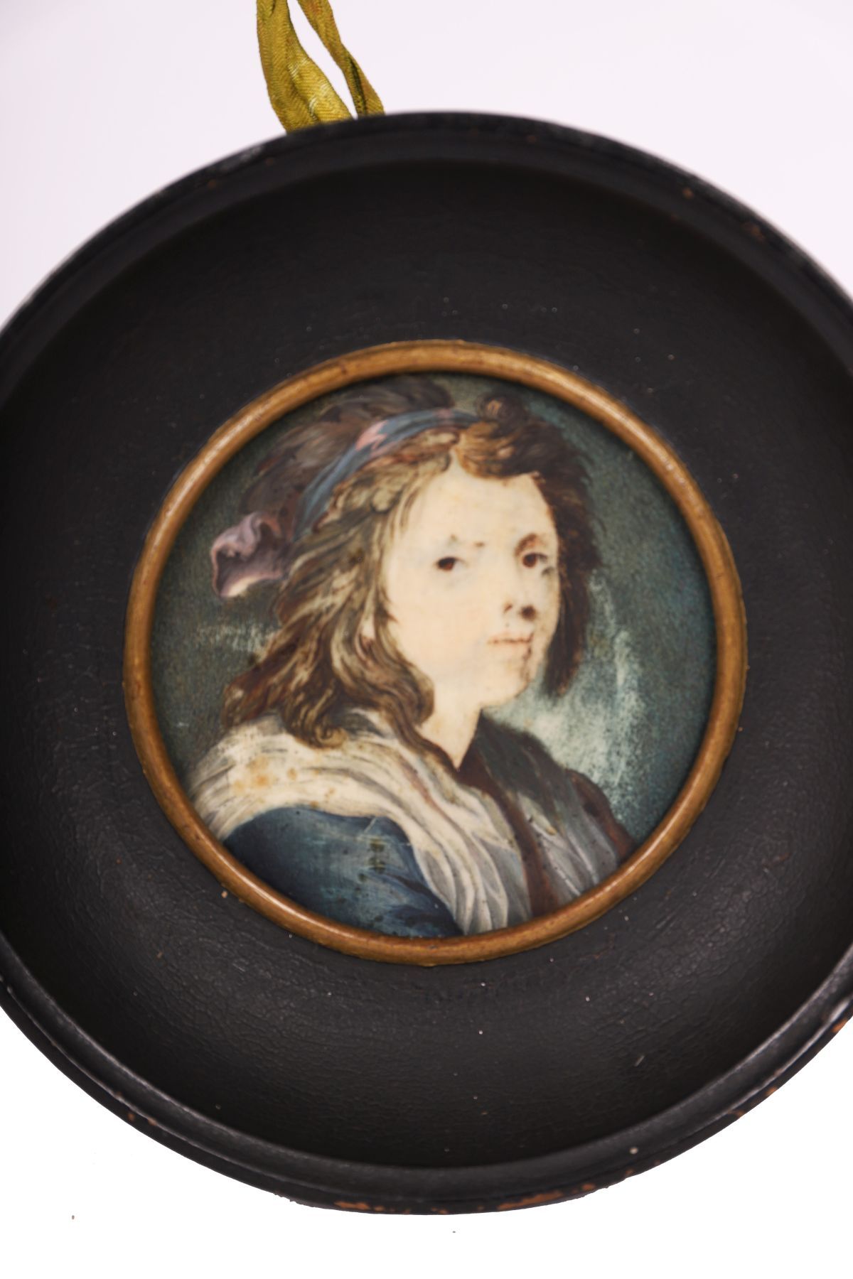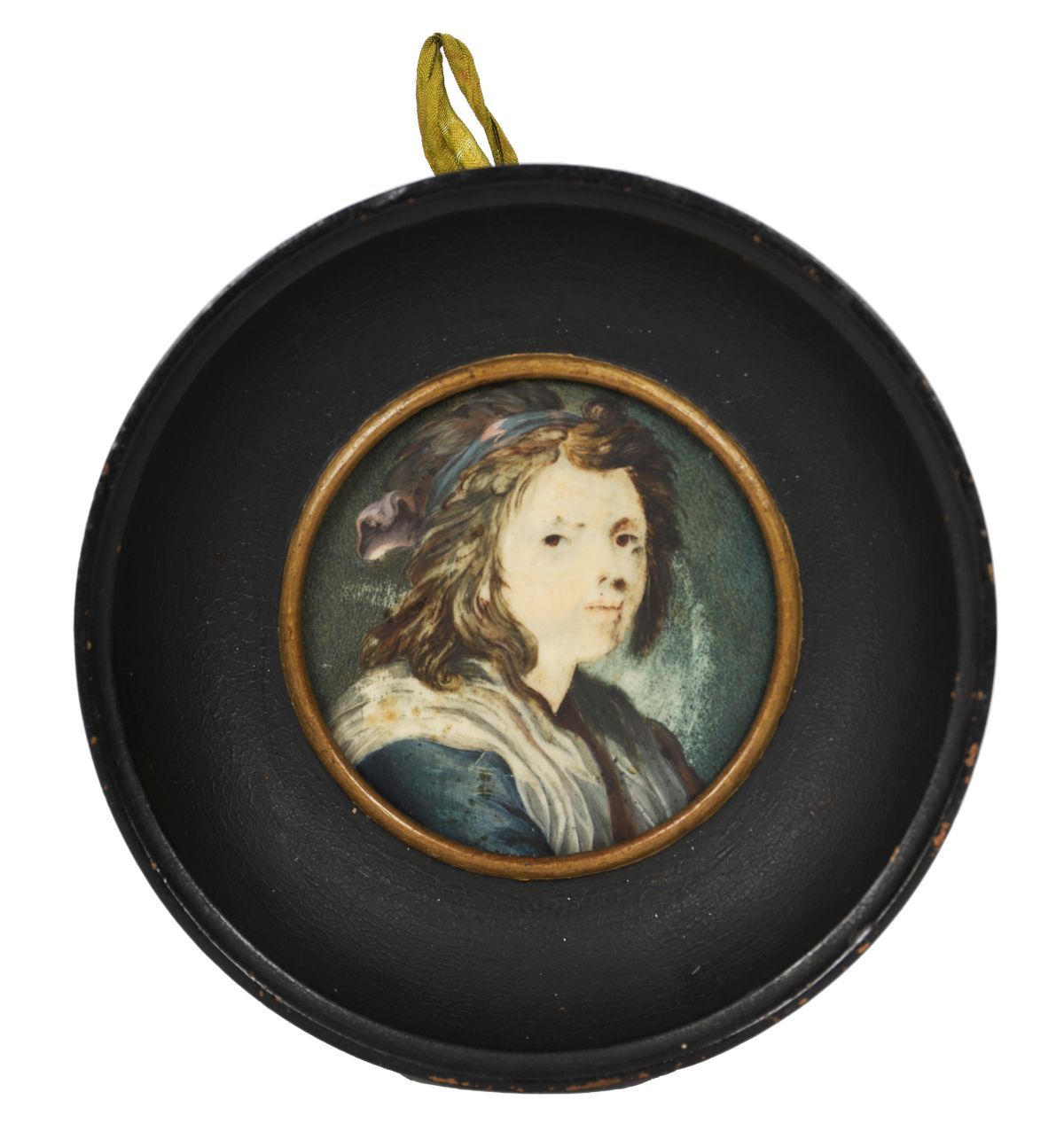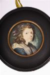 A circular portrait miniature, 7.5 cm diameter, depicting a young figure in three-quarter profile, wearing a headscarf and draped costume, against a muted green ground. Contained within a plain wooden frame, the reverse with an early backing bearing an indistinct inscription.