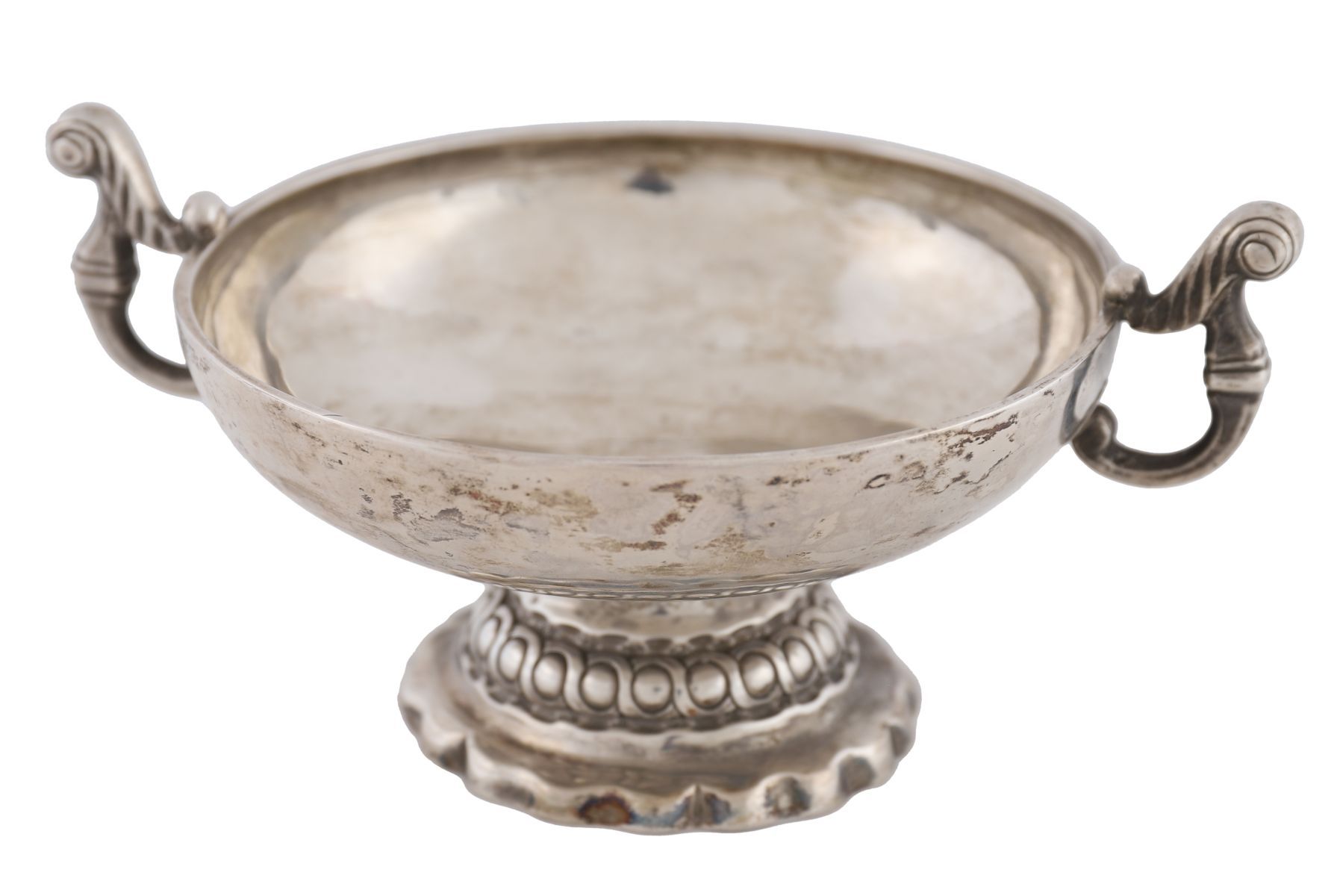 Burgundy, late 18th century, circa 1780, Of shallow circular form with twin scroll handles, raised on a moulded pedestal foot, the bowl engraved to the exterior rim “Theresse F. Serrignyâ€. The exterior plain, the foot with moulded ornament, the underside struck with French pre-Revolutionary provincial silver marks, including a charge mark and maker’s punch (indistinct). The engraved name suggests personal ownership, possibly relating to the Serrigny family of Burgundy and potentially associated with the Château de Serrigny, Côte-d’Or. No further inscriptions.