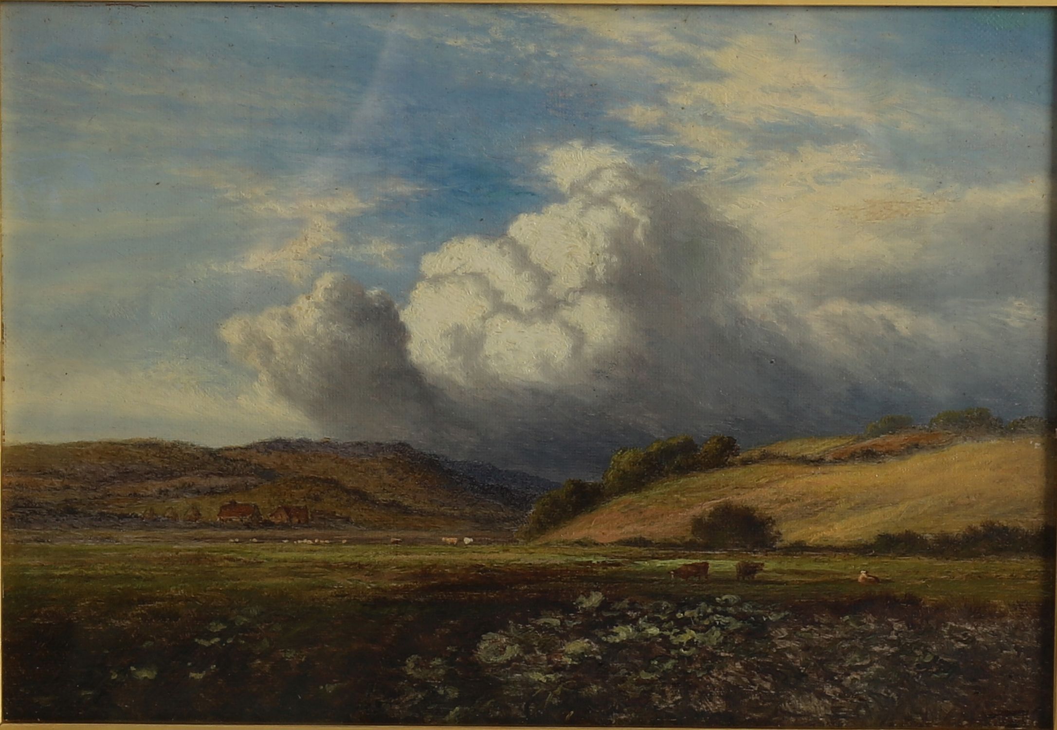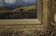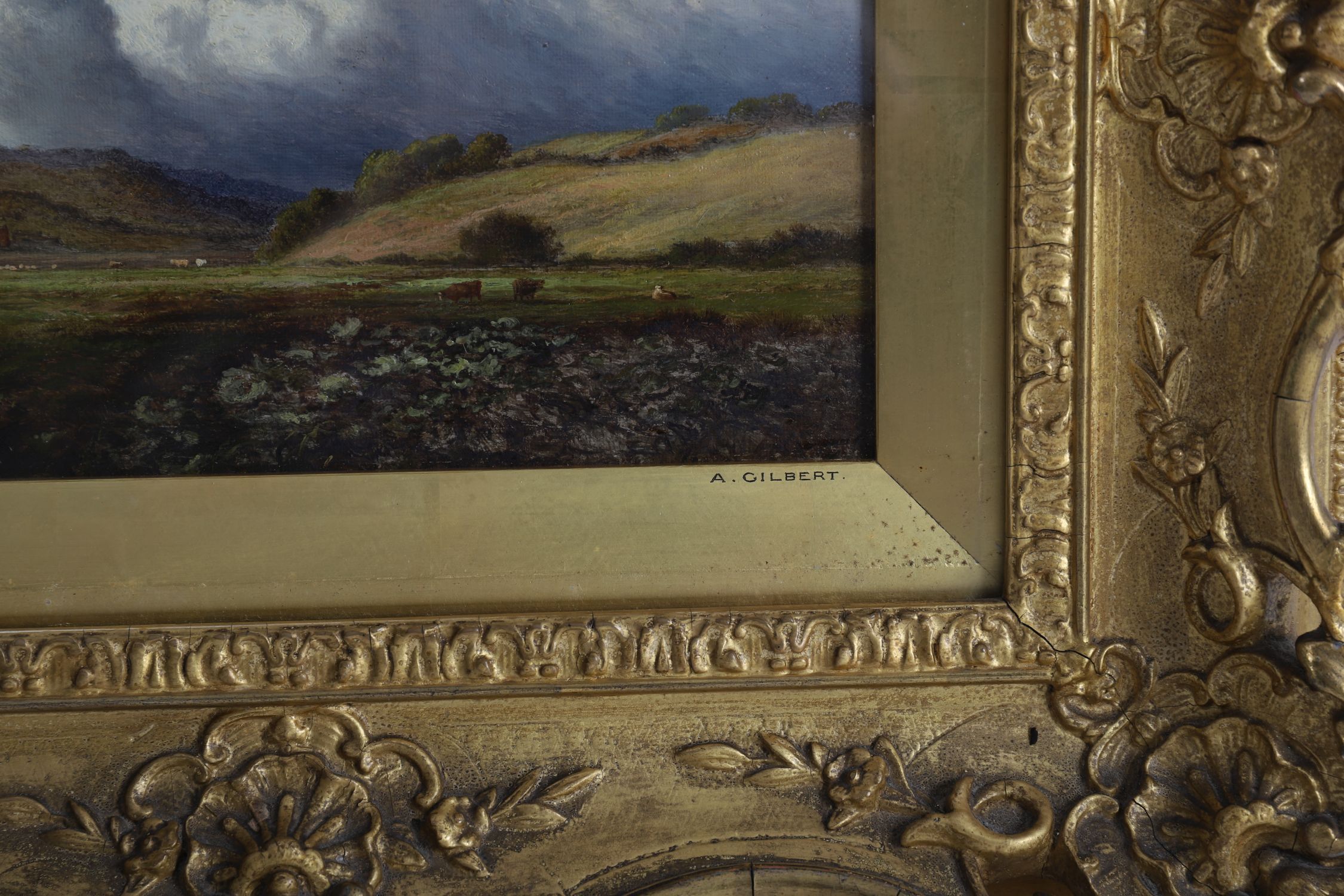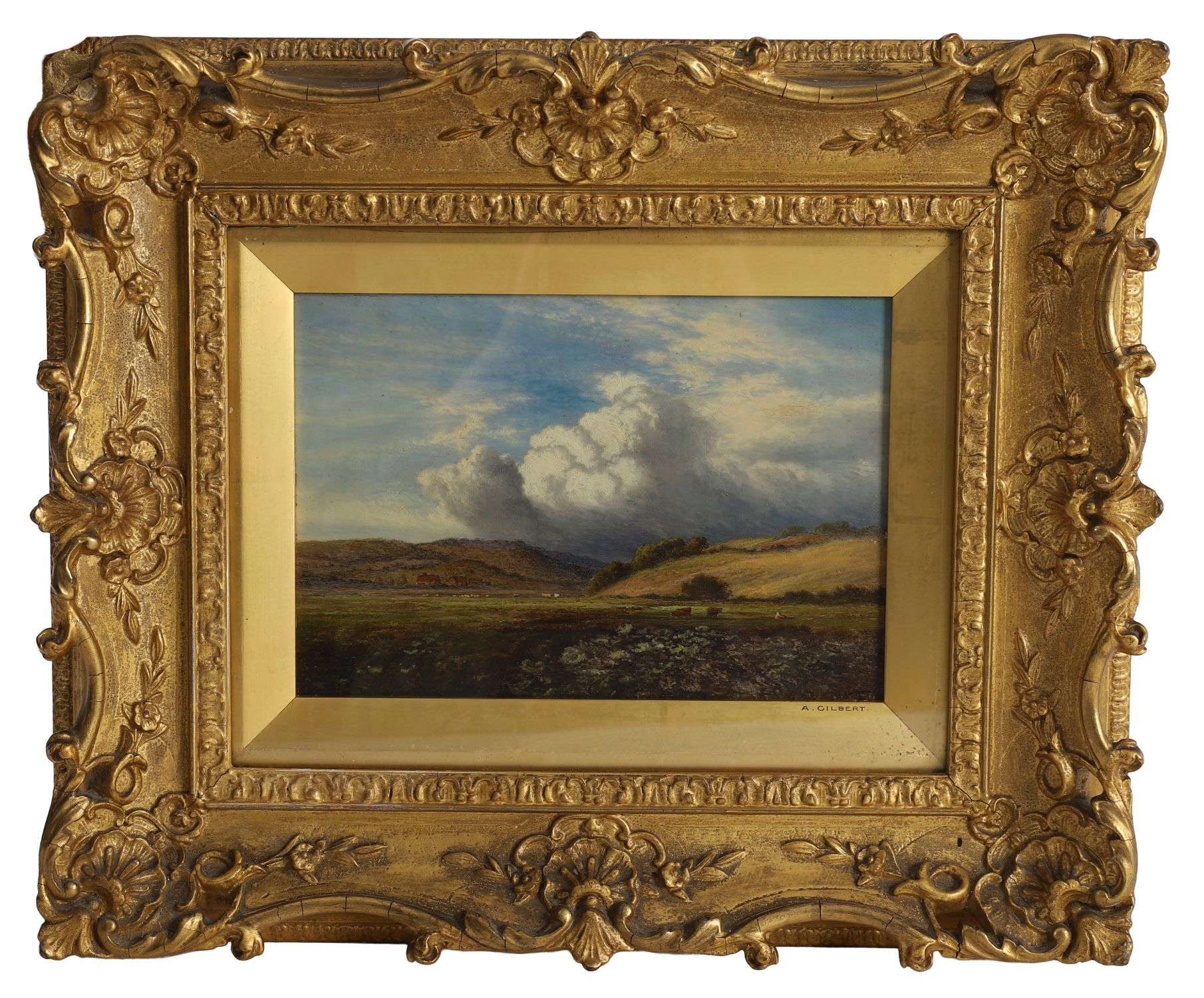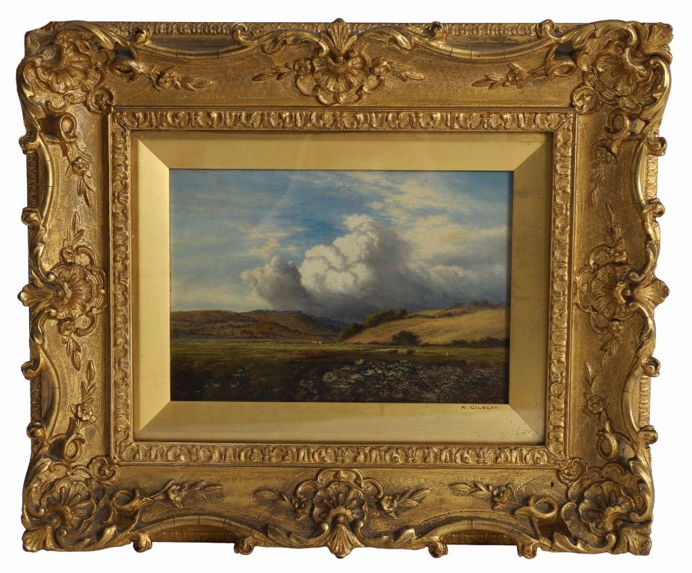 A. Gilbert, oil on board, depicting a mountainous landscape under dramatic sky with cumulus clouds. Signed lower right. Presented in a richly carved gilt frame.