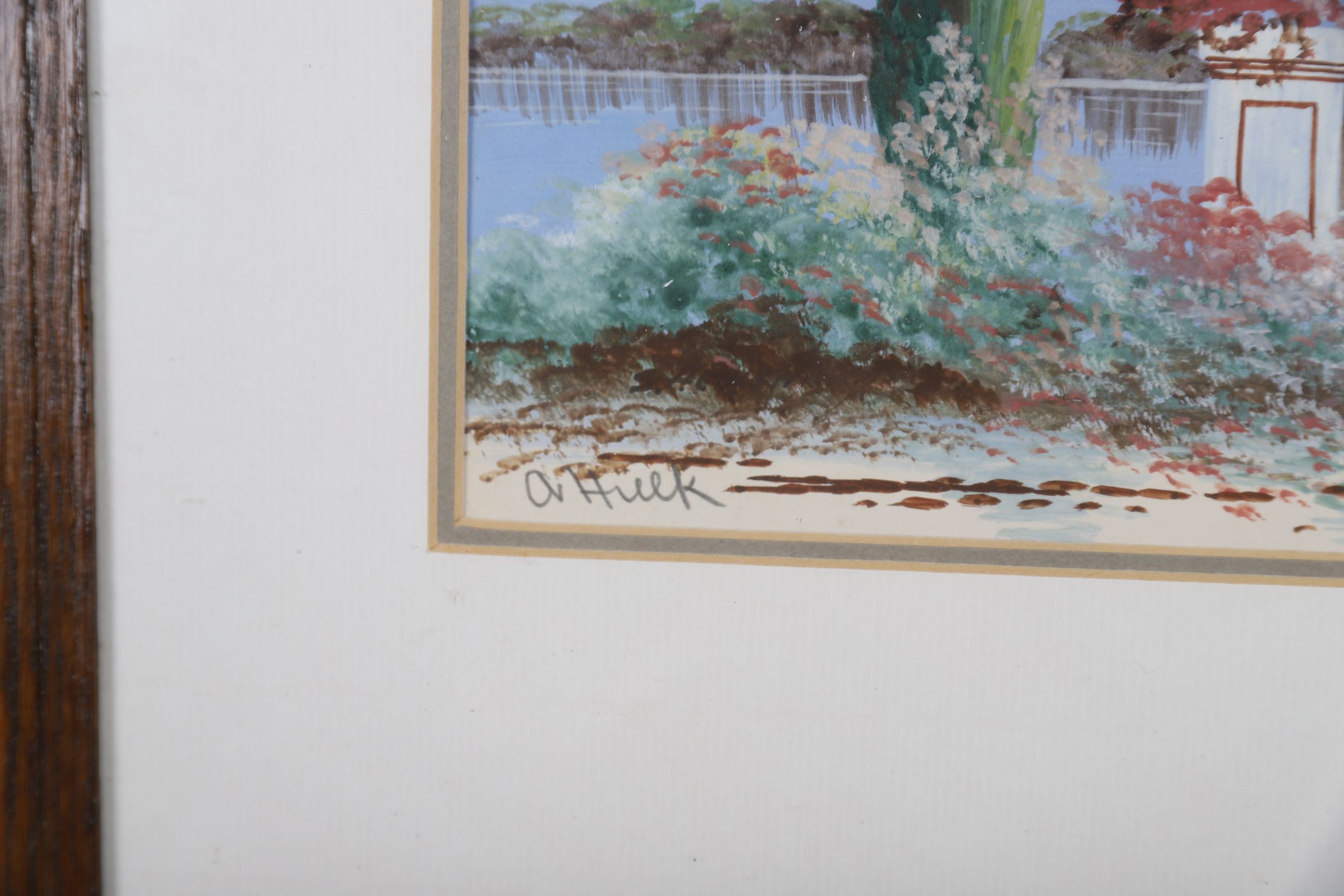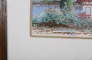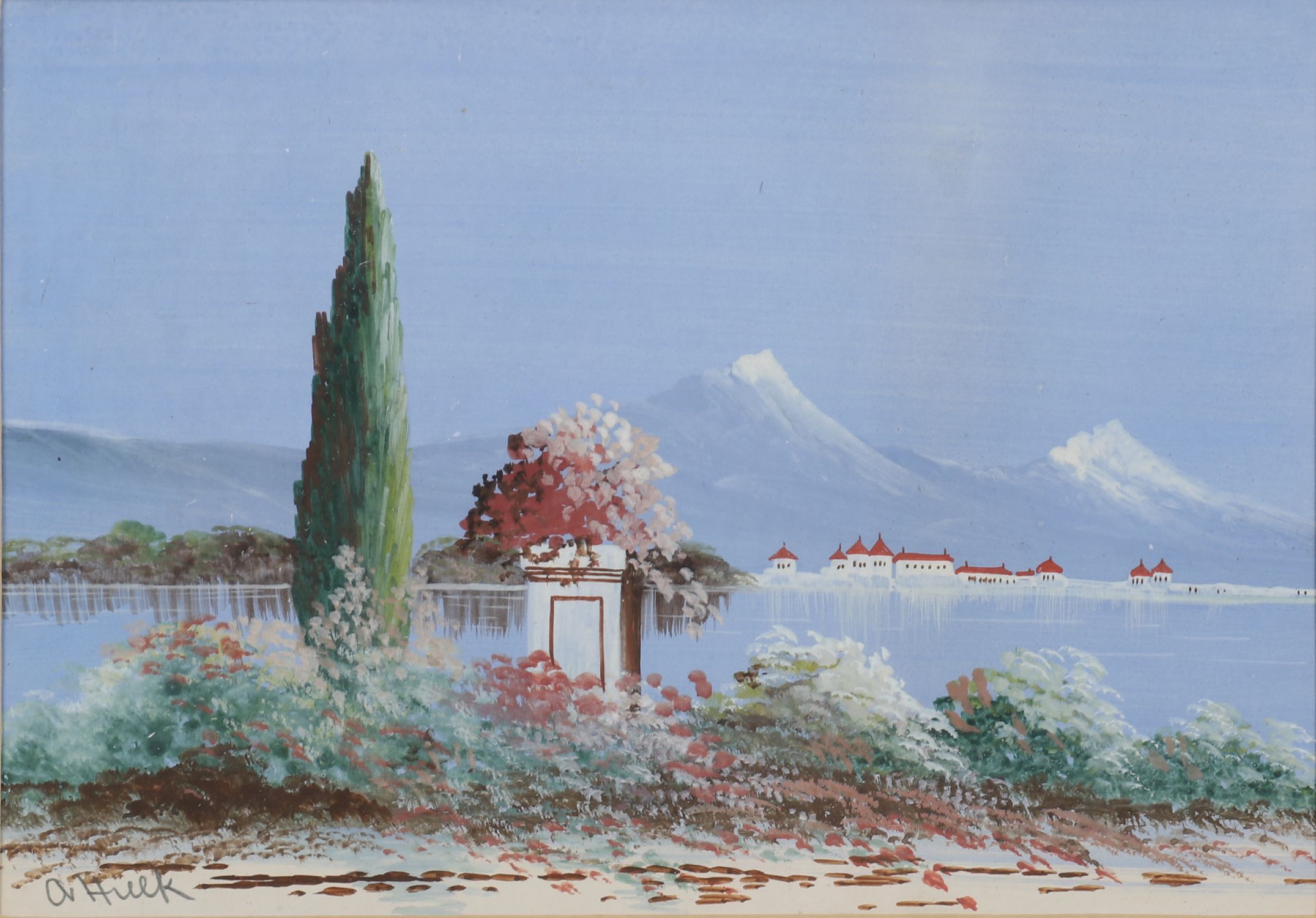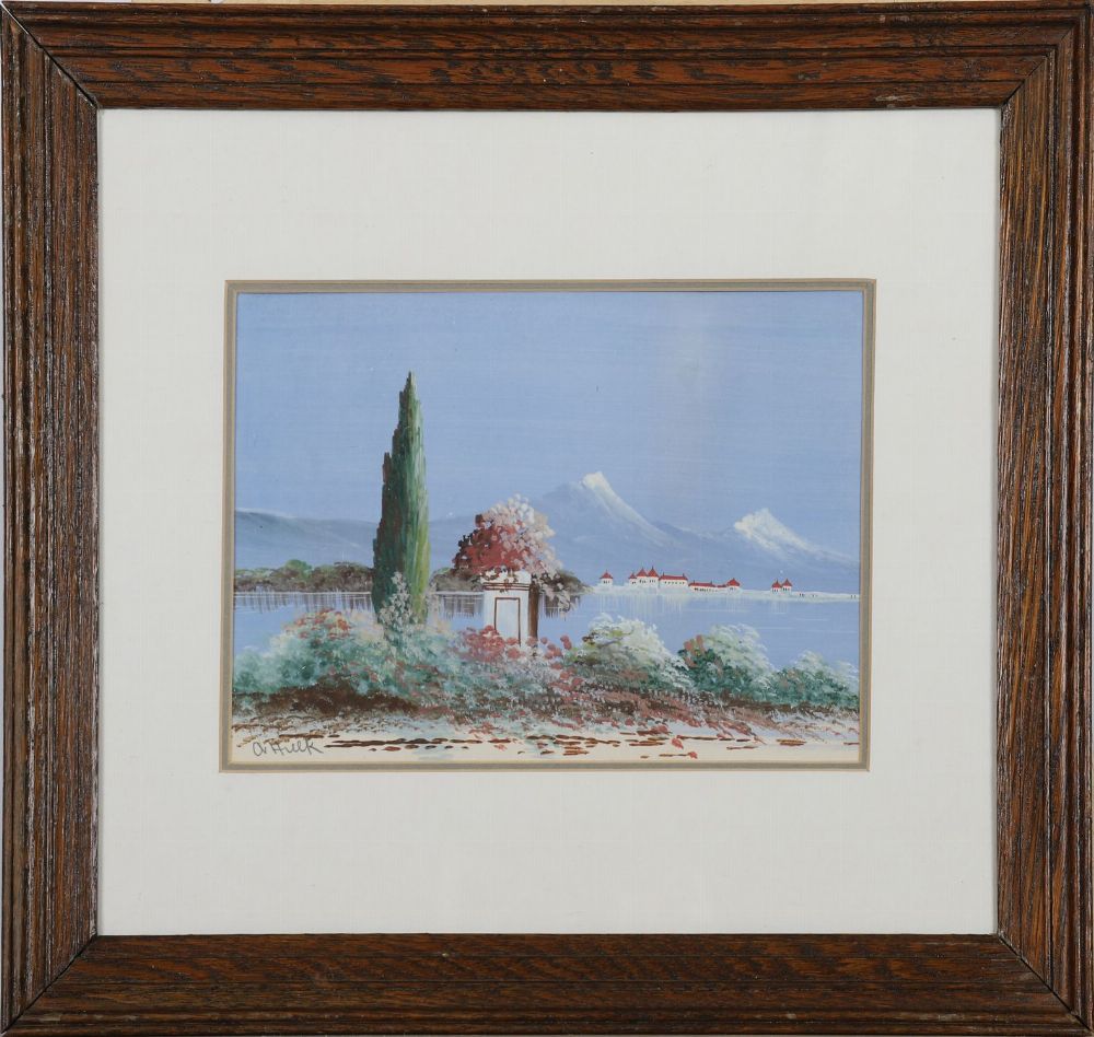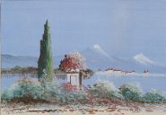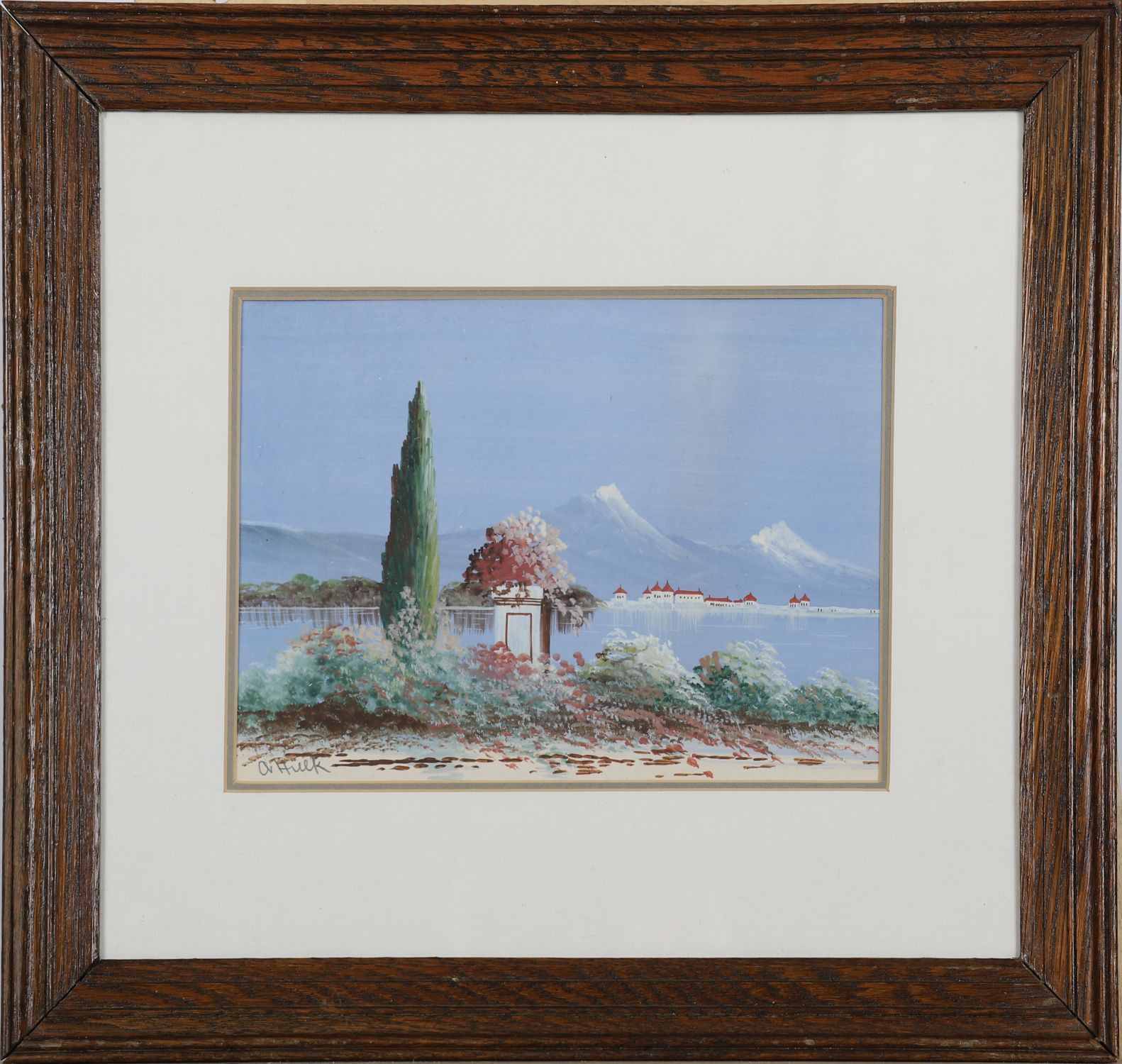 A view of a landscaped terrace with flowering shrubs and a cypress, overlooking a lake with mountains beyond. Signed lower left. Presented in a glazed oak frame. Watercolour.
