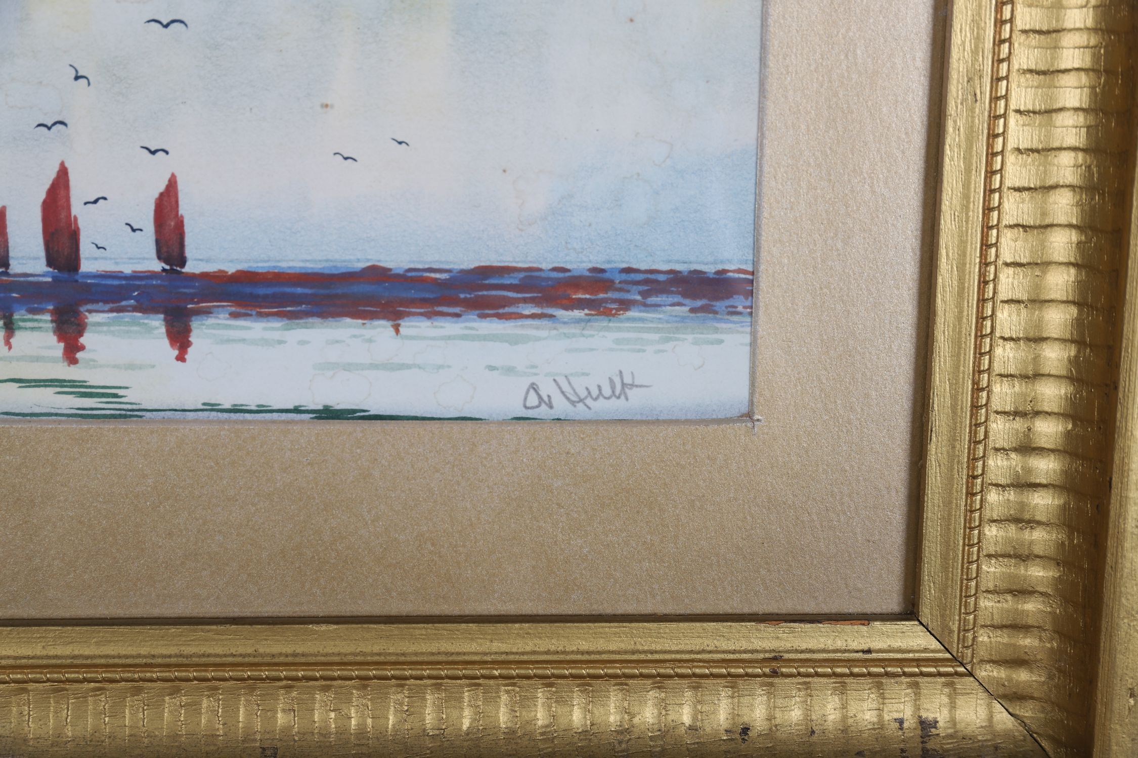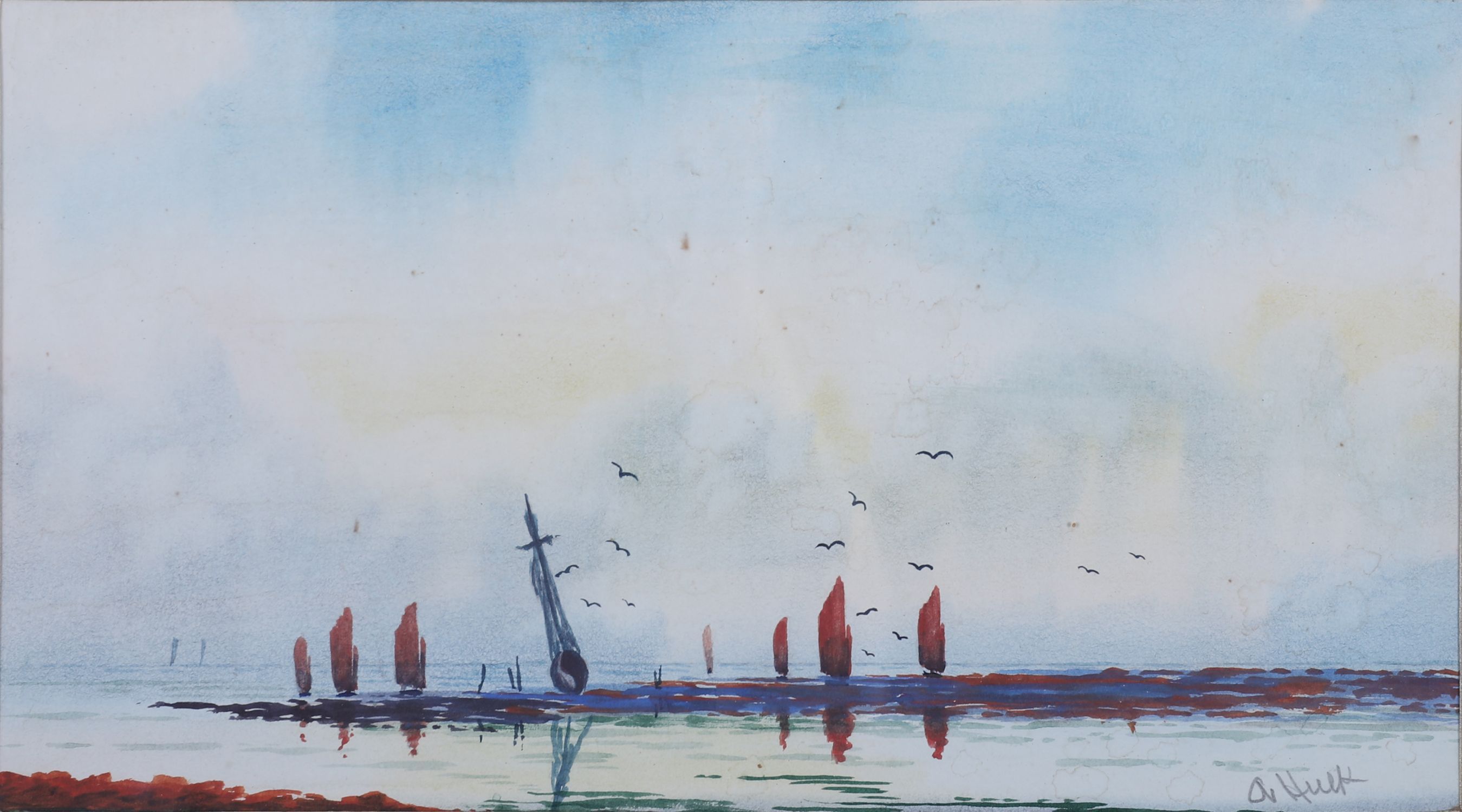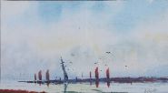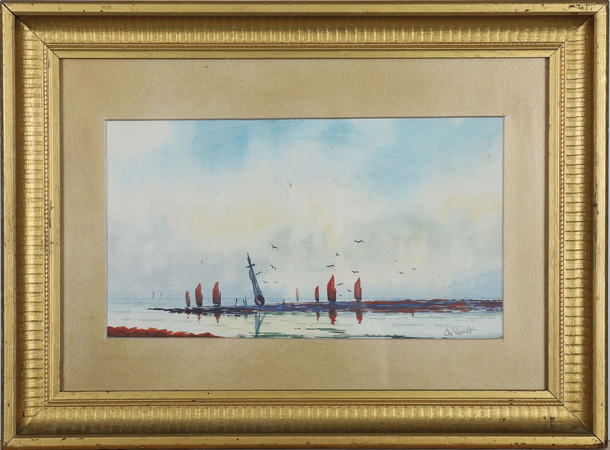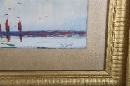 A framed watercolour depicting a coastal view with multiple, red-sailed boats on calm waters, with birds flying above. Signed lower right. Presented in a gilt frame. Watercolour.