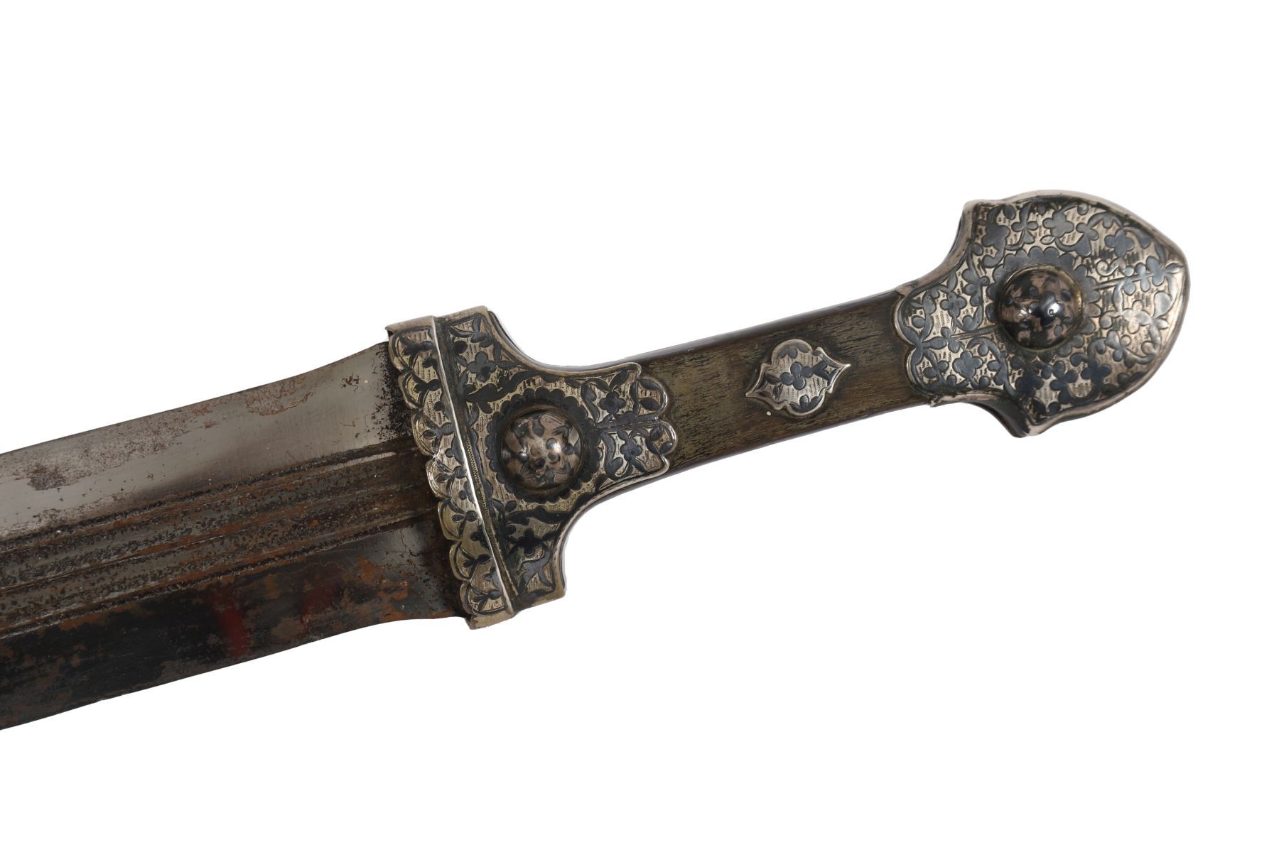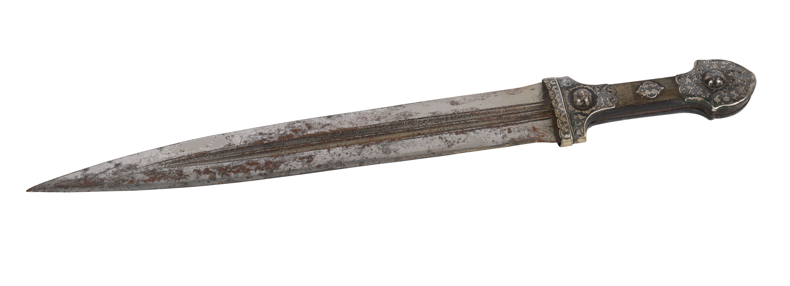 A 19th century Caucasian kindjal with tapering double-edged fullered steel blade, the hilt mounted in silver with waisted grip and two applied domed bosses, richly decorated in repoussé and niello with scrolling vegetal interlace and foliate ornament. The form and decoration are characteristic of Georgian or Dagestani workmanship of the North Caucasus.