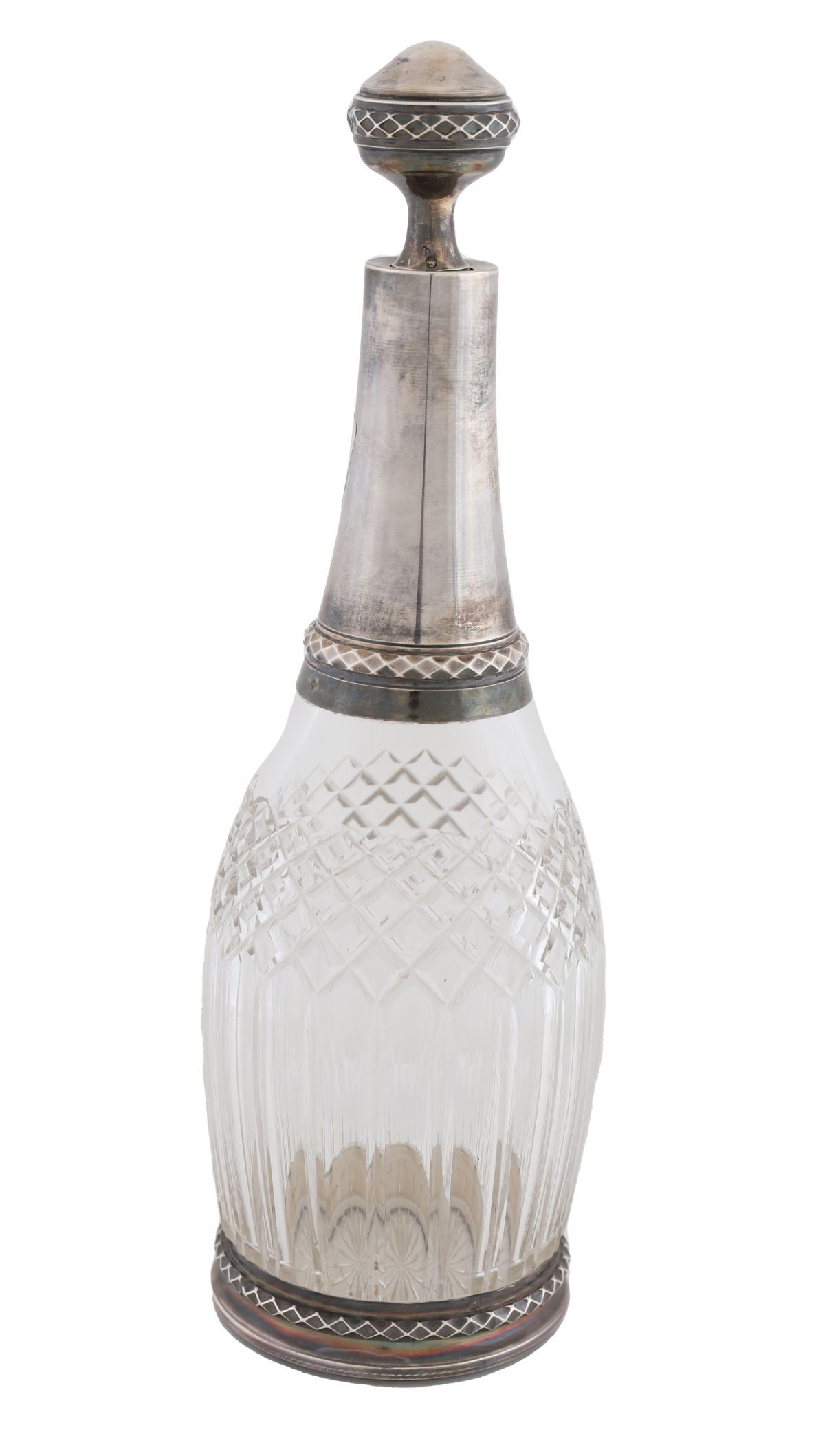 The baluster body cut with diamond patterning, fitted with silver mounts to the neck and base, and retaining its original faceted stopper. The form and capacity suggest use as a wine or claret decanter rather than a spirit bottle.
