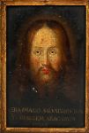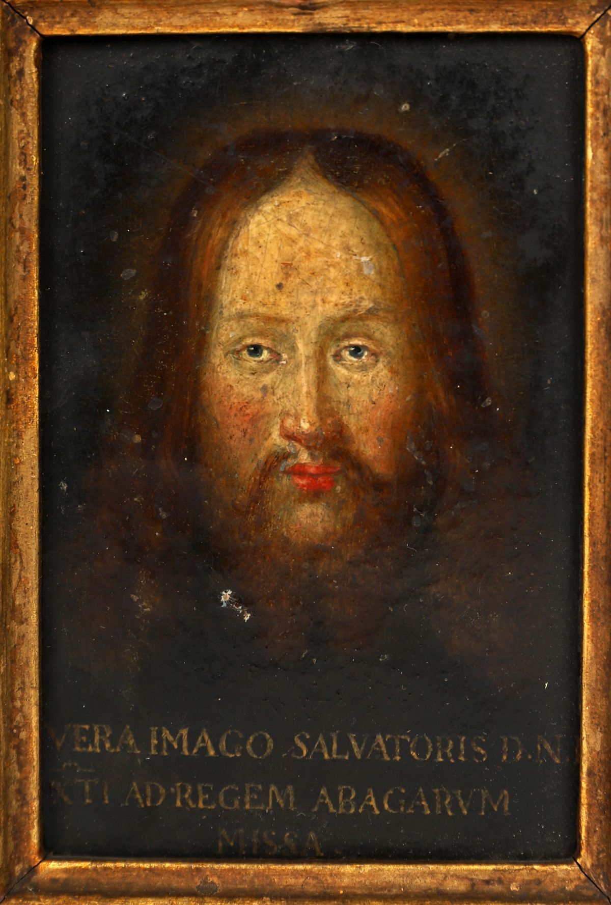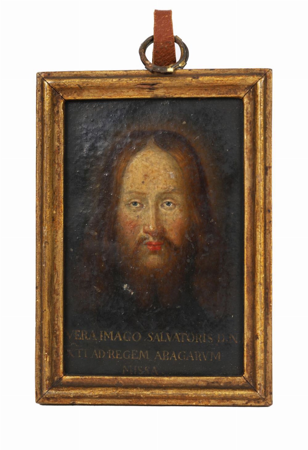 Rectangular miniature depicting the head of Christ, painted frontally against a dark ground, with long hair and beard, the features rendered with solemn restraint. Along the lower edge appears a Latin inscription beginning “Vera Imago Salvatoris…”, identifying the image as a devotional representation of the true likeness of the Saviour.