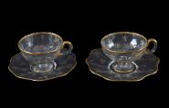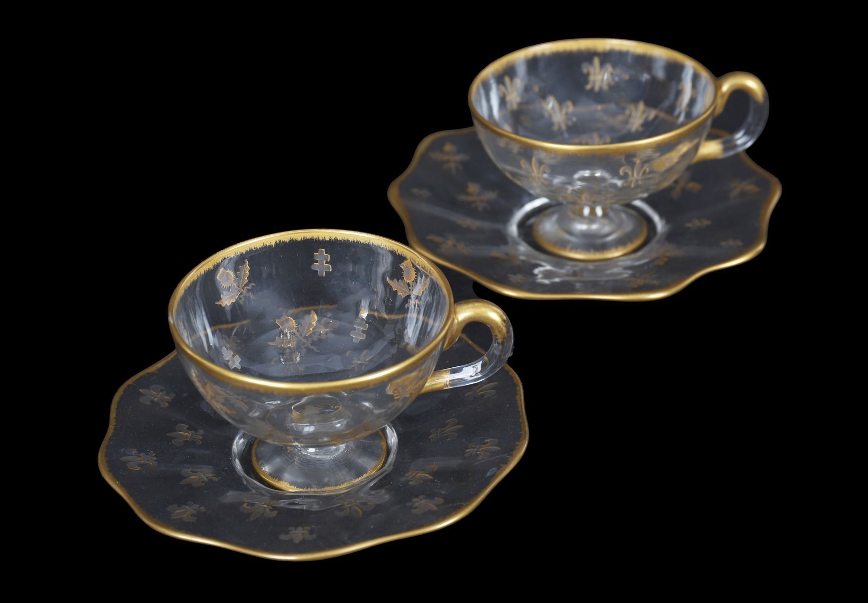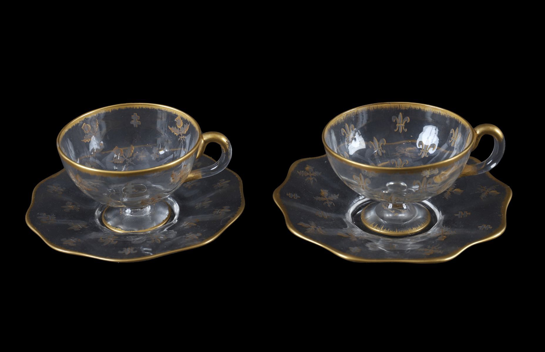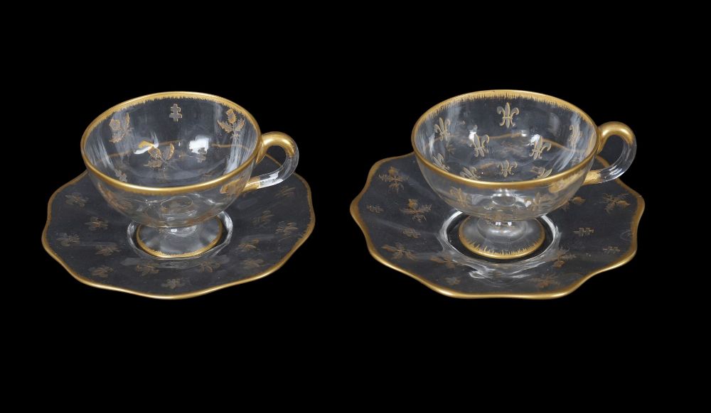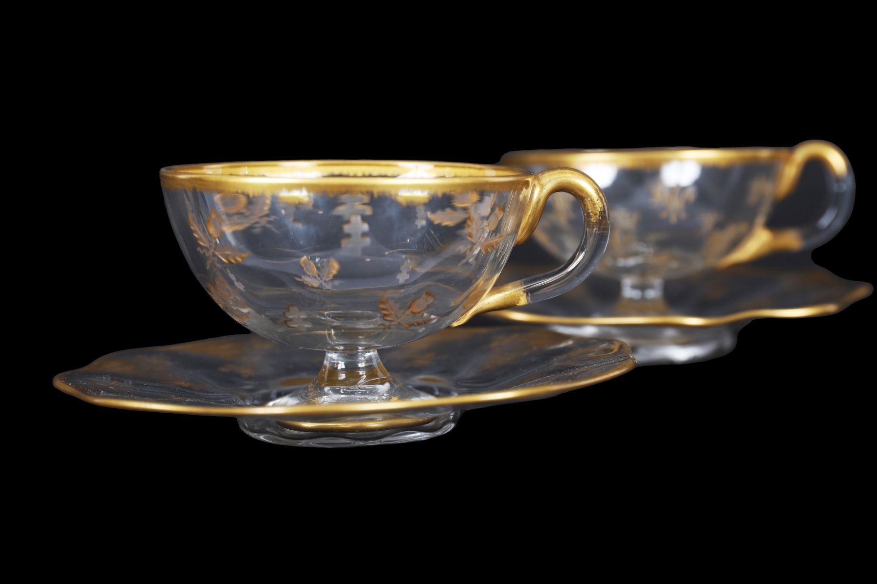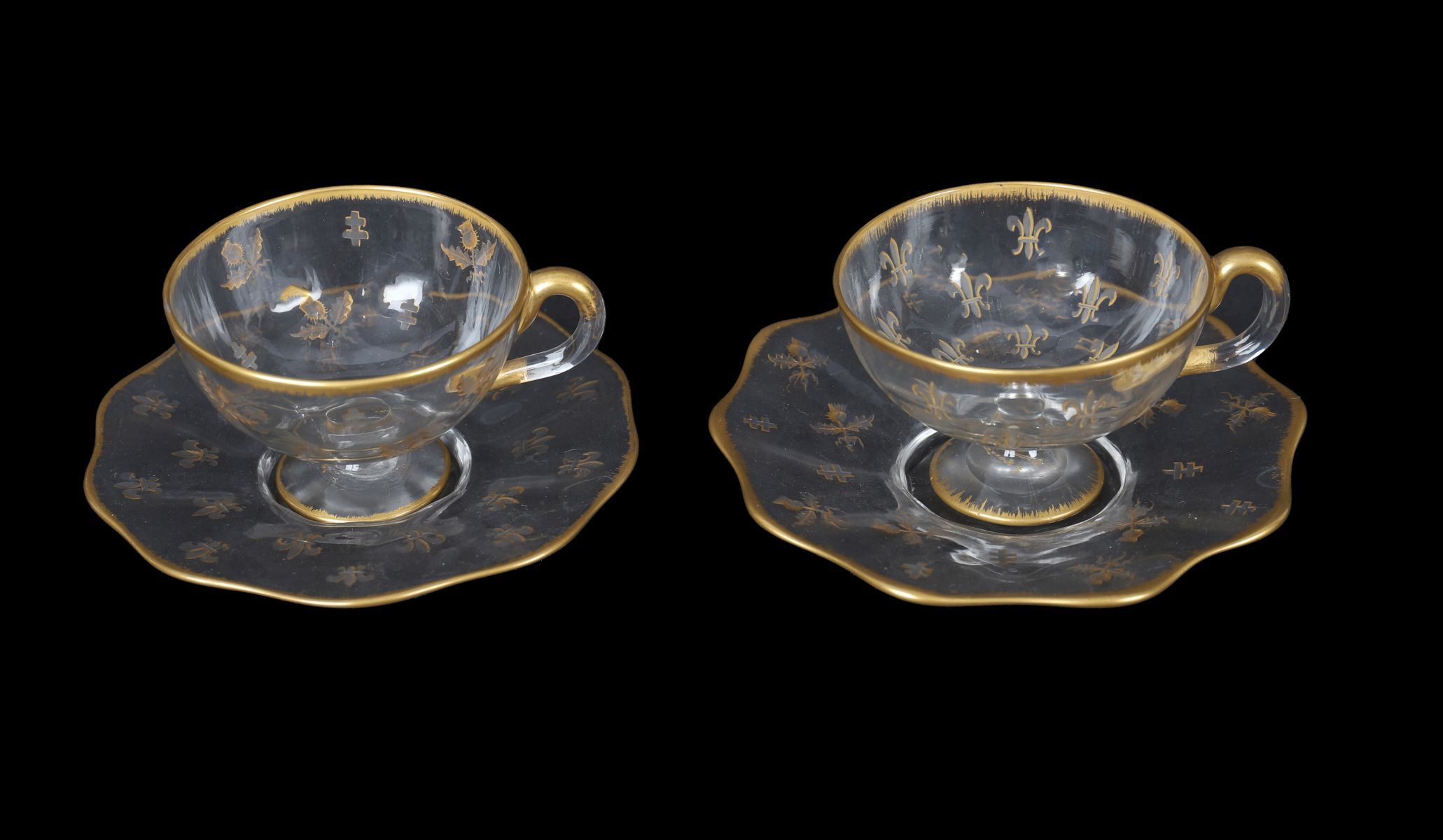 Lot 20 A PAIR OF DAUM NANCY PARCEL-GILT GLASS CUPS AND SAUCERS