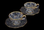 France, late 19th / early 20th century. Each cup and saucer of shaped circular form, the glass acid-etched and enamelled with floral motifs, with parcel-gilt rims and highlights. A matched pair.