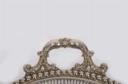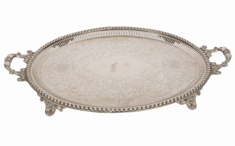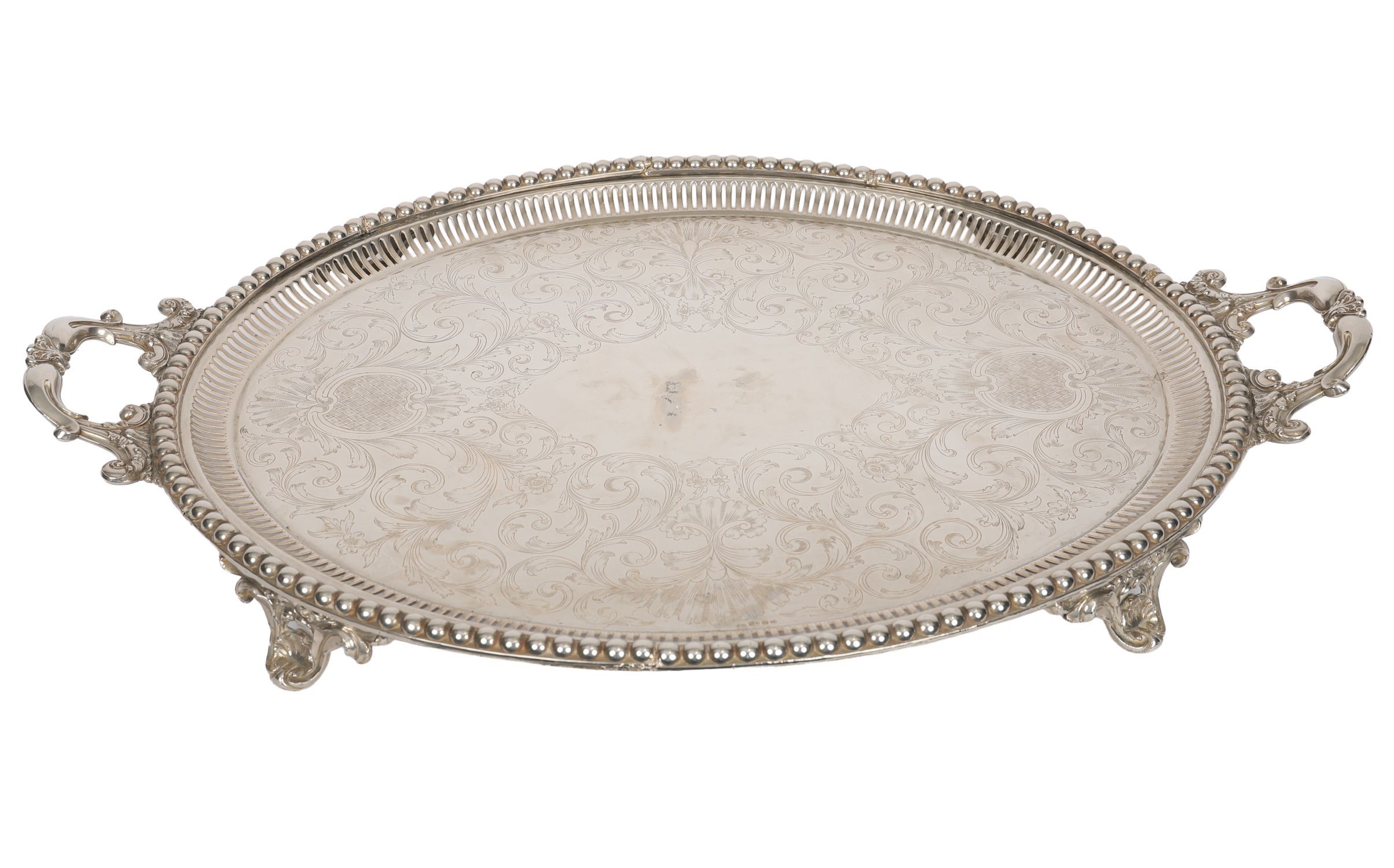 Of oval form with beaded rim and finely chased foliate scroll decoration to the surface, centred by a vacant cartouche. Raised on four cast scroll feet and fitted with ornate foliate-cast handles. An impressive example of Victorian silver plate, suitable for display or service.