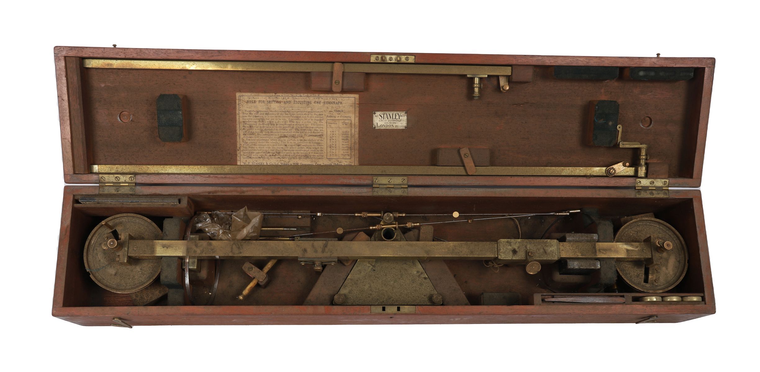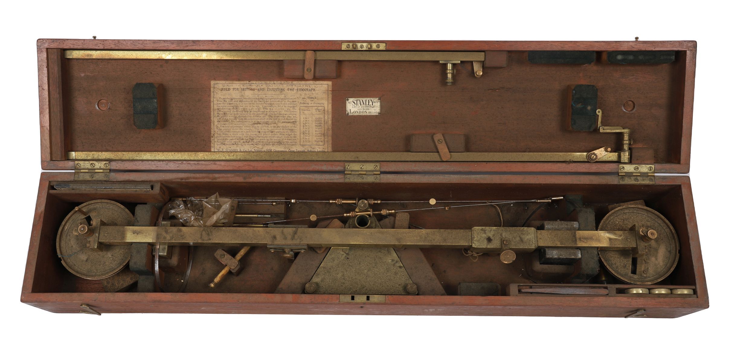 the apparatus for enlarging or reducing proportions, in original case with long and short bar extensions, heavy brass base, ivory wheel, and accessories, case with printed operating instructions and maker's plaque to underside of hinged lid,