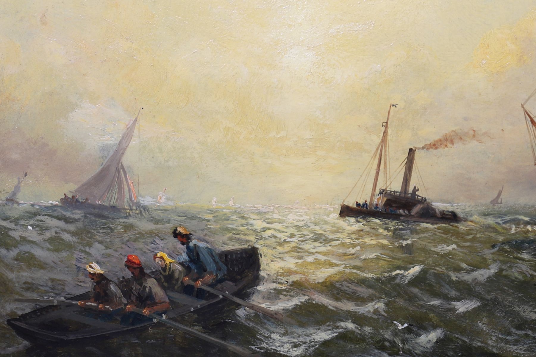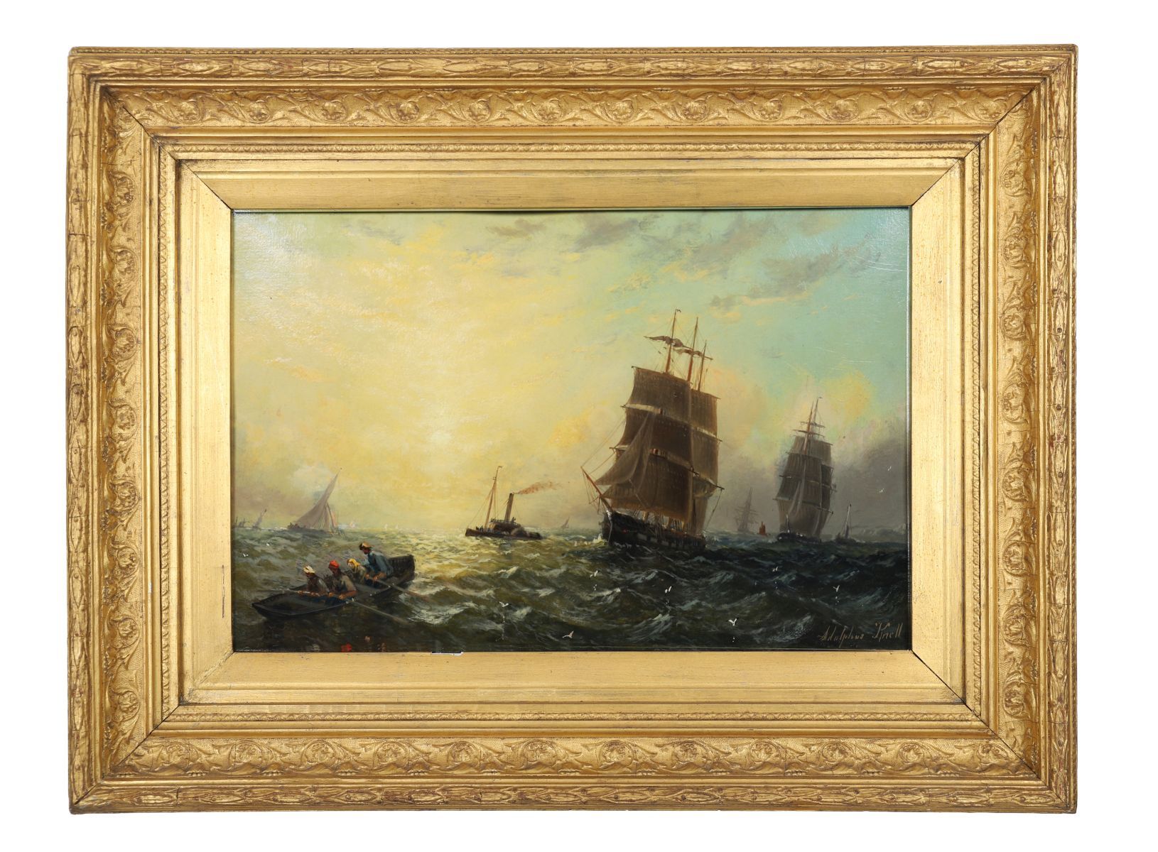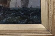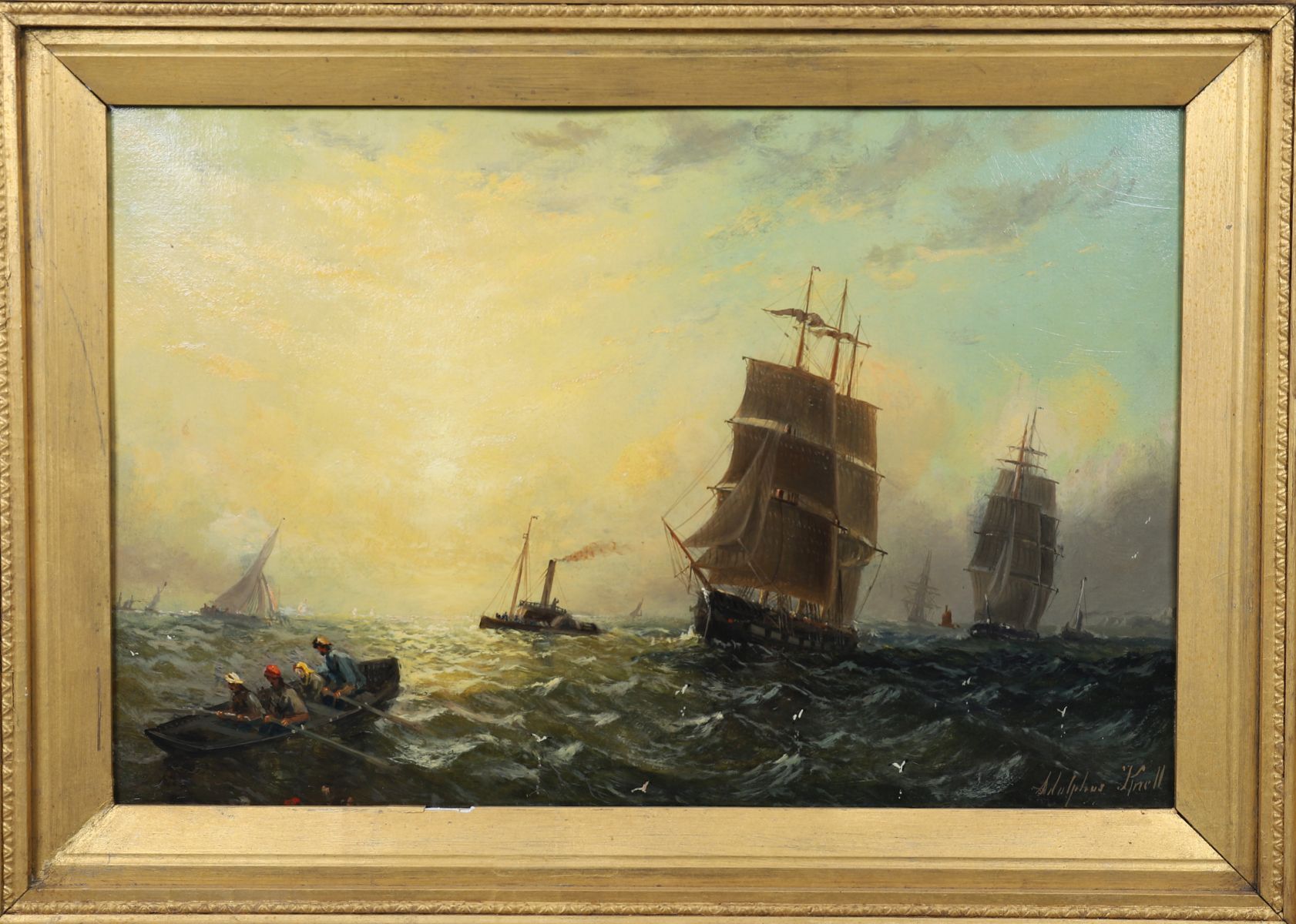 Coastal marine oil on board depicting sailing vessels returning to harbour in late afternoon light. Signed lower right. Presented in a gilt frame with scrolling foliate corners.