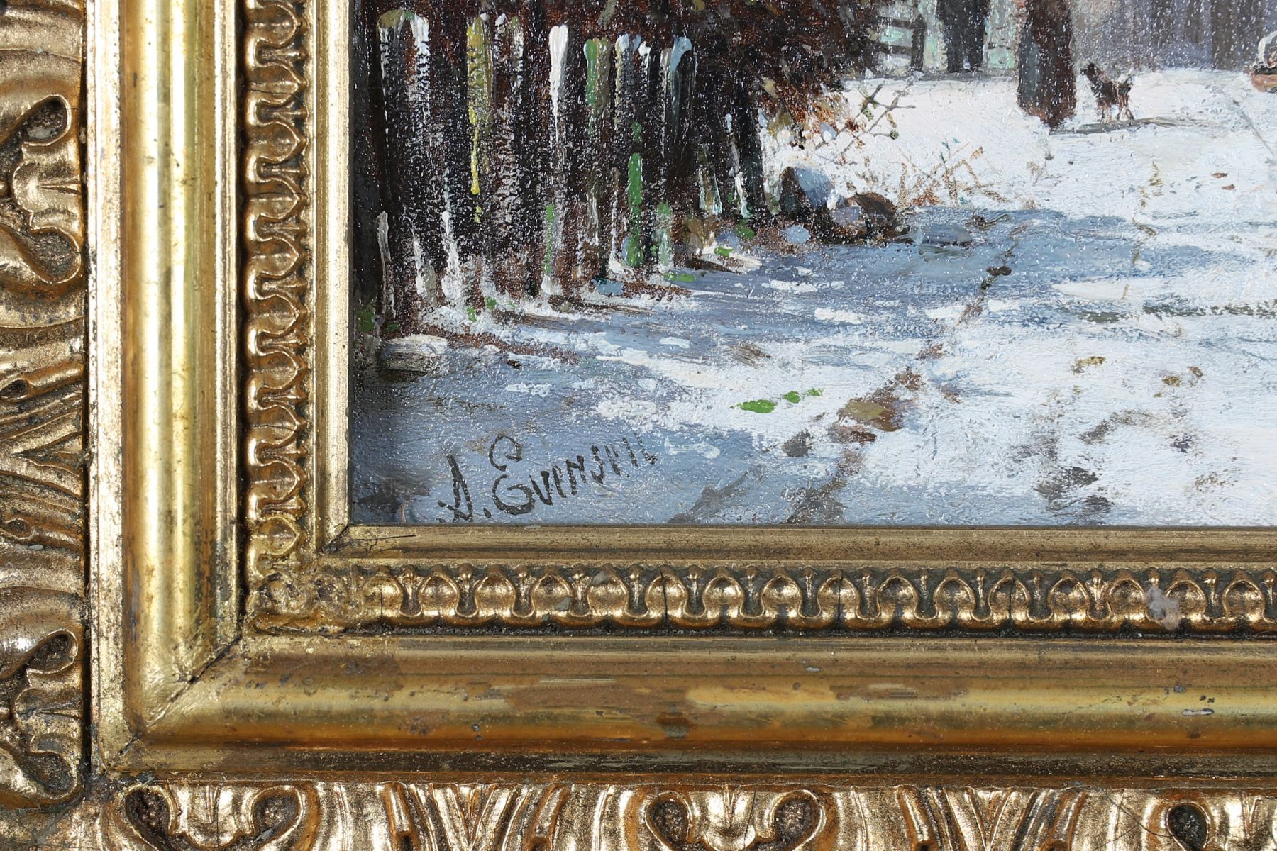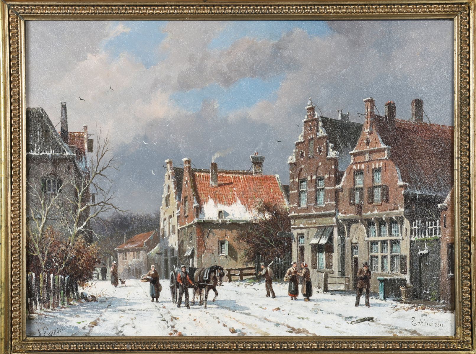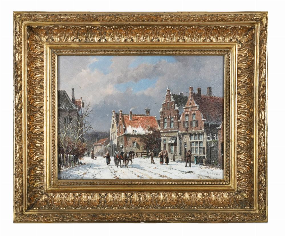 Dutch street scene showing figures walking and conversing on a snow-covered lane lined with gabled houses beneath a bright winter sky. Oil on panel, signed lower left. Presented in a richly carved gilt frame.