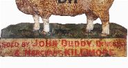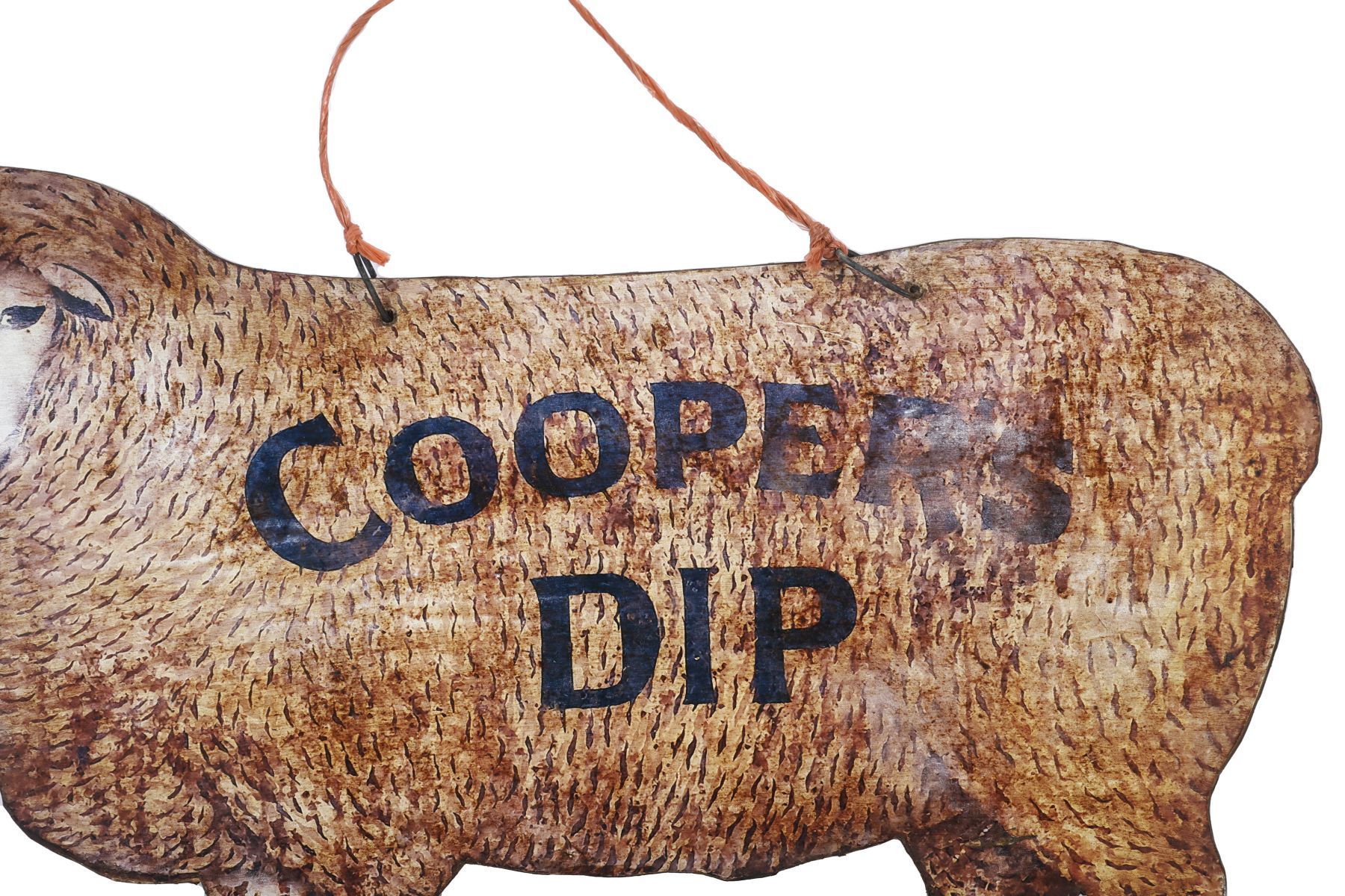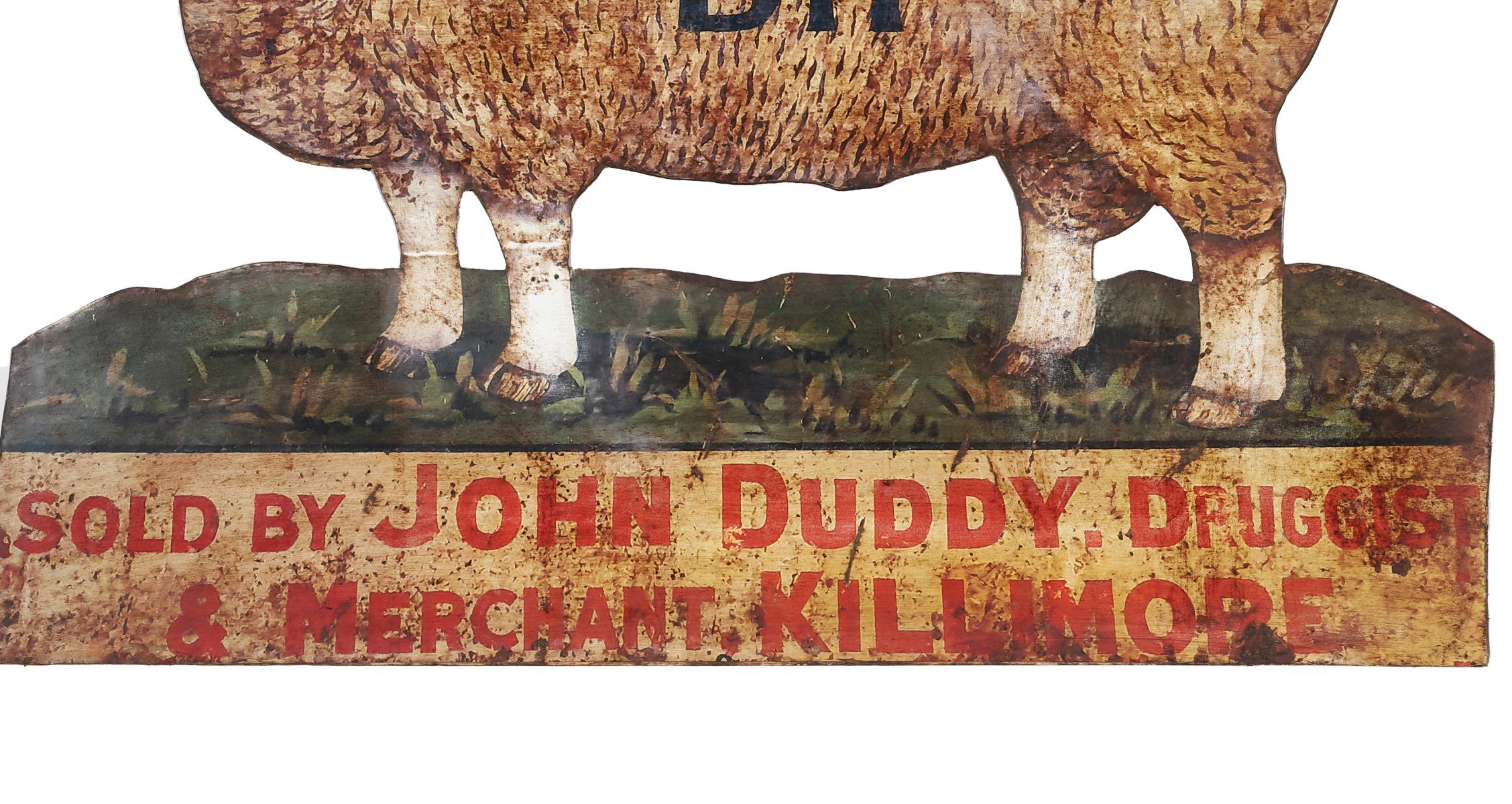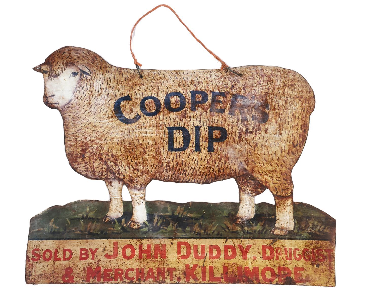An advertising cut-out sign in the form of a sheep for Cooper’s Dip, inscribed “Sold by John Duddy, Druggist & Merchant, Killimore”, with painted decoration and suspension cord.