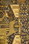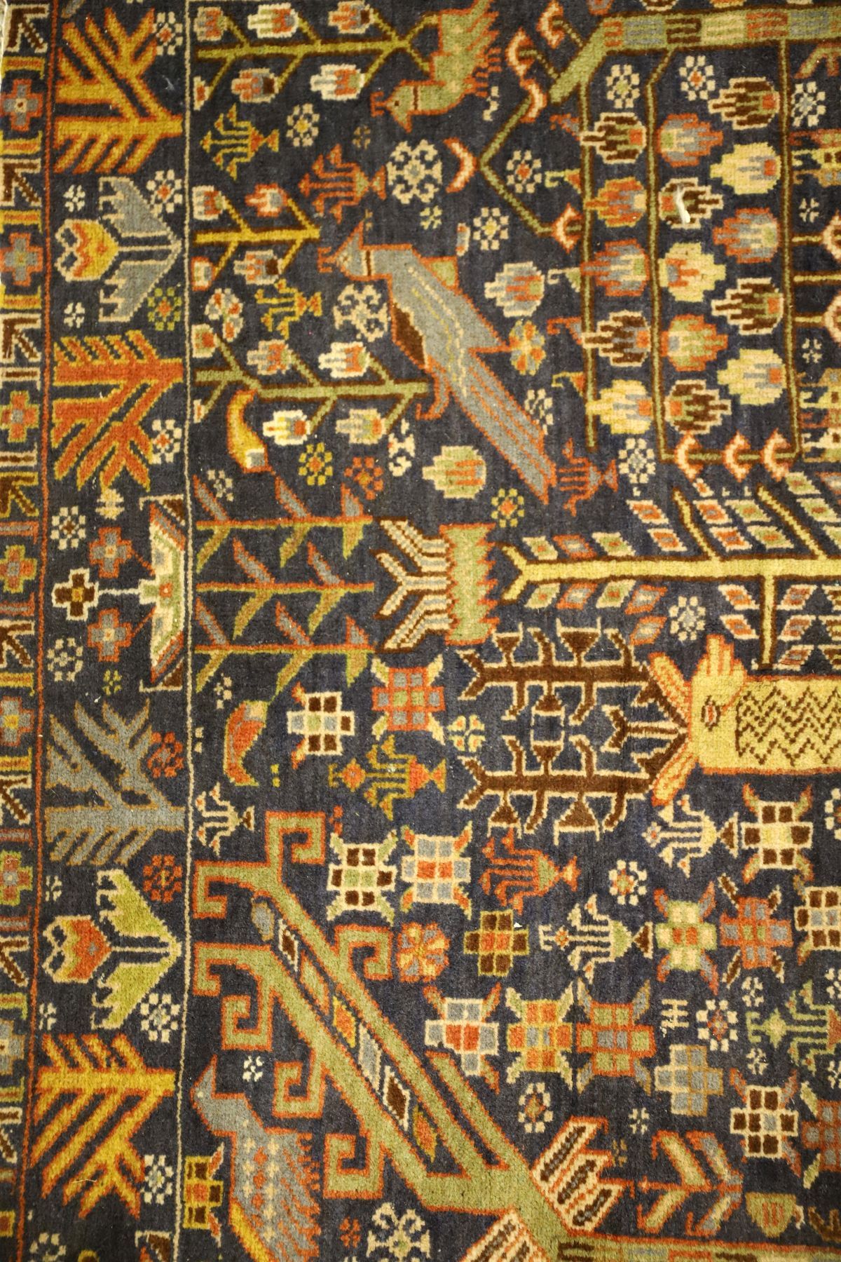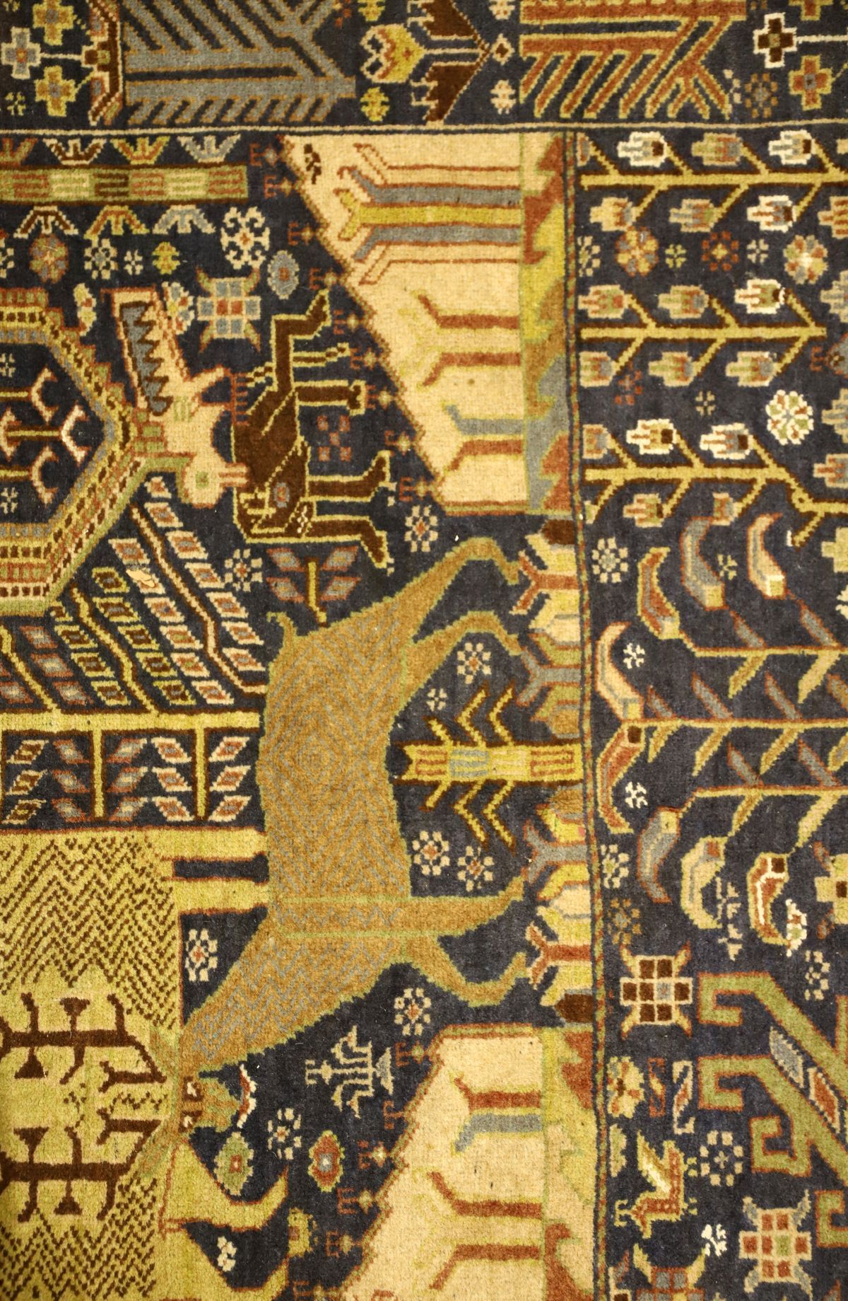 Blue ground with all-over animalia and abstract foliate decoration.