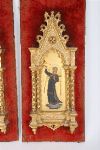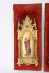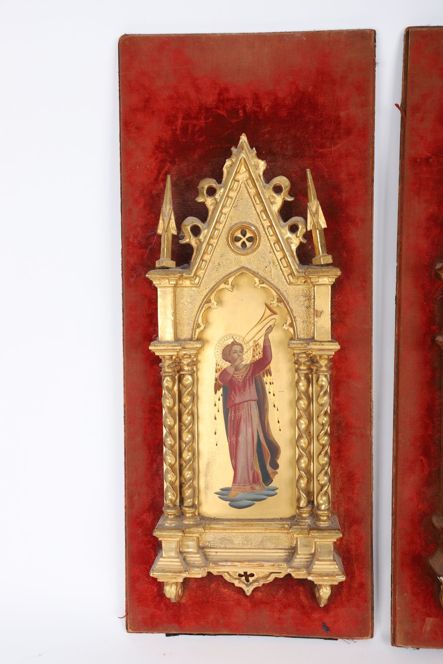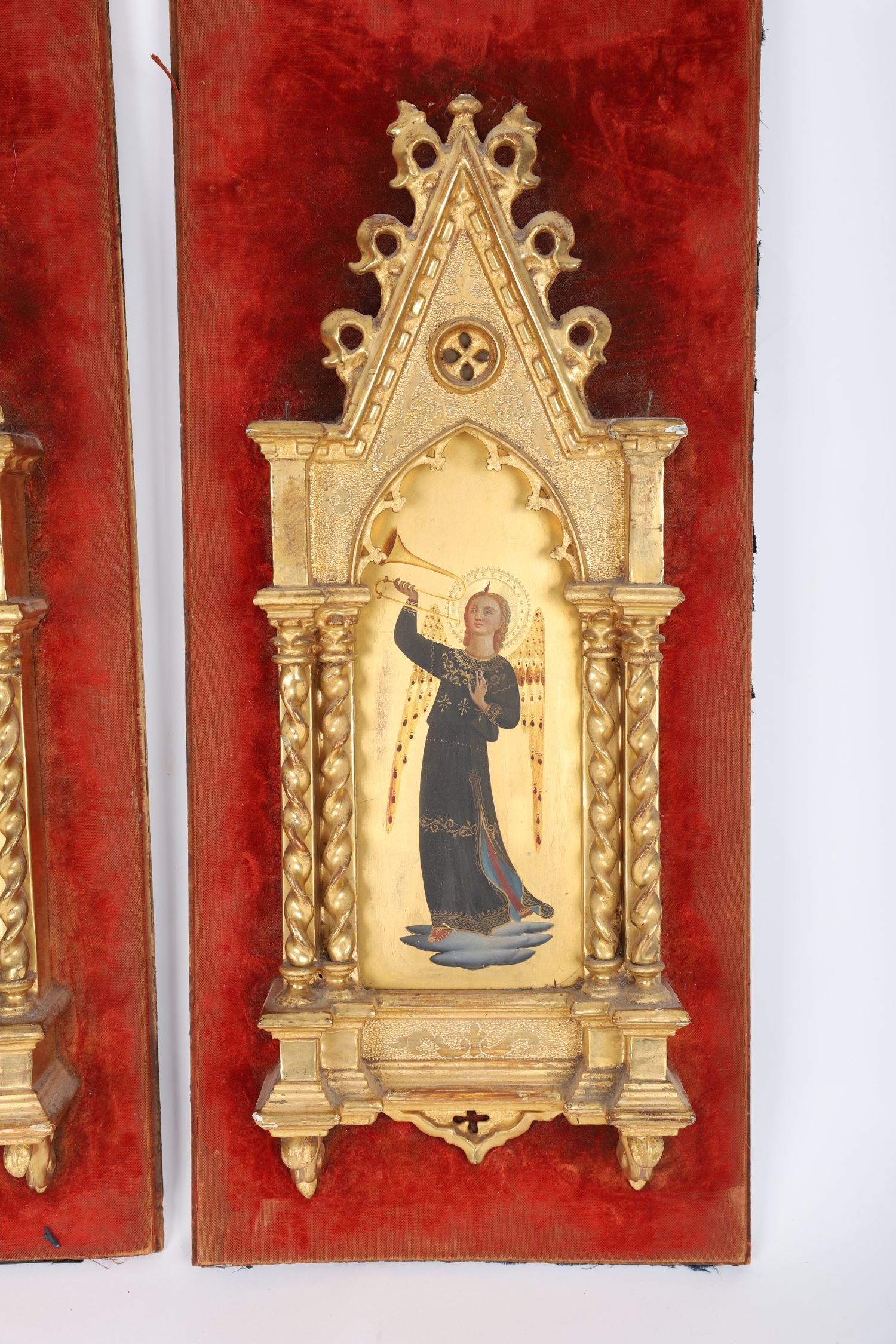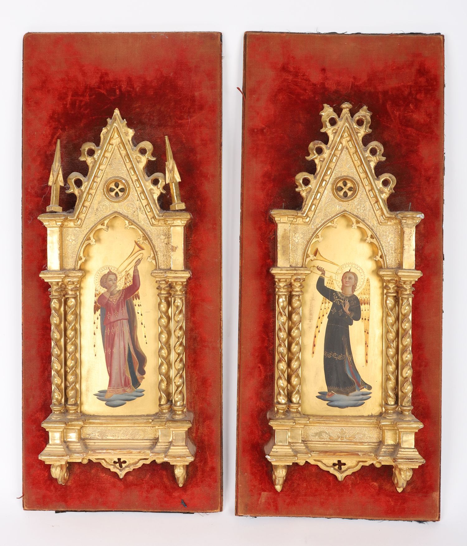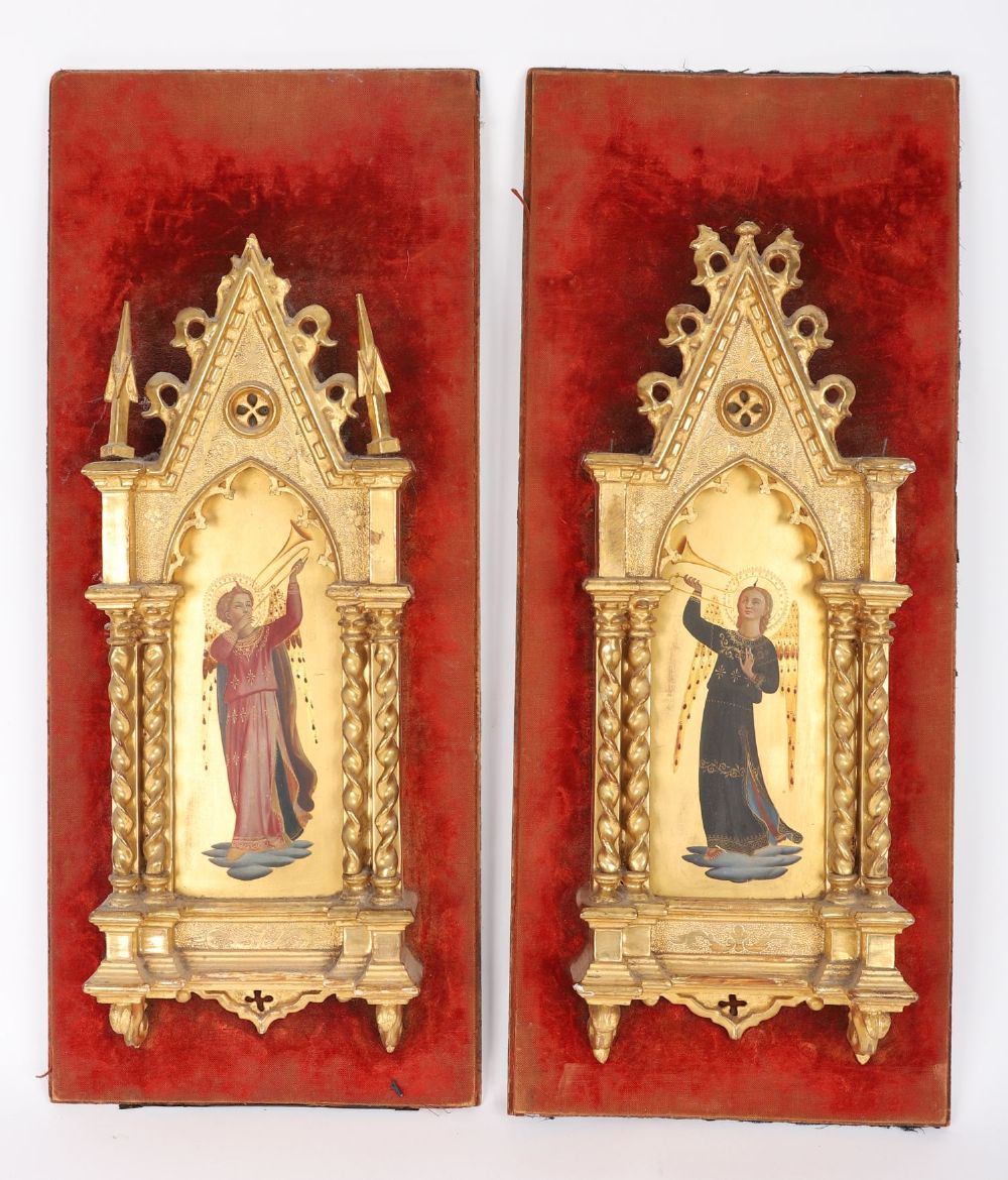 A pair of Italian devotional panels, 19th century. Each depicting a celestial angel in richly painted robes, sounding a trumpet against a ground of burnished gold. Housed in Gothic Revival gilt frames with twisted columns and pointed arches, these panels evoke the splendour of quattrocento Florence reimagined for a romantic age.