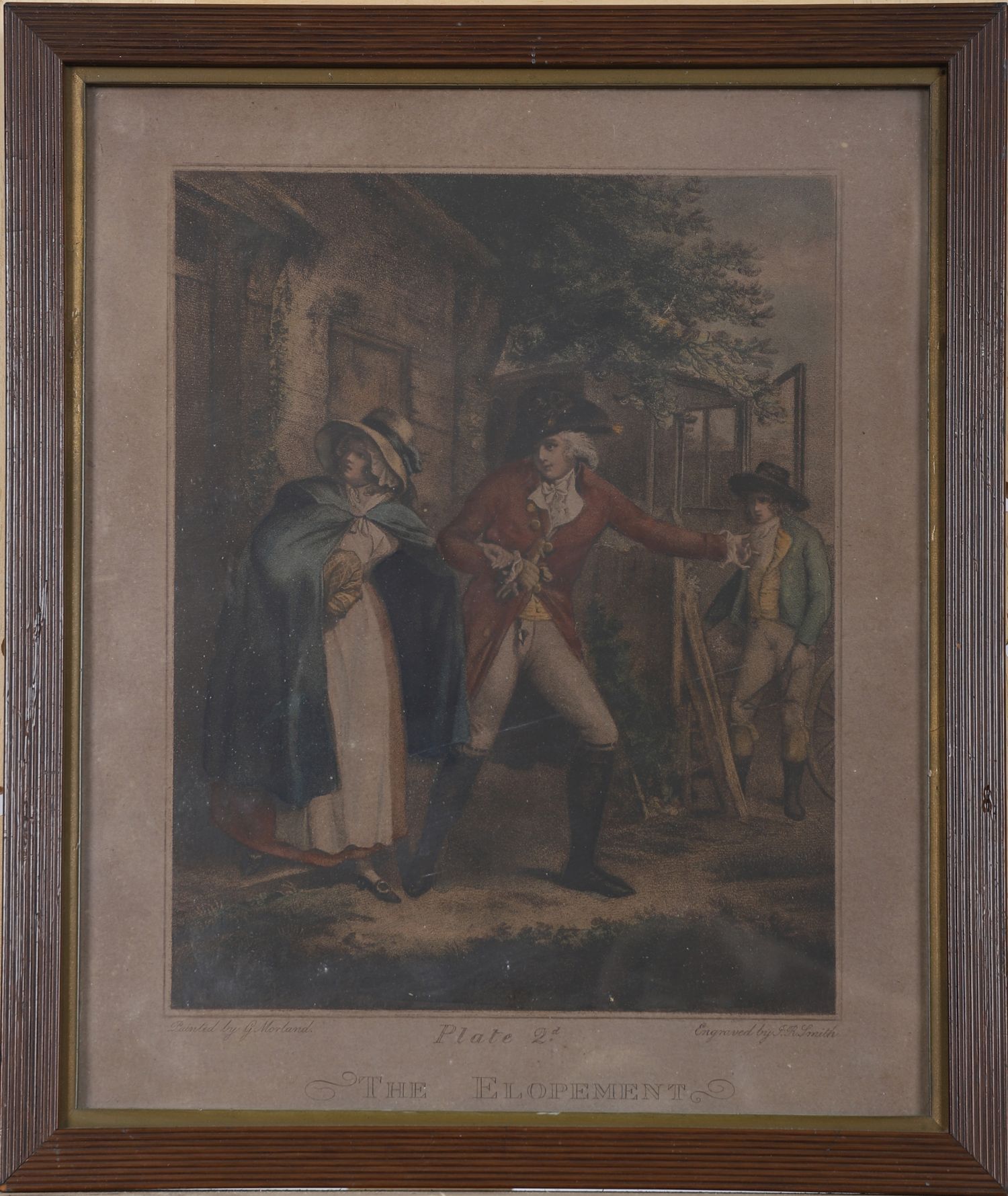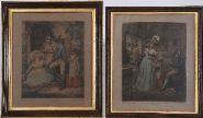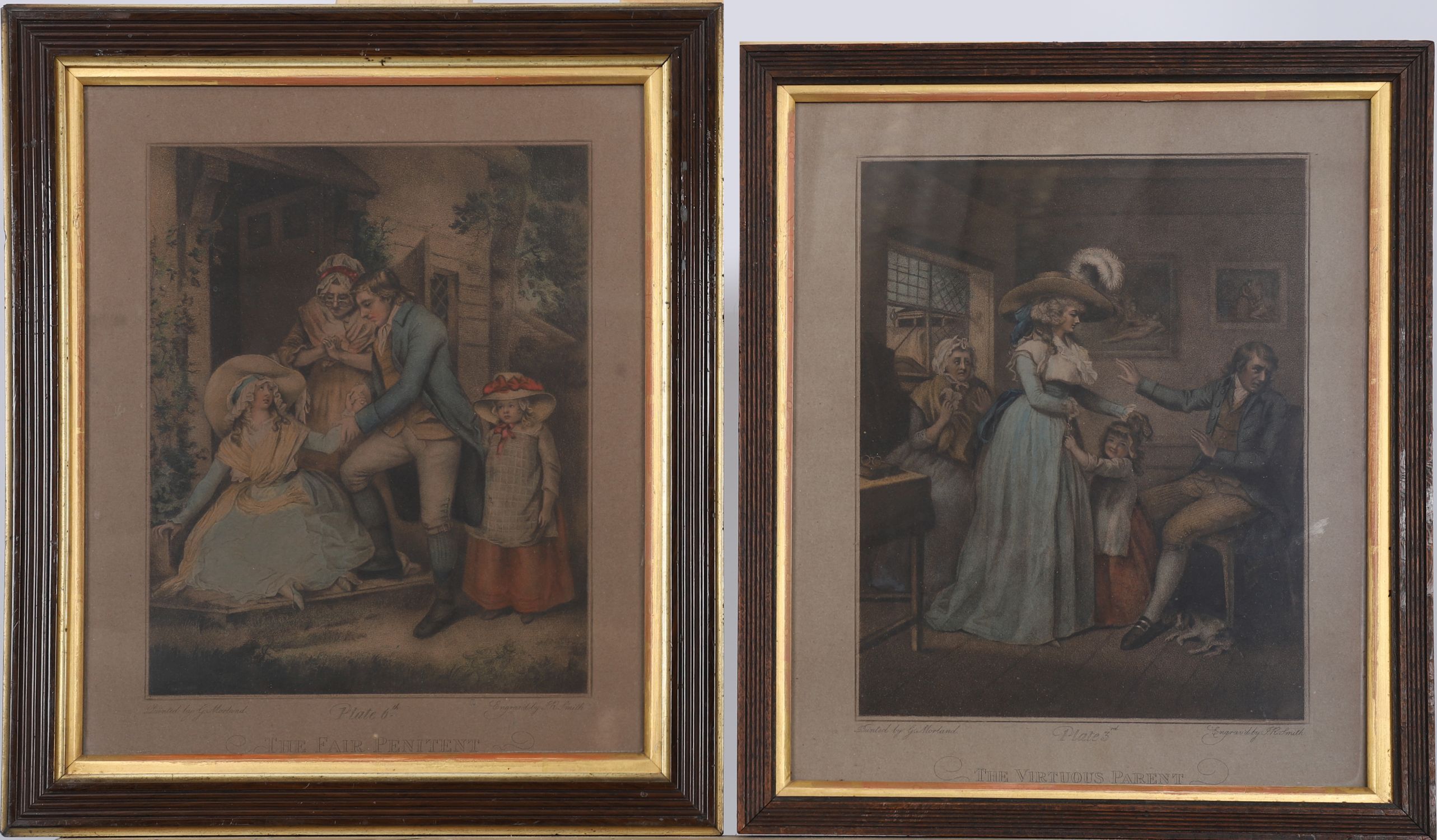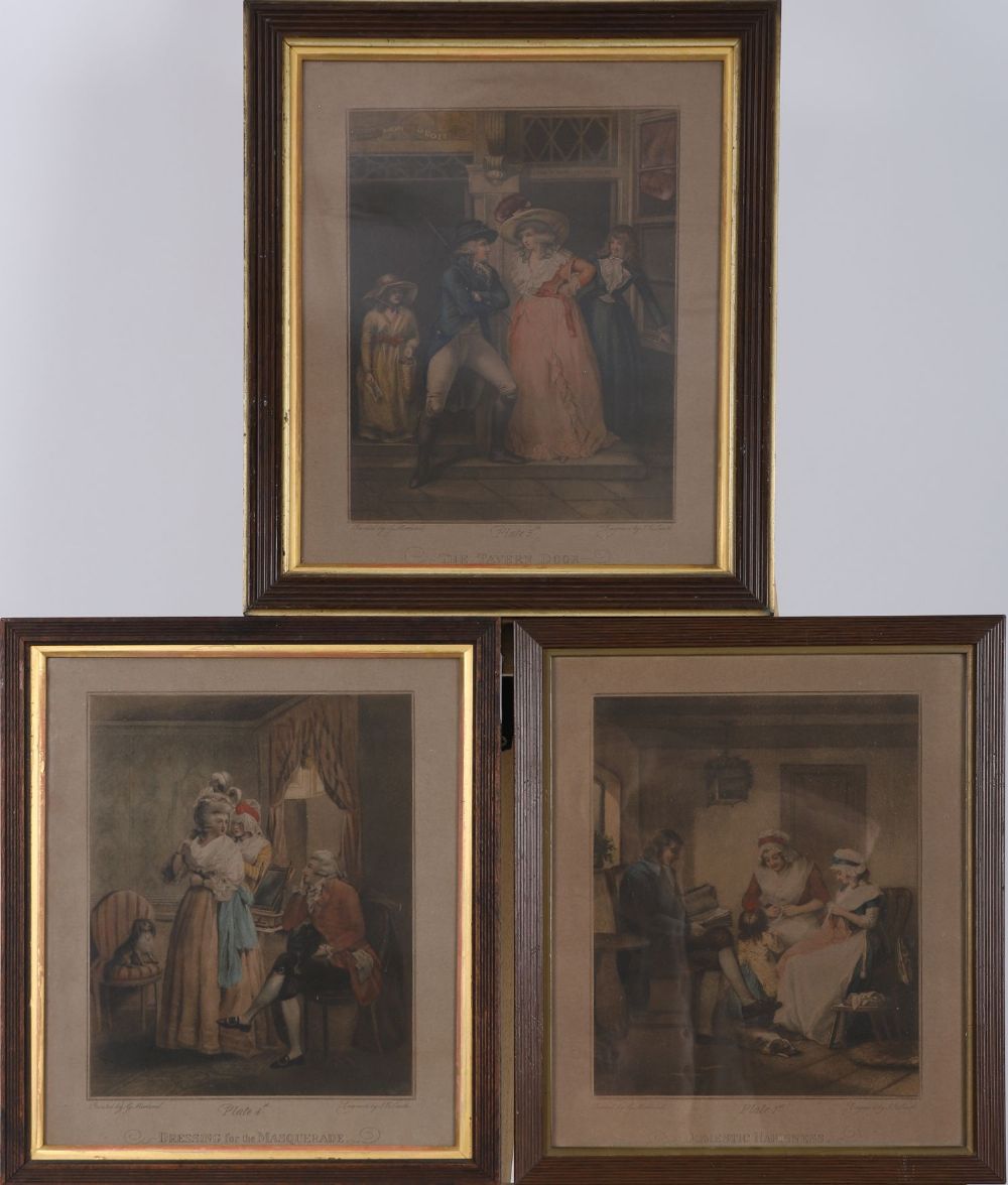 A set of six hand-coloured mezzotint engravings after George Morland, engraved by J. R. Smith, each titled and numbered: Domestic Happiness (Plate 1), The Elopement (Plate 2), The Virtuous Parent (Plate 3), Dressing for the Masquerade (Plate 4), The Tavern Door (Plate 5), and The Fair Penitent (Plate 6). Presented in matching glazed frames with gilt slips.