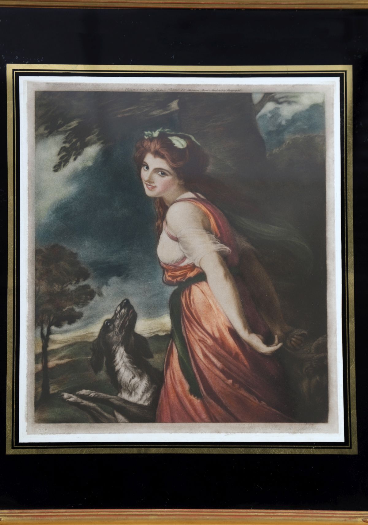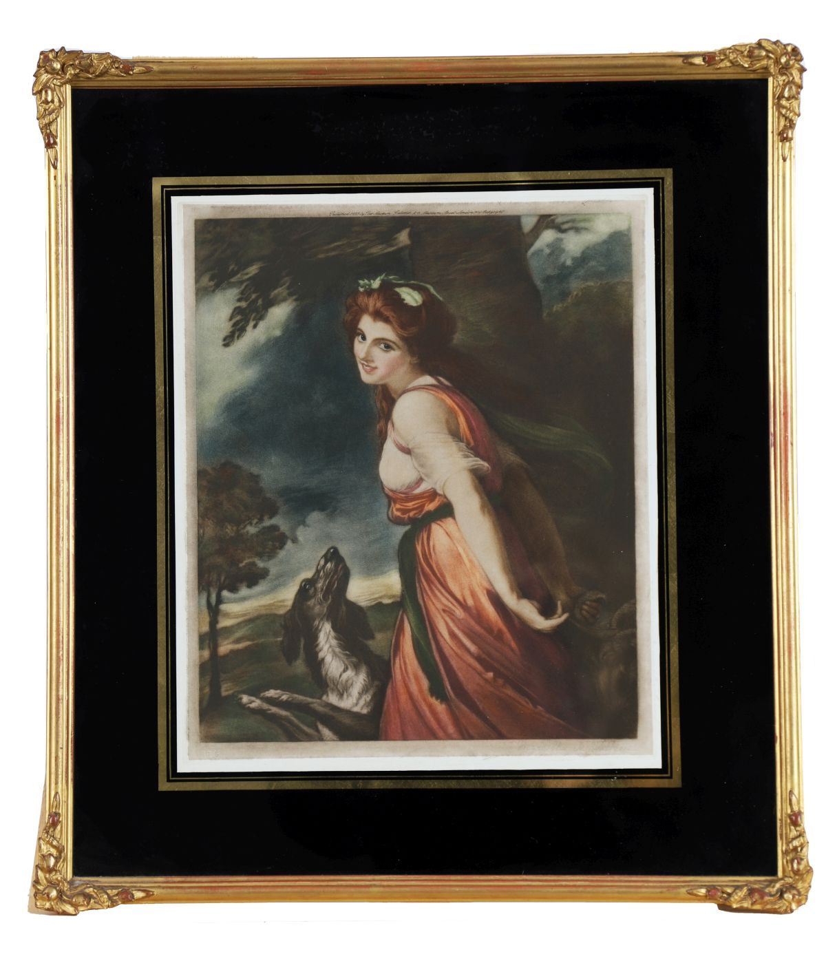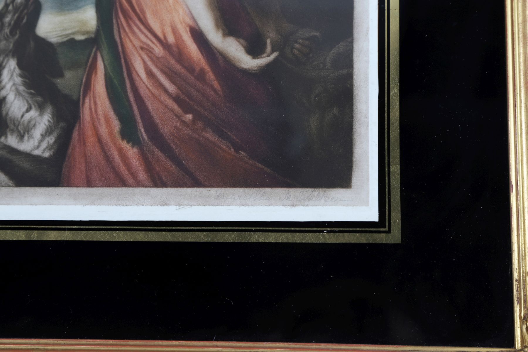 A coloured engraving enclosed in a verre églomisé border and gilt frame.